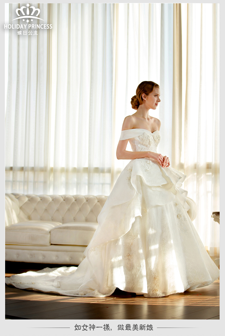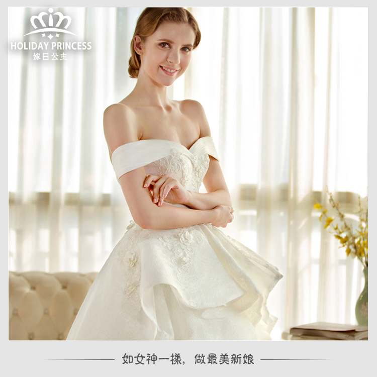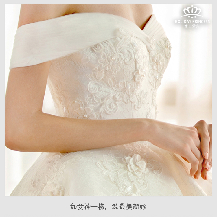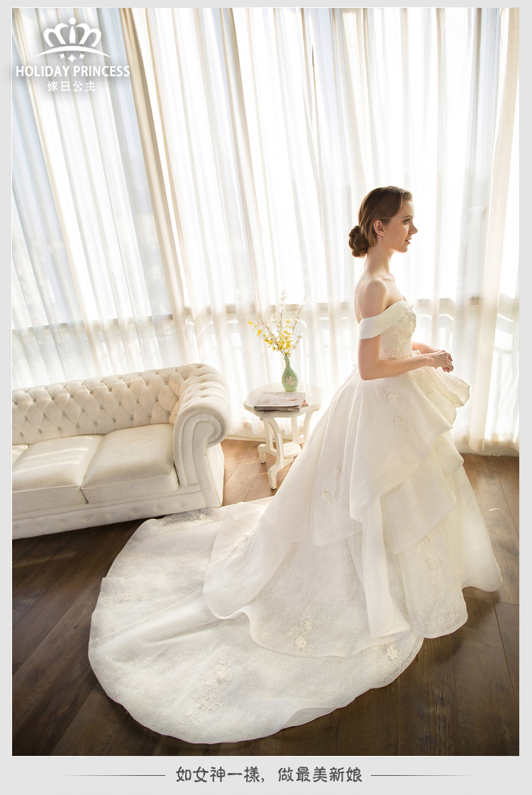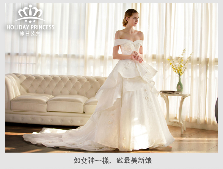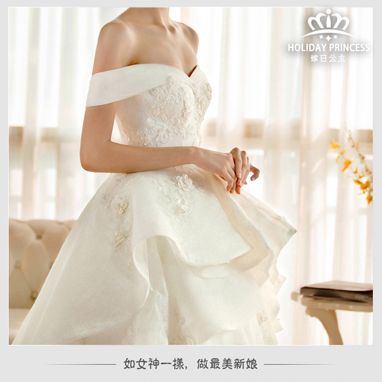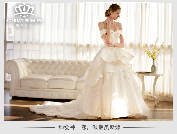 嫁日公主婚纱礼服 2016新款花瓣公主拖尾一字肩