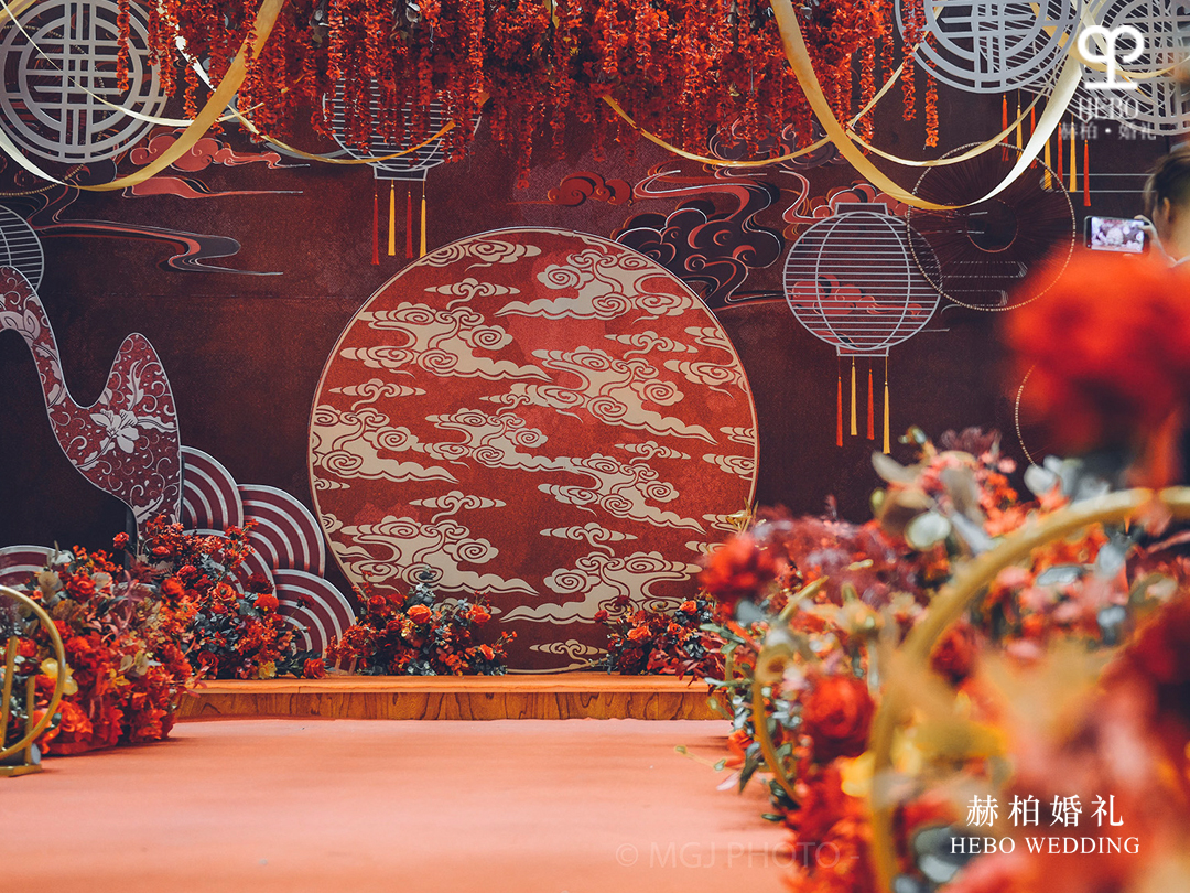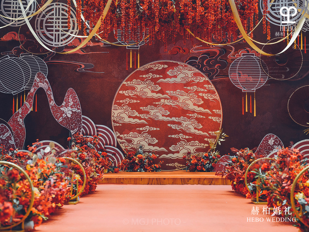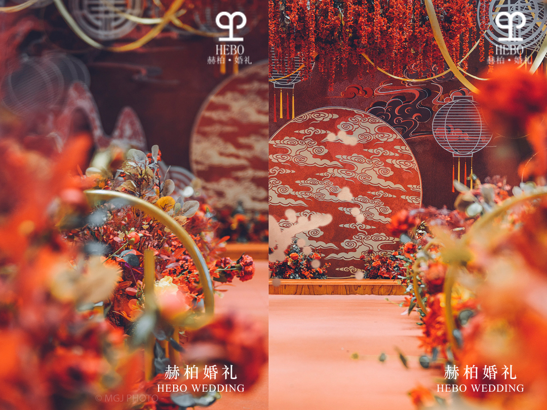 效果:由红色地毯打底封闭包装,两侧使用高挑花艺作为装饰