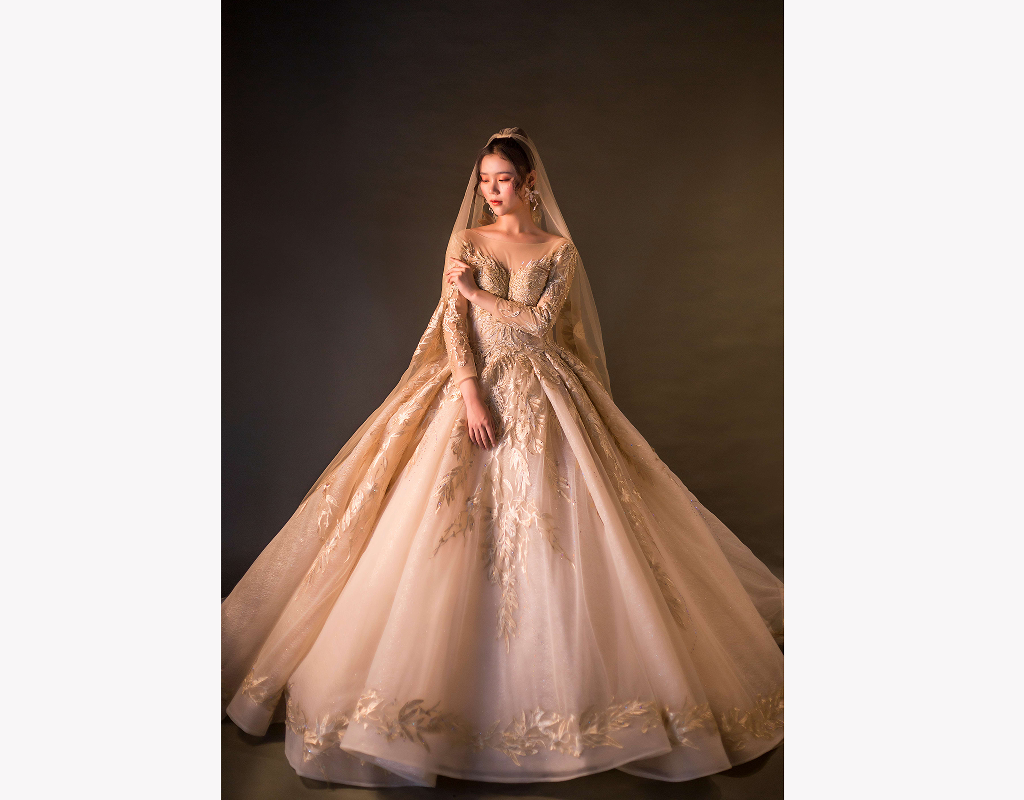 高定品牌香槟色仪式拖尾婚纱纯手工制作,重手工打造。