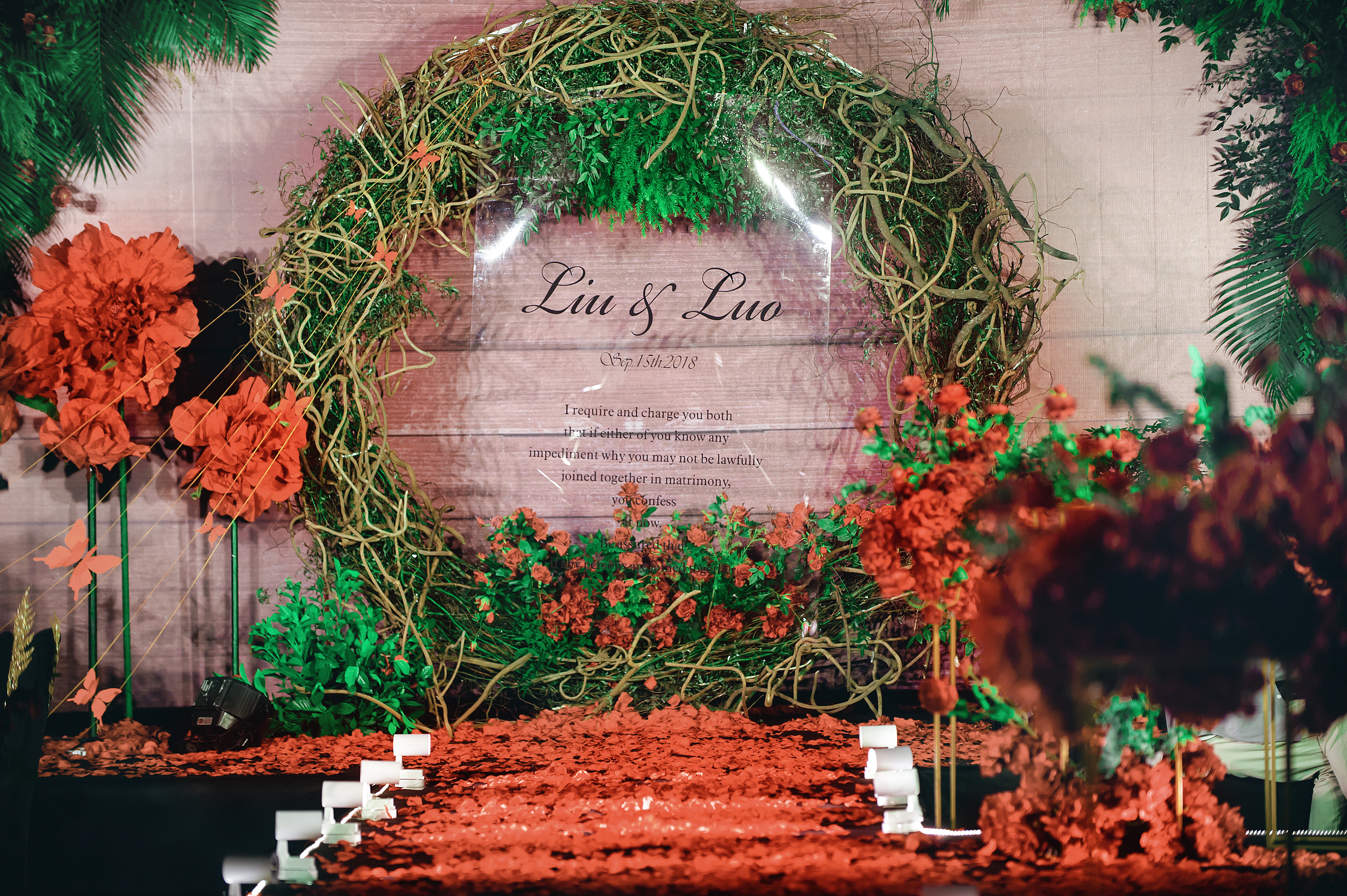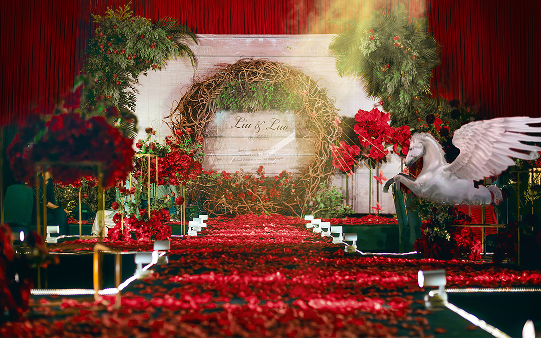 经典帷幔背景 精美欧式帷幔,采用不锈钢伸缩纱幔架搭建,常规色系可选,并可根据色系搭配常规绢花花球,花环,花排或原木构架 舞台前景花艺道具 根据策划师方案单层装饰,各种材料和花艺组合方式可选。配合对称花艺组合,增加舞台的整体层次感 定制LOGO设计 可根据新人的名字或婚礼主题来定制设计 T型台搭建 木质钢架结构T型台,采用全新地毯包裹裸露表面,完善细节装饰。 经典交接区 花艺花器多层次主题道具装饰组,花亭可选白色或粉色,可渲染颜色,暗场效果极佳 仪式区装饰灯 通道射灯,提升通道质感 主背景星星灯,增强舞台层次感,使舞台更加灵动 交接区装饰灯(多款选择),配合花艺提升仪式感 精致花艺路引