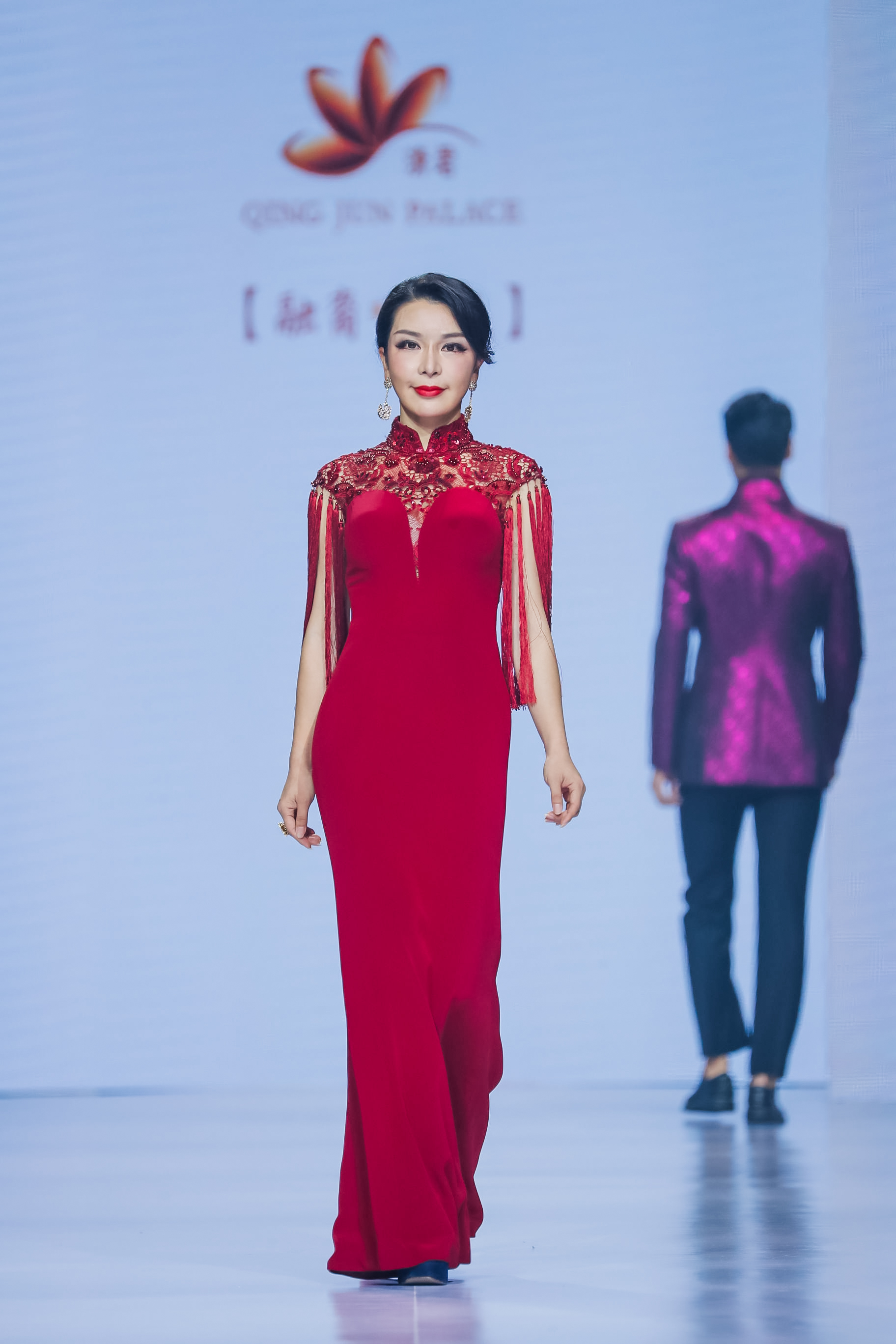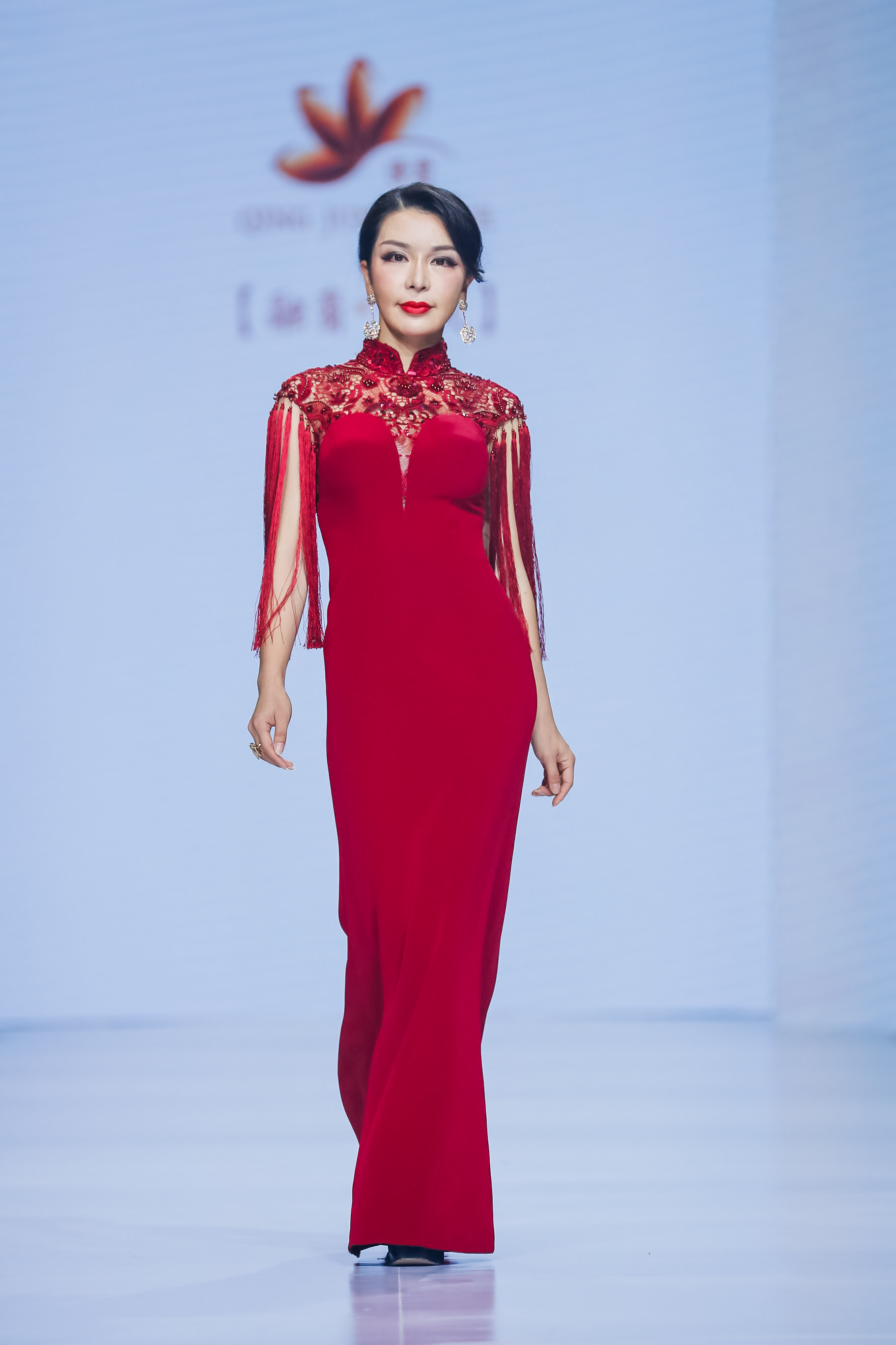 修身改良式旗袍 礼服,肩部用蕾丝若隐若现,用流苏元素灵感来源传统服饰中的云披,加入手工钉珠装饰,让礼服更显隆重华丽。