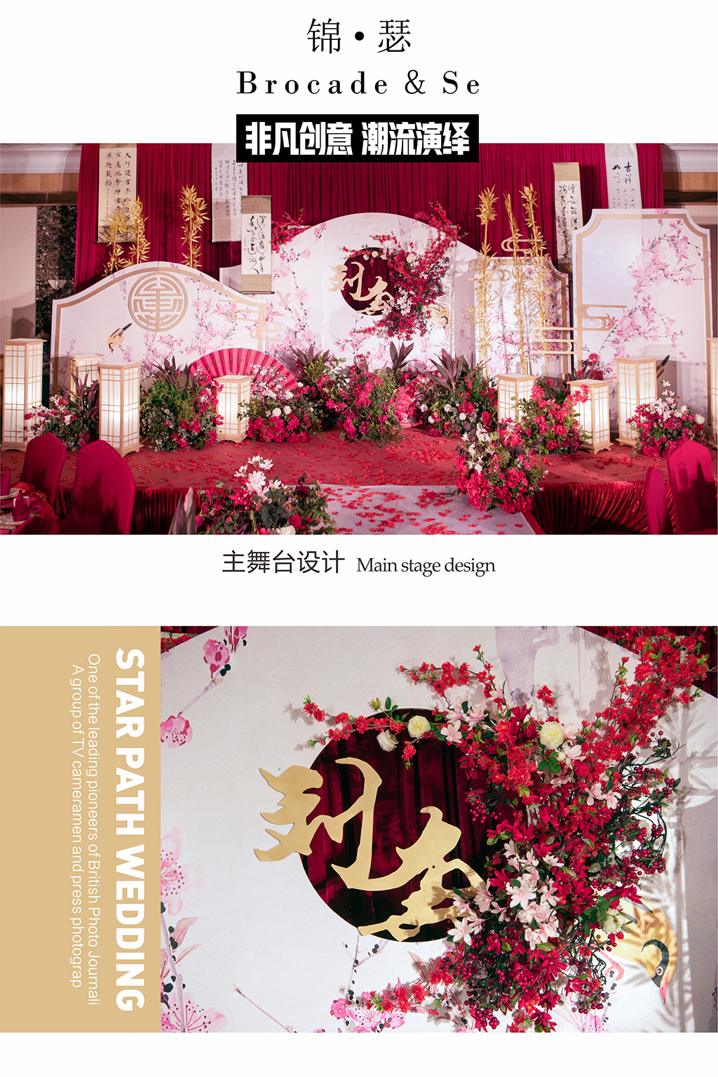 经典帷幔背景 精美欧式帷幔,采用不锈钢伸缩纱幔架搭建,常规色系可选,并可根据色系搭配常规绢花花球,花环,花排或原木构架 舞台前景花艺道具 根据策划师方案单层装饰,各种材料和花艺组合方式可选。配合对称花艺组合,增加舞台的整体层次感 定制LOGO设计 可根据新人的名字或婚礼主题来定制设计 T型台搭建 木质钢架结构T型台,采用全新地毯包裹裸露表面,完善细节装饰。 经典交接区 花艺花器多层次主题道具装饰组,花亭可选白色或粉色,可渲染颜色,暗场效果极佳 仪式区装饰灯 通道射灯,提升通道质感 主背景星星灯,增强舞台层次感,使舞台更加灵动 交接区装饰灯(多款选择),配合花艺提升仪式感 精致花艺路引