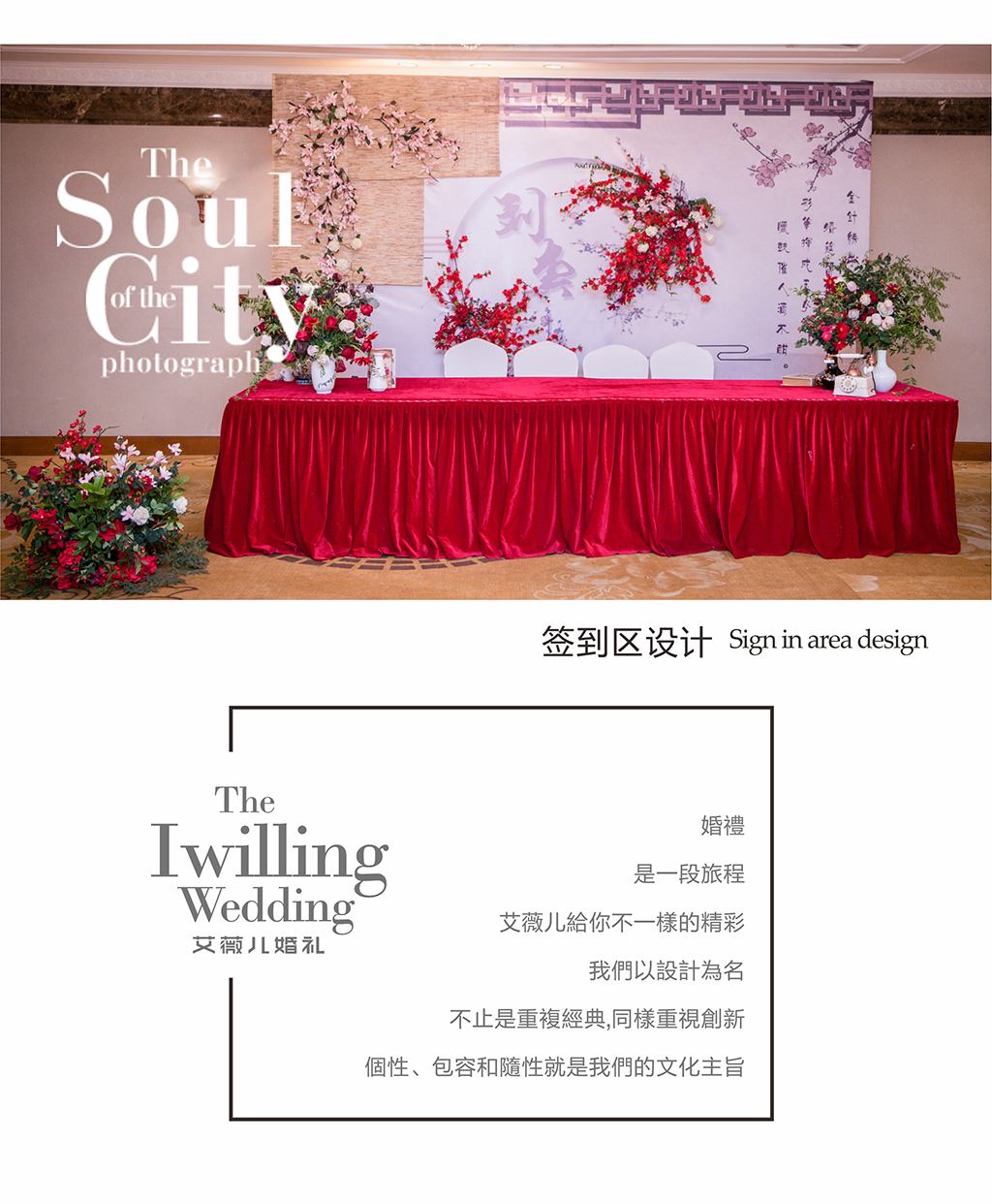 迎宾大海报 用于户外迎宾使用新人提供婚纱照图片 签到台花 在签到台放置的鲜花和仿真组合的花艺,增加签到台与婚礼主题的整体性,使签到台显得更加别致 签到台细节装饰 展现的主题根据婚礼的整体风格及色彩搭配,对签到台进行精美的细节装饰突出 签到台桌幔装饰 根据婚礼整体风格以色彩搭配 签到区指引水牌 根据婚礼整体风格,主题或行人提供的婚纱图片专属设计 主题签到帷幔背景 用于签到背景,采用不锈钢伸缩纱幔架搭建 精致多层次帷幔装饰背景 精美帷幔,采用不锈钢伸缩帷幔架搭建 合影区主题装饰道具 主题花艺造型,配合主题道具增添了浪漫的质感