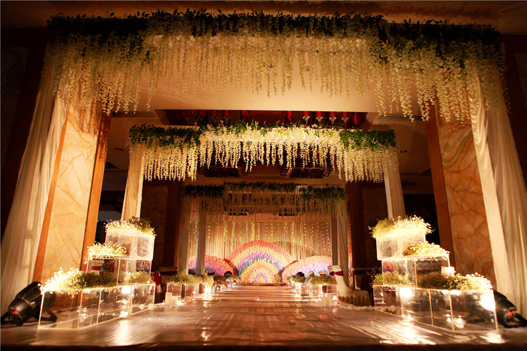通道区利用酒店现场硬件条件,搭建四维门字架,装饰白绿色仿真紫藤花。对酒店宴会大厅墙顶进行花艺吊顶搭建装饰;增加视觉大气感,看似简约大