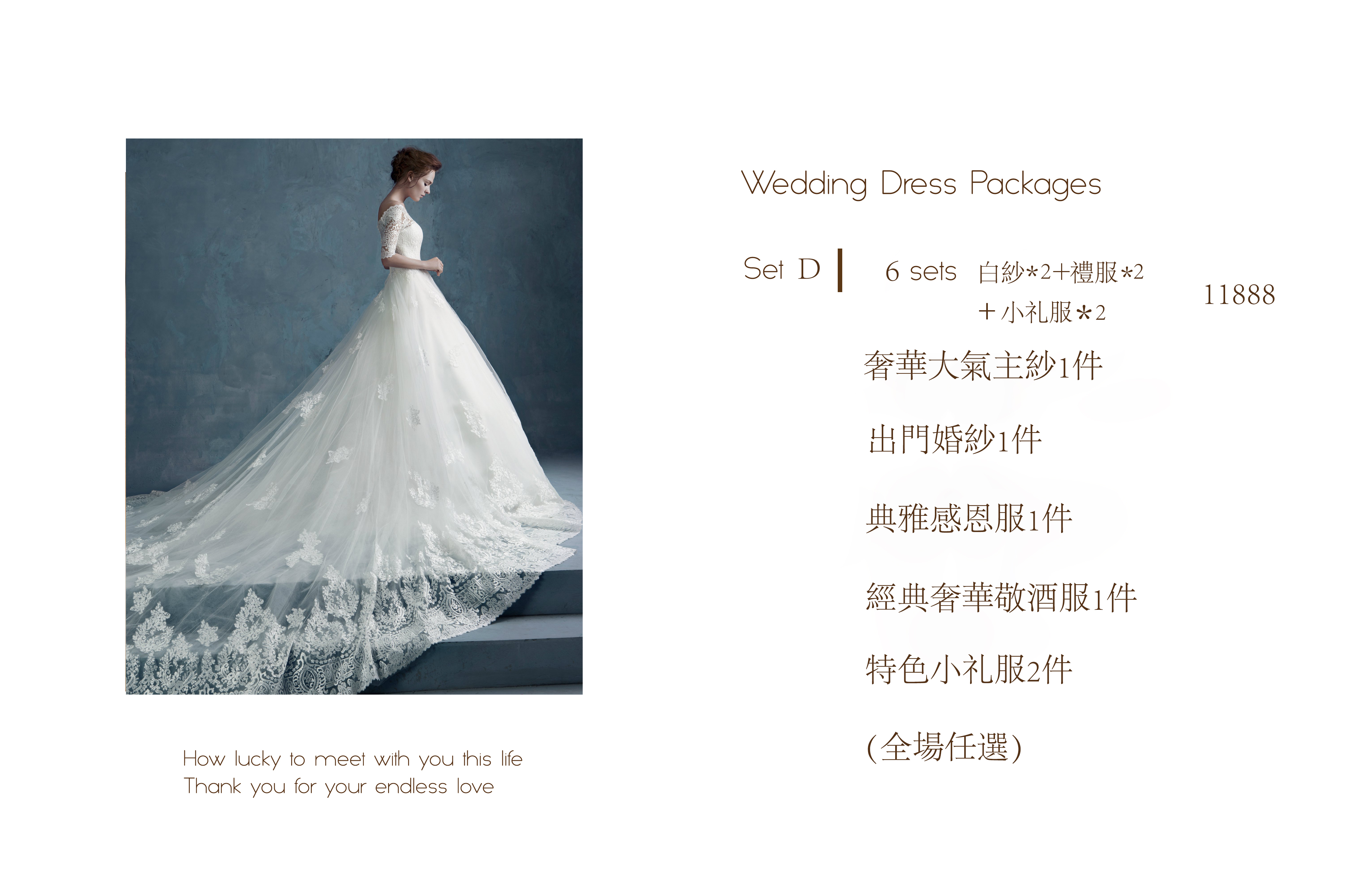—奢華大氣主婚紗一件 —精品出門紗一件 —典雅感恩禮服一件 —經典奢華敬酒服一件 —特色小禮服兩件 (全場任選)