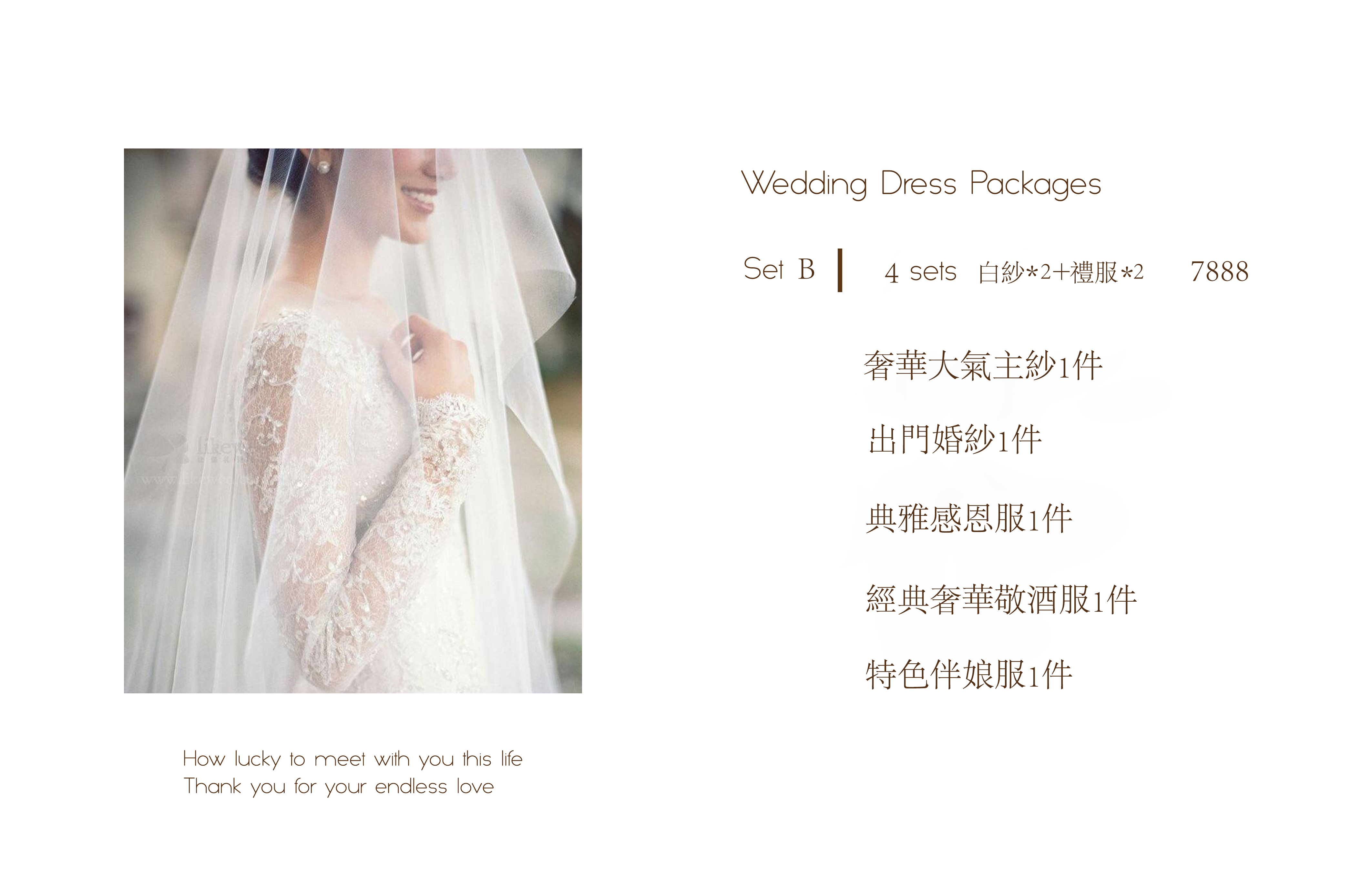 —奢華大氣主婚紗一件 —精品出門紗一件 —典雅感恩禮服一件 —經典奢華敬酒服一件 —特色伴娘服一件