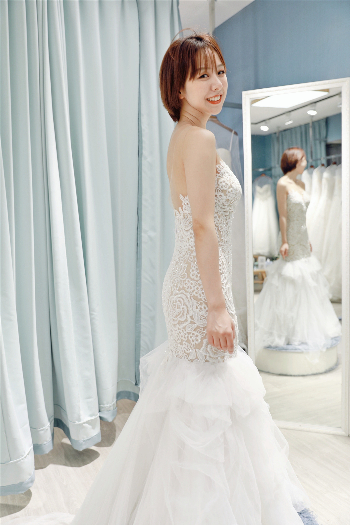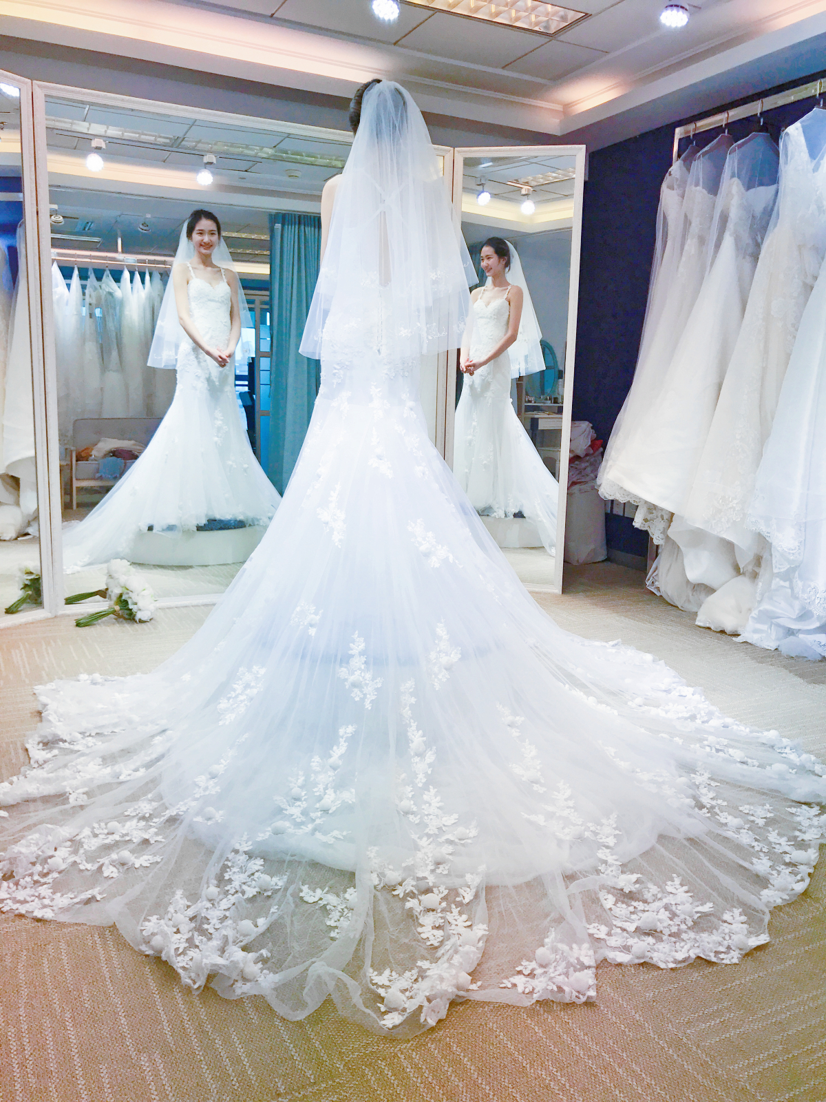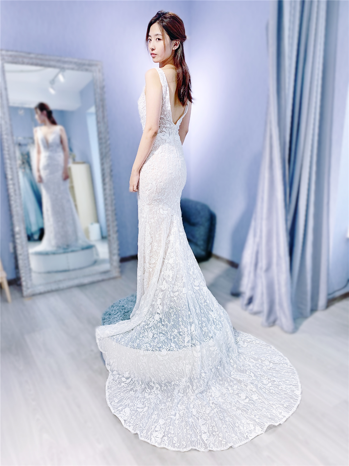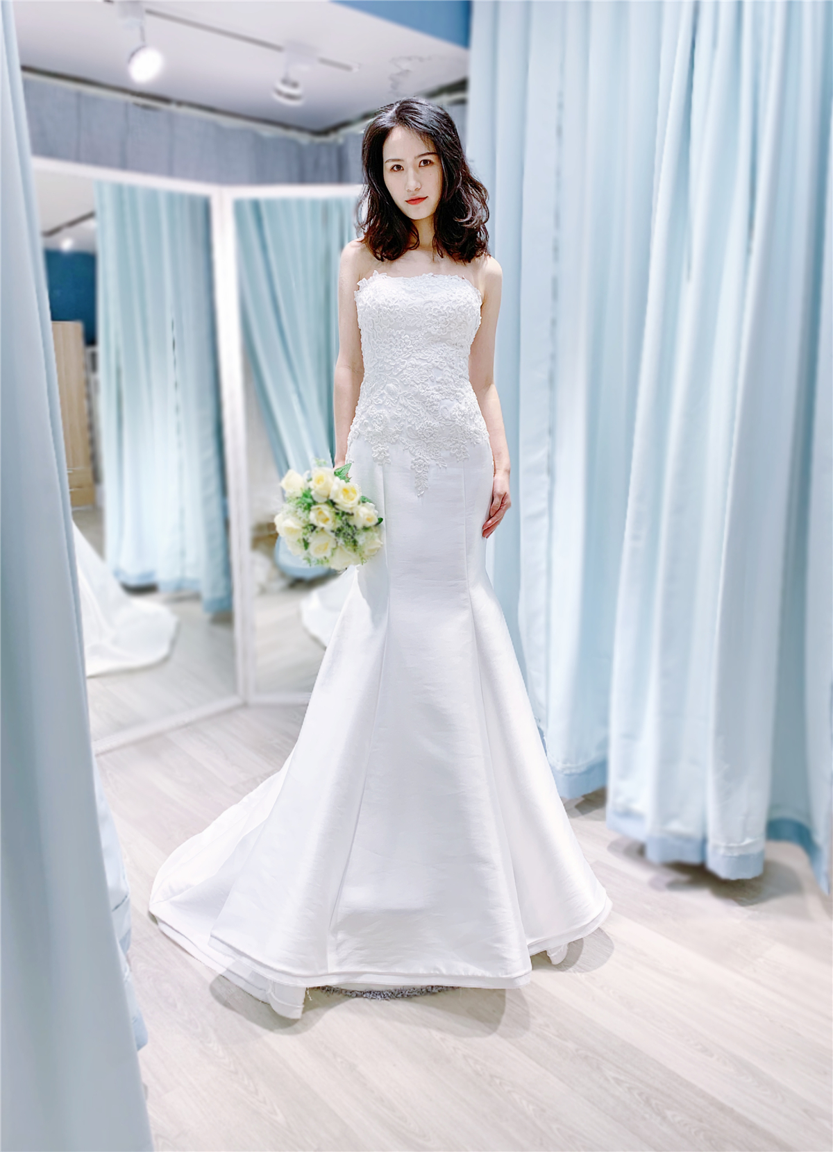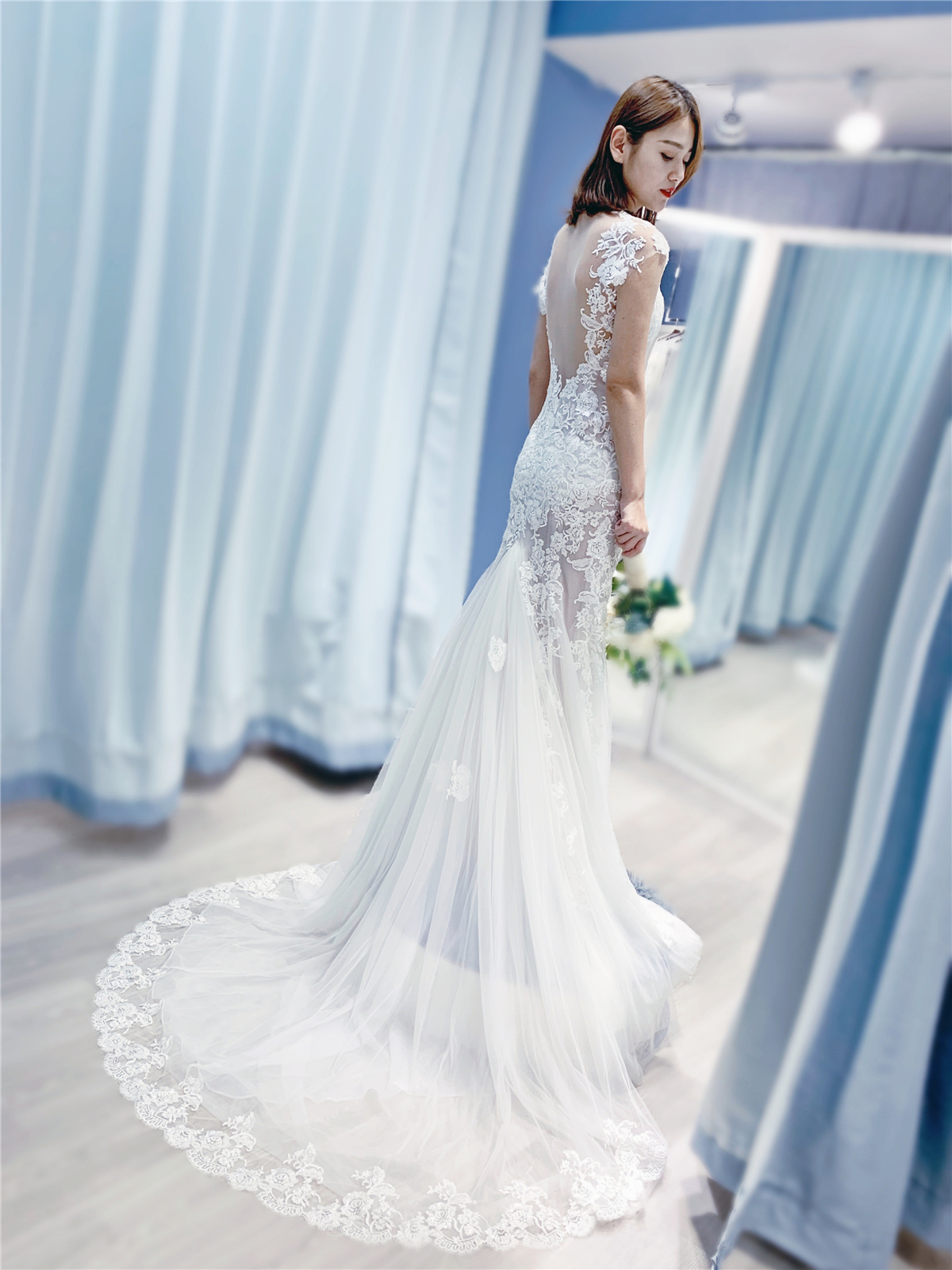 试纱请提前预约。我们将为每位新娘保留3小时的独立试衣间。