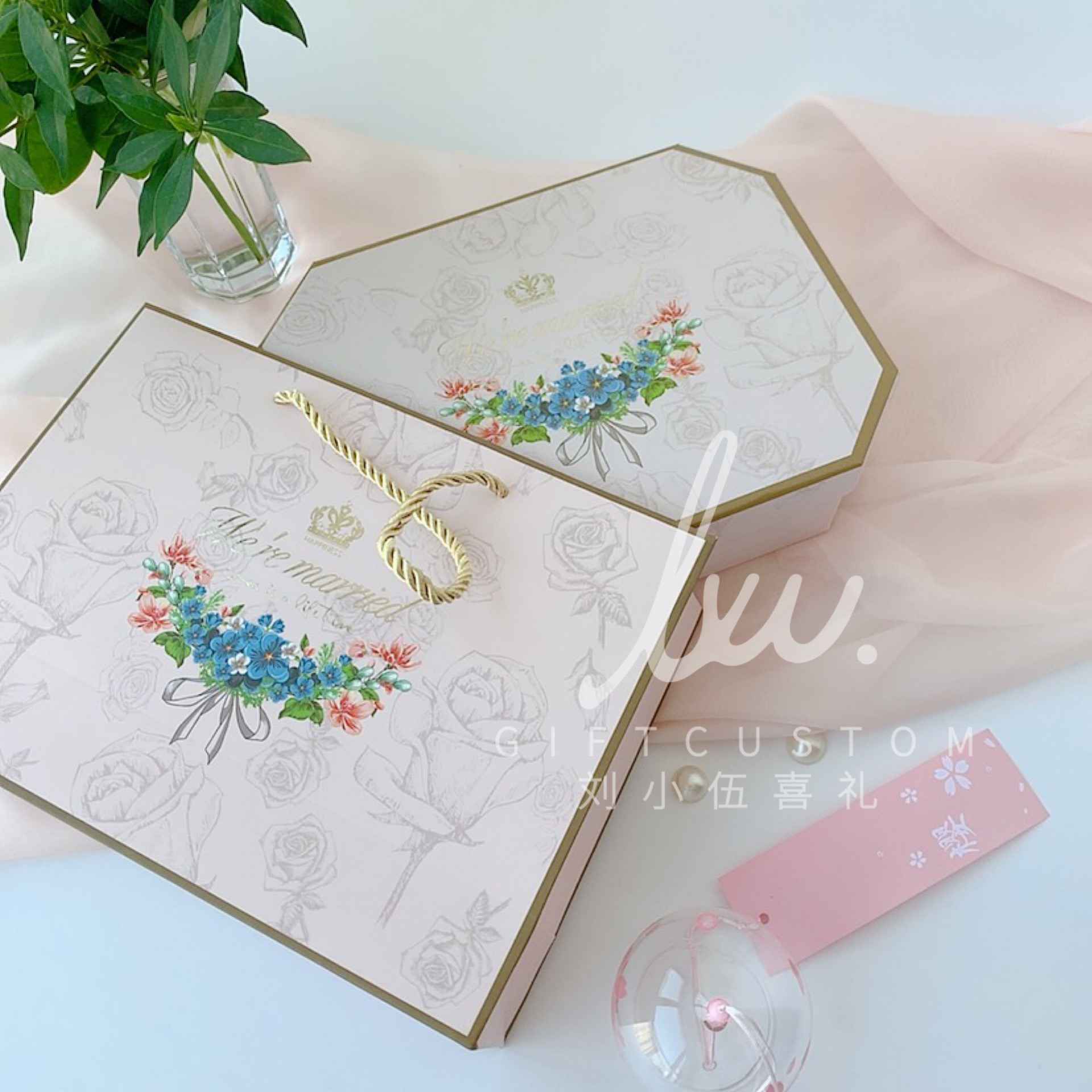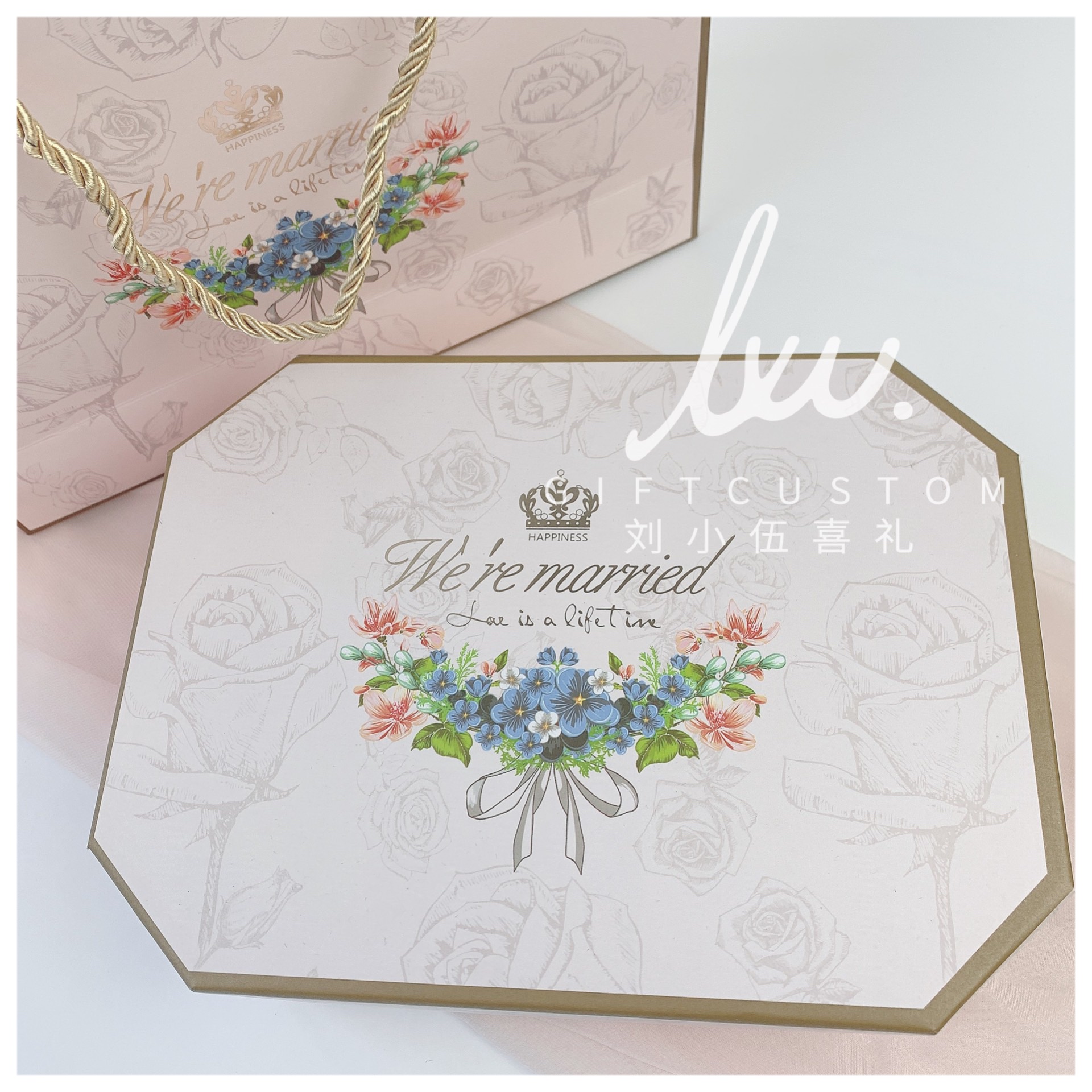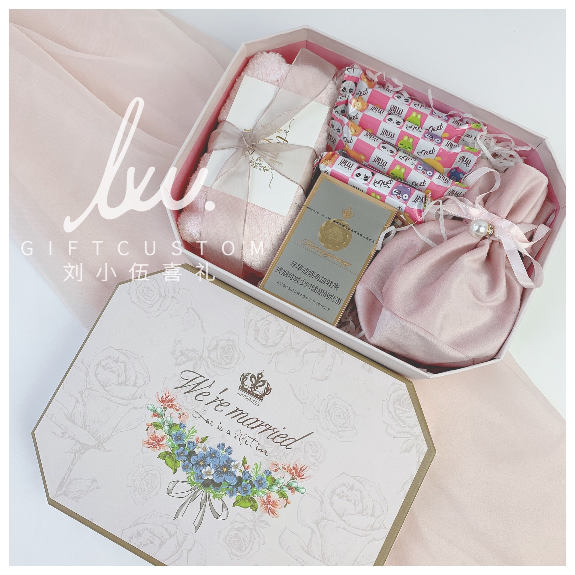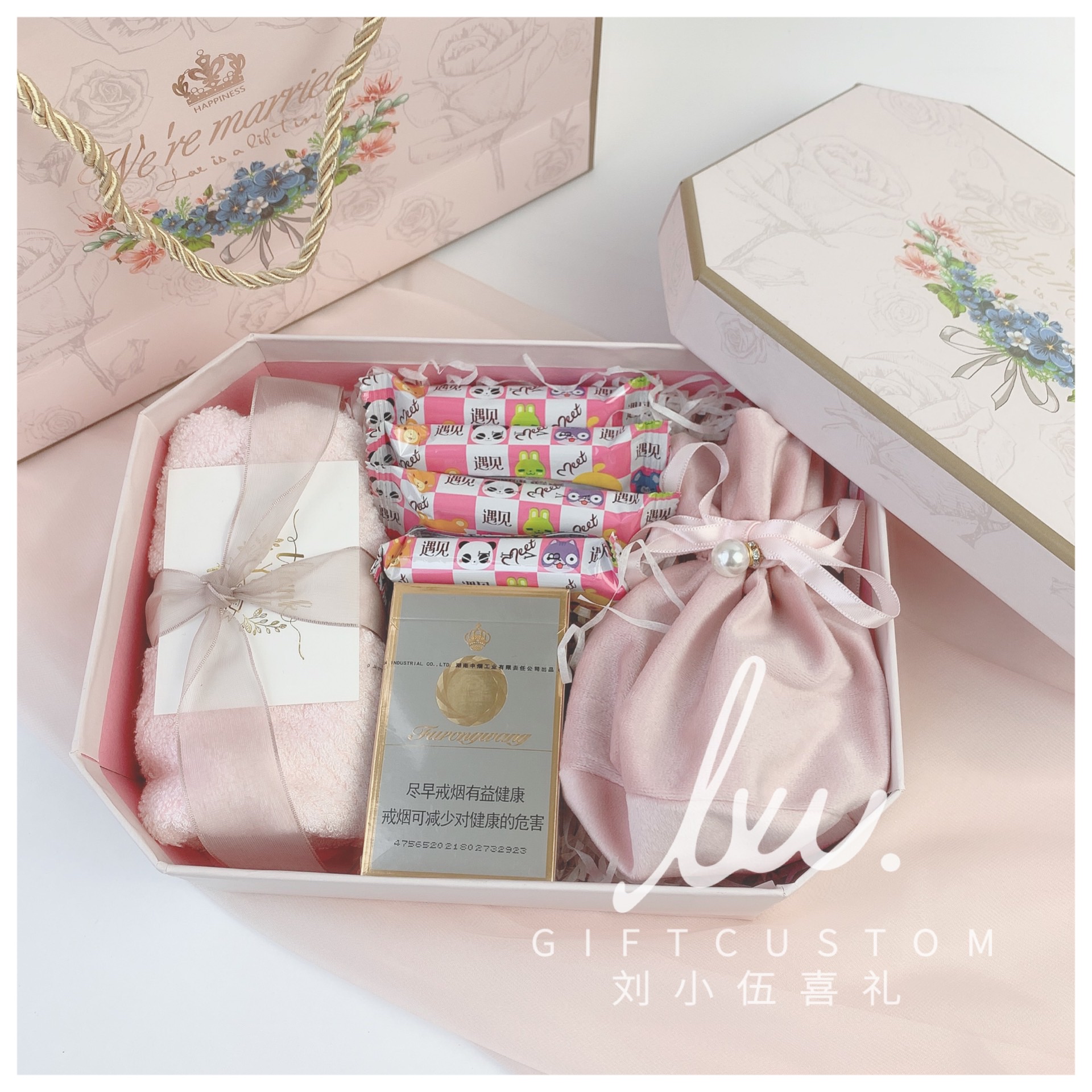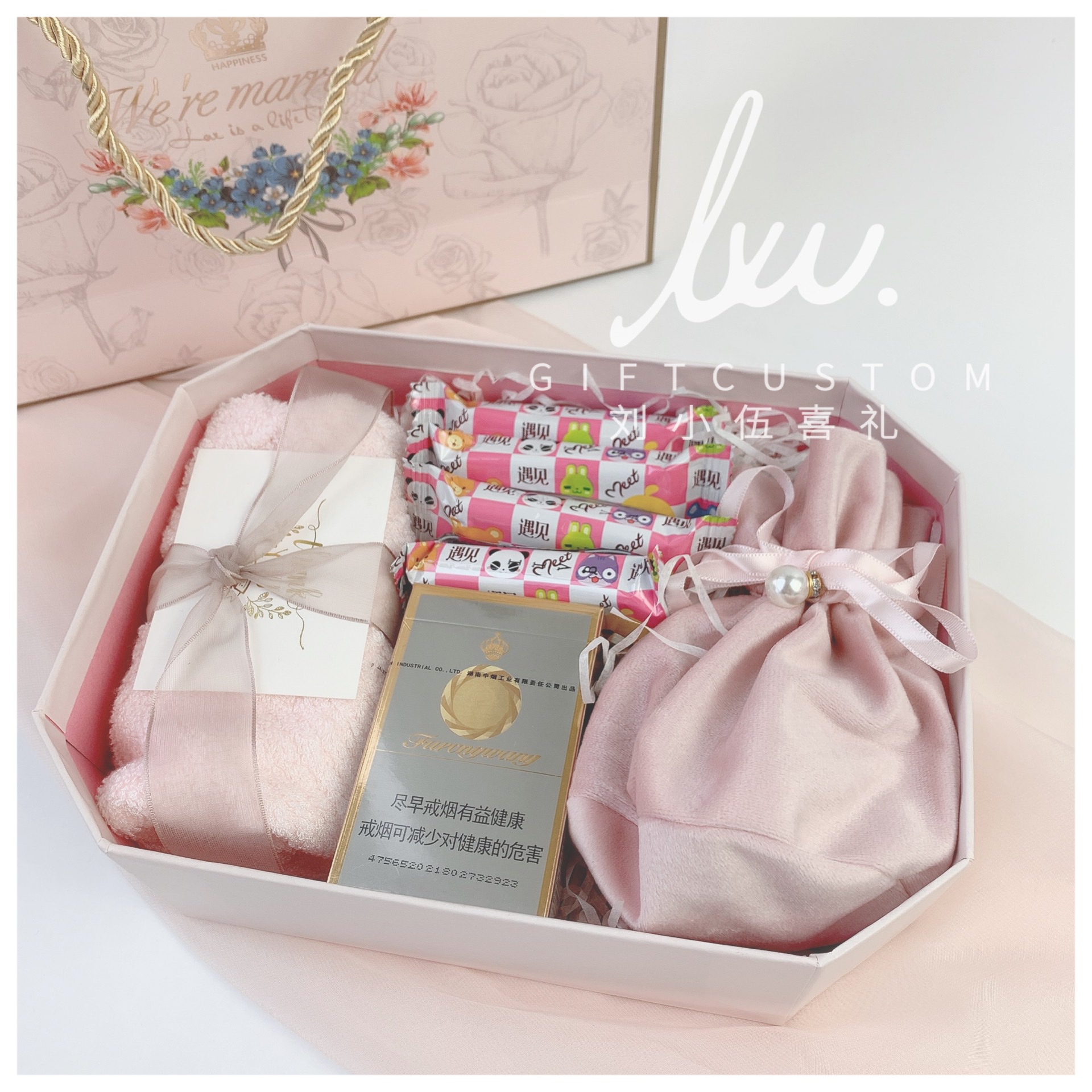 唯美浪漫粉色伴手礼回礼结婚绒布袋喜蜜进口喜饼