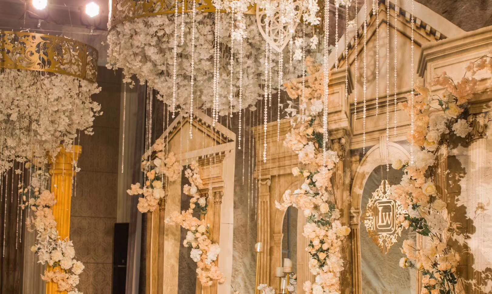 拥有一双蓝色眼睛的凯萨琳公主,银制茶壶,白色蜡烛,藤蔓植物,水晶球和魔法女巫。古铜金色的复古,鎏金碧瓦的奢华,大朵绽放的玫瑰,马上要走进幸福殿堂的王子和公主,欧洲优雅而华丽的世家贵族……复古金色的高定城堡泡雕,欧式环绕型花台,大串的水晶和钻石……为您打造一座专属的爱情城堡。