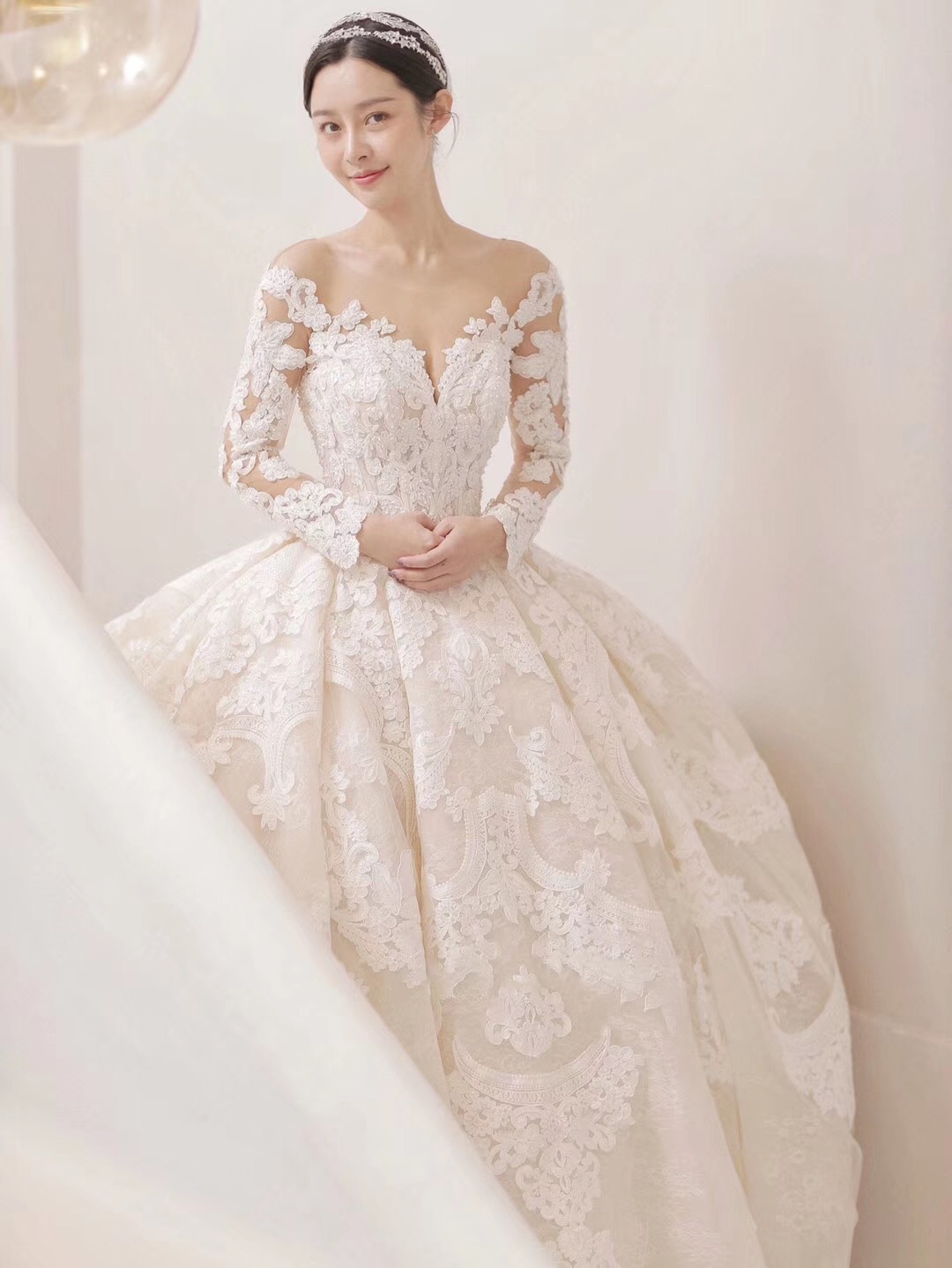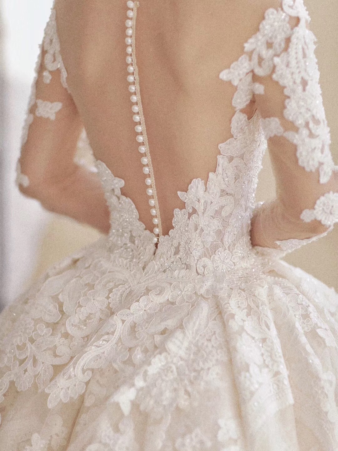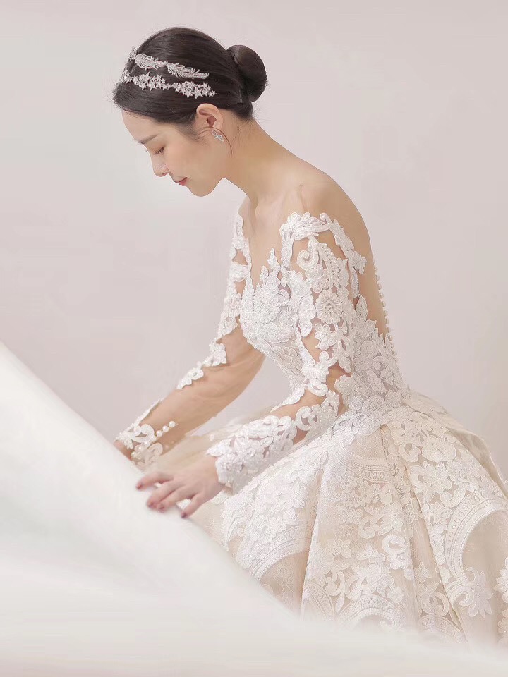 穿上它,感觉像陷入爱情里,心动的感觉❤ 适合对于宫廷大托的一见钟情,折服于闪烁的温润光芒和百年蕾丝世家的细腻质感,荡气回肠却又温密温煦,整日爱情给人的感觉~ 超长的大拖尾,细腻的蕾丝刺绣,只有真正的大牌婚纱才能做出这样的感觉。上身女王与优雅一并具现,气质与温柔完美的结合。