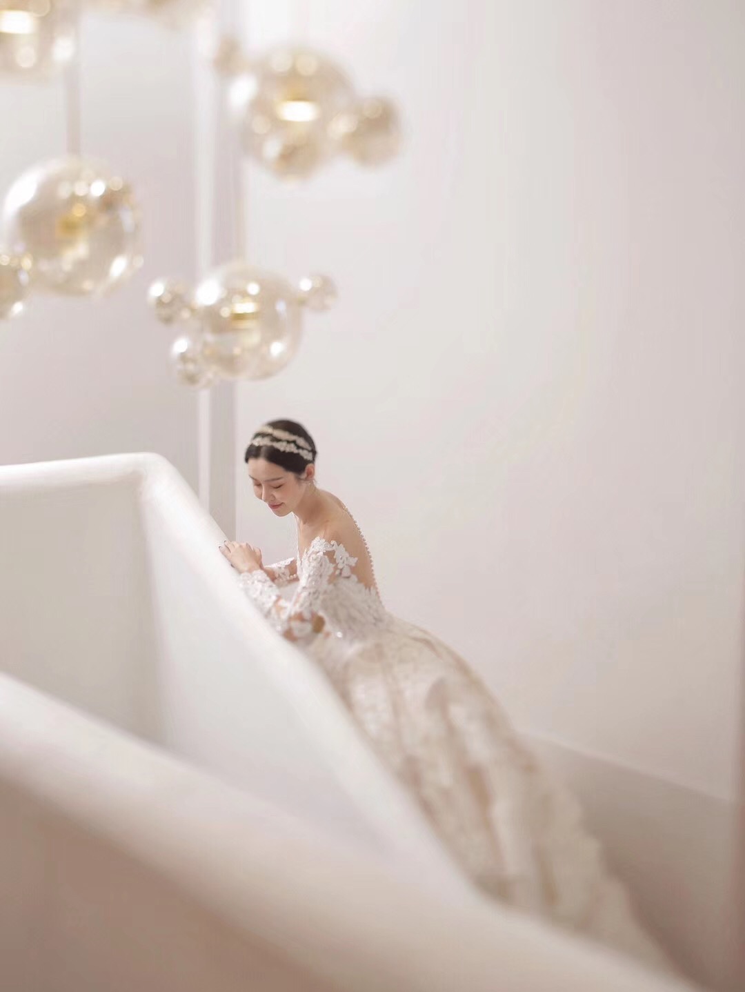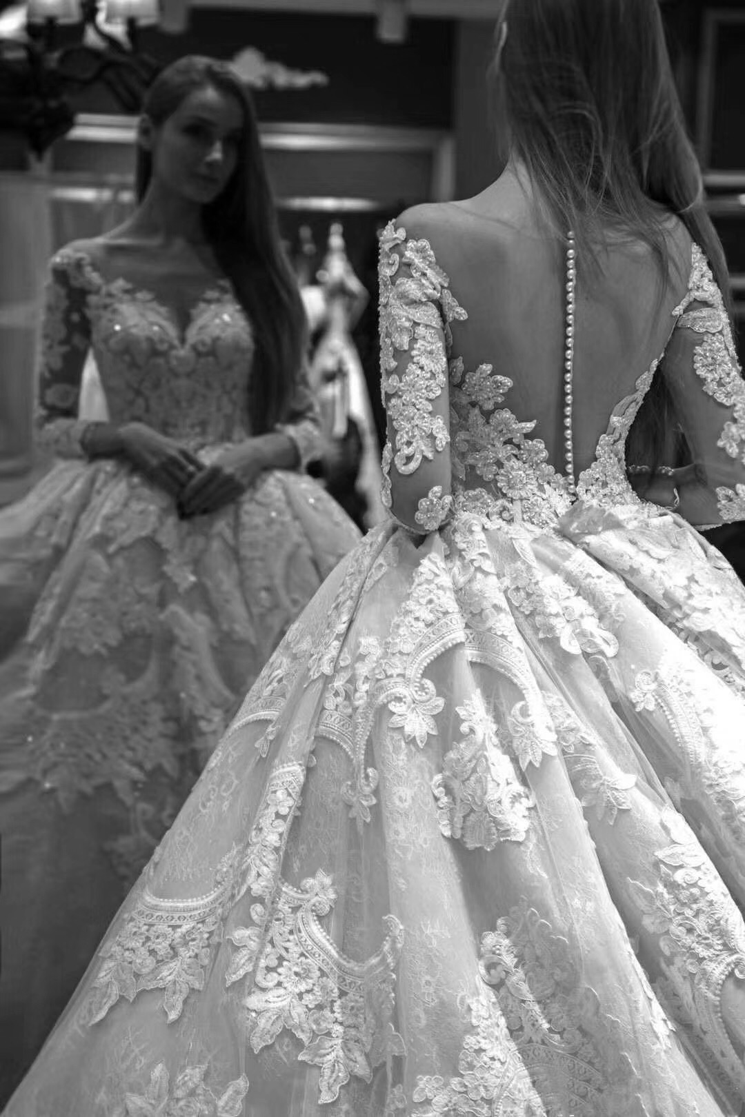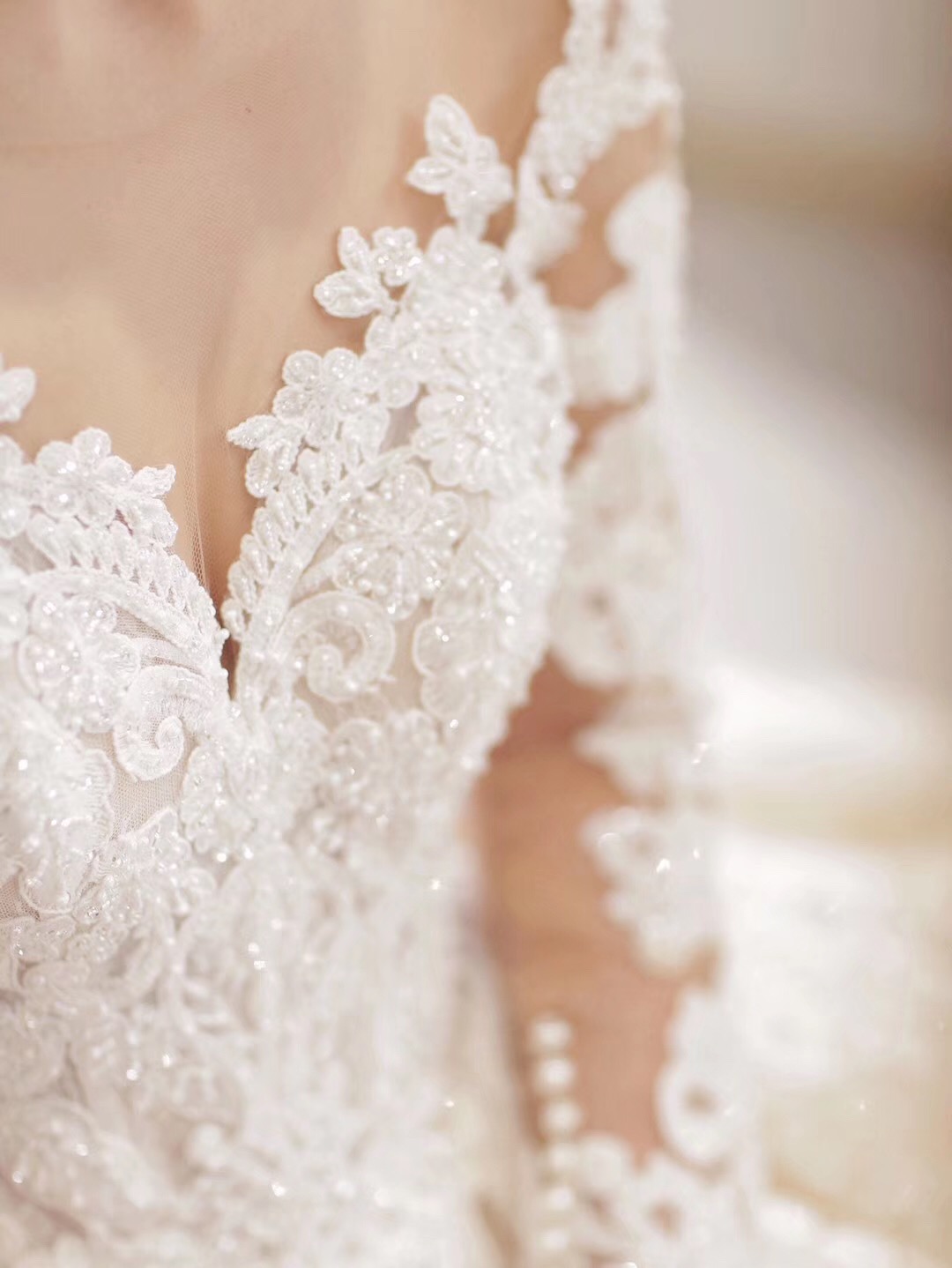 穿上它,感觉像陷入爱情里,心动的感觉❤ 适合对于宫廷大托的一见钟情,折服于闪烁的温润光芒和百年蕾丝世家的细腻质感,荡气回肠却又温密温煦,整日爱情给人的感觉~ 超长的大拖尾,细腻的蕾丝刺绣,只有真正的大牌婚纱才能做出这样的感觉。上身女王与优雅一并具现,气质与温柔完美的结合。