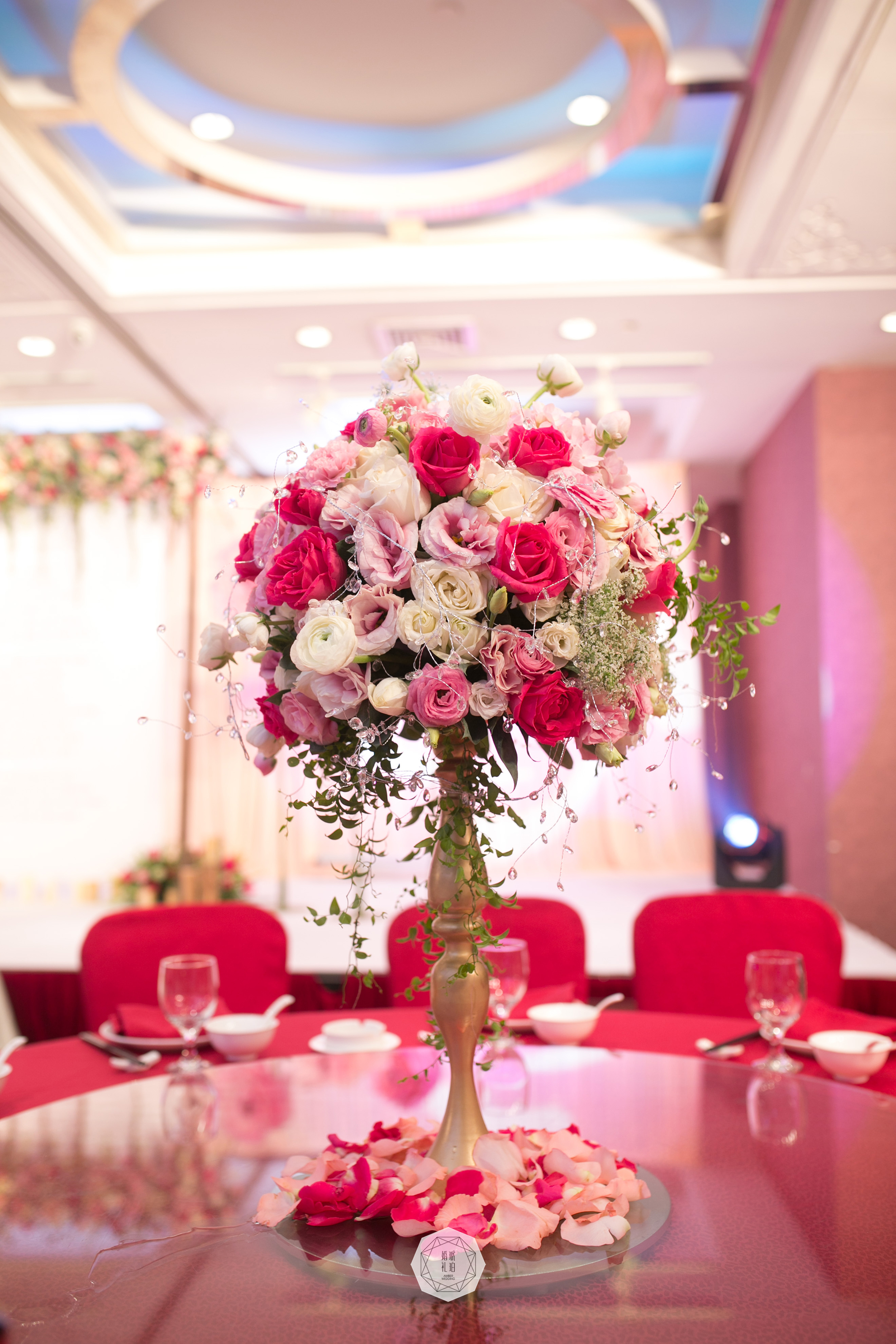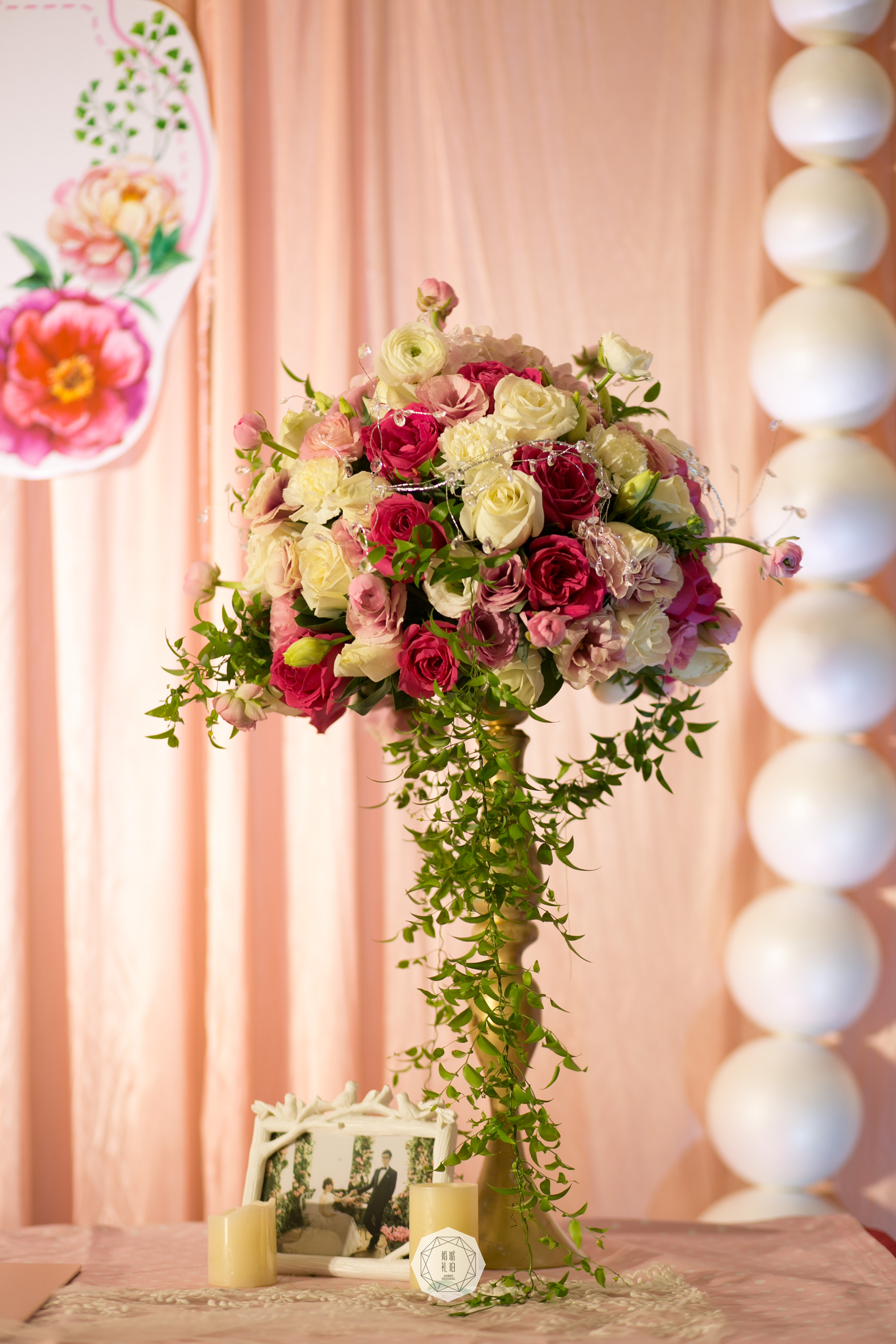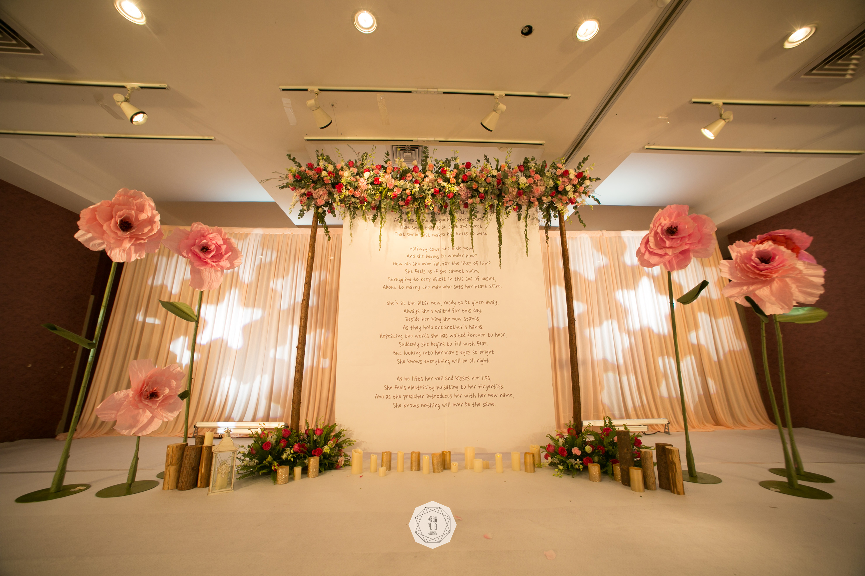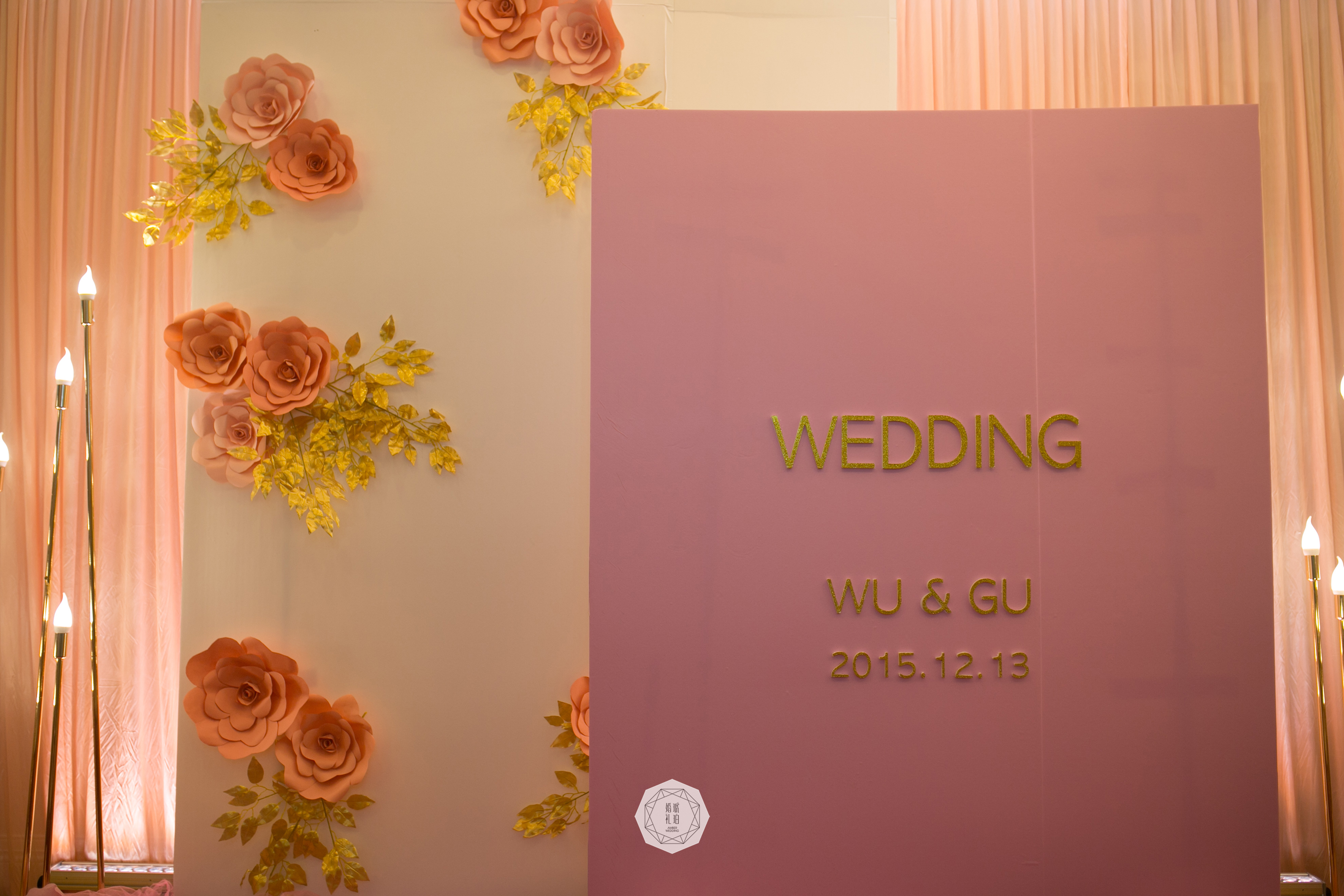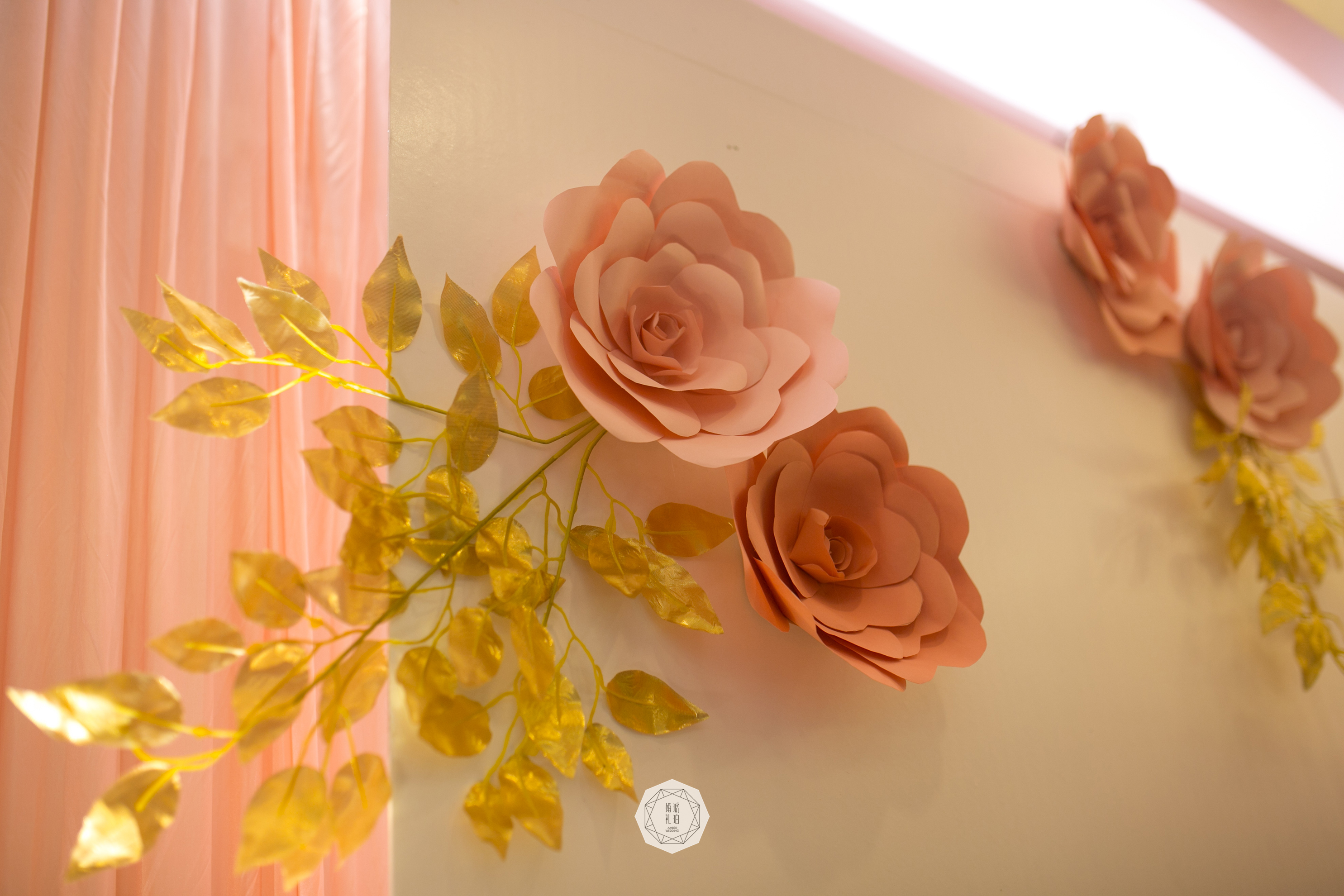 合影区:布缦背景及背景支架4mx2.8m/KT板写真组合及背景支架9.3平米/纸艺花及金色叶片7组/手揉纸纸艺花7朵/雪弗板喷金logo1组/雪纱6m/仿真花瓣