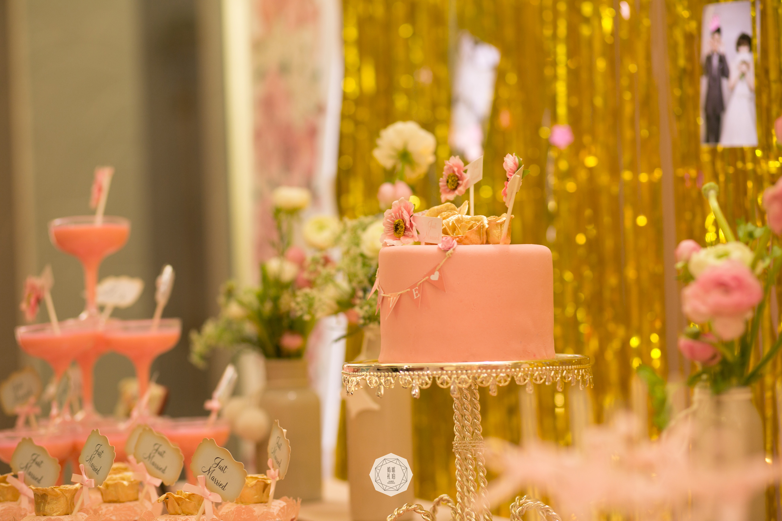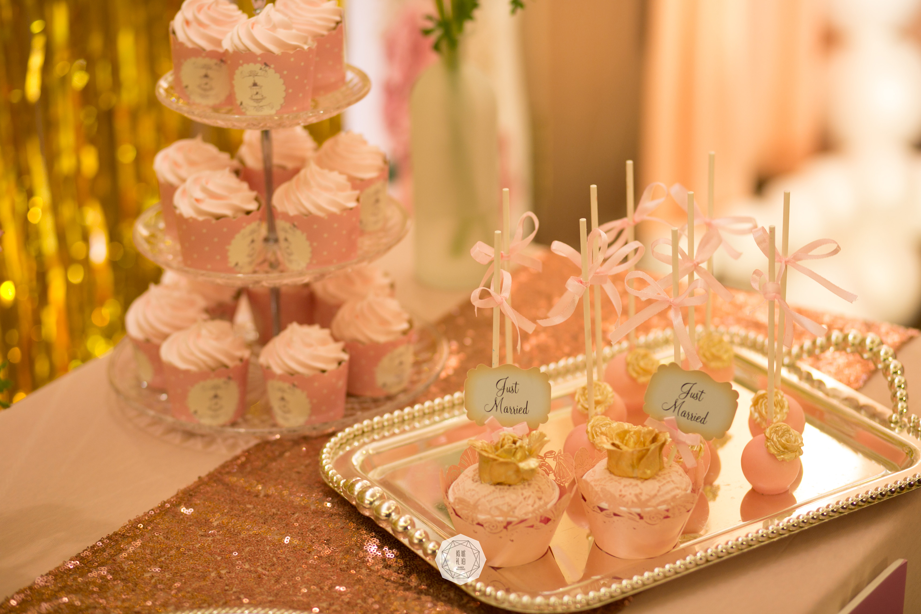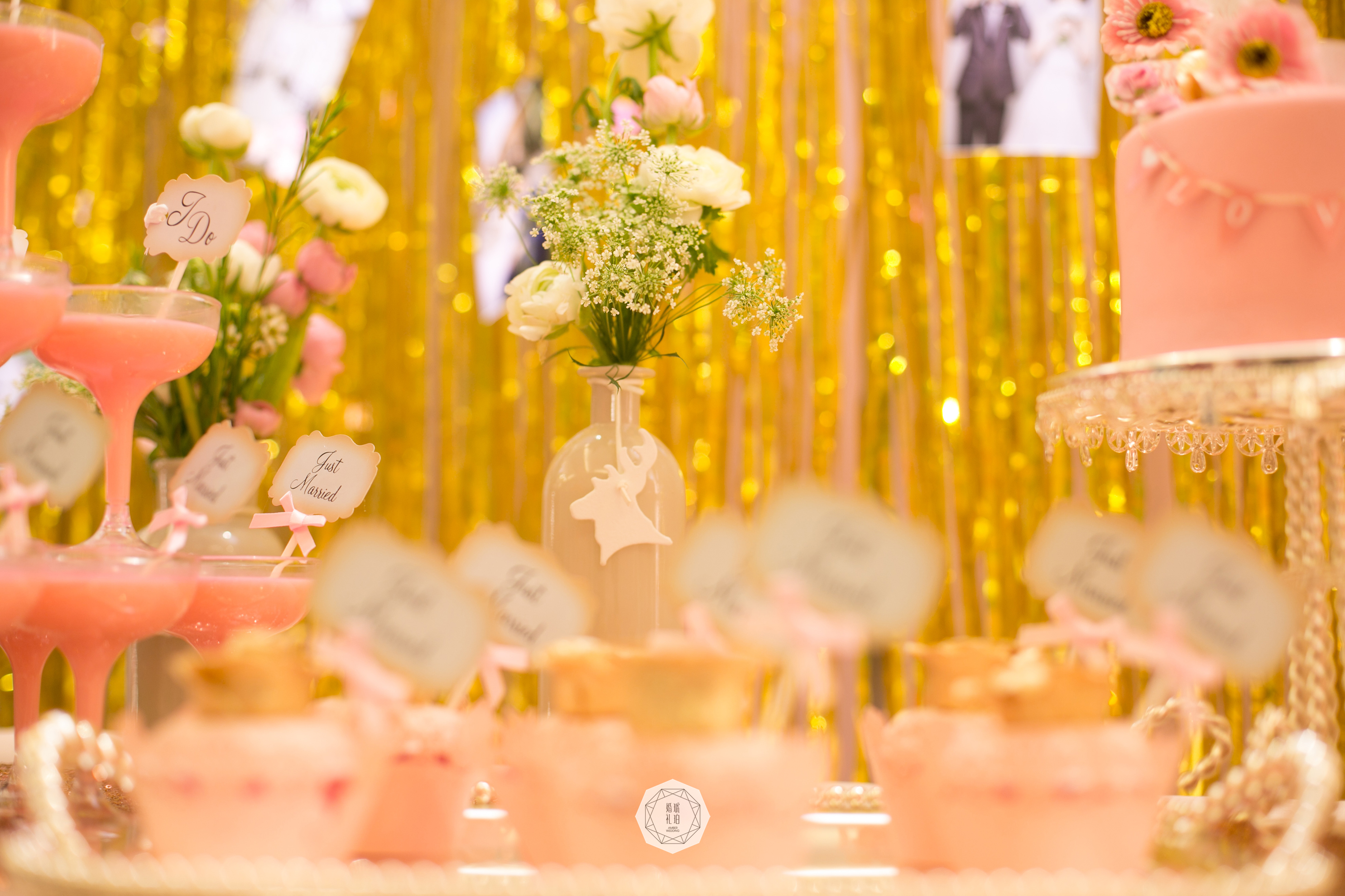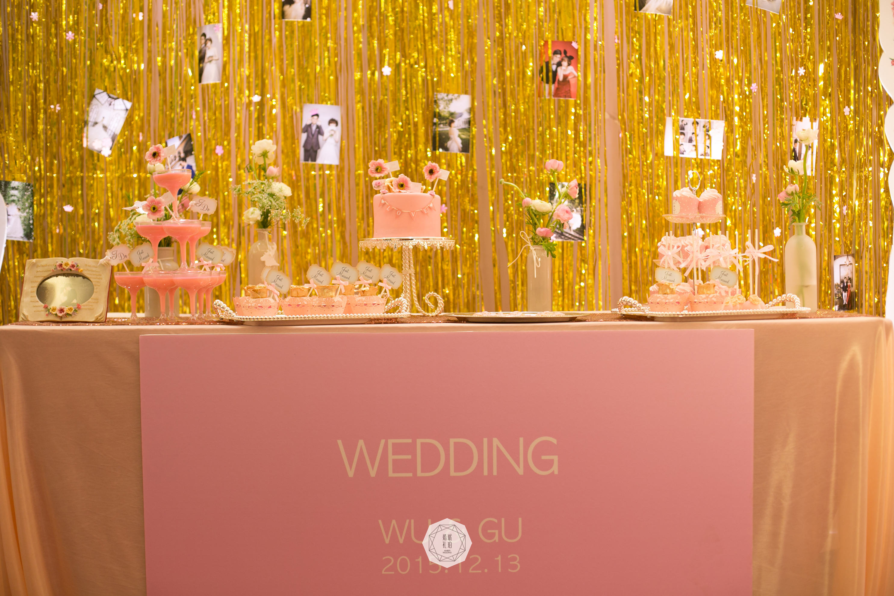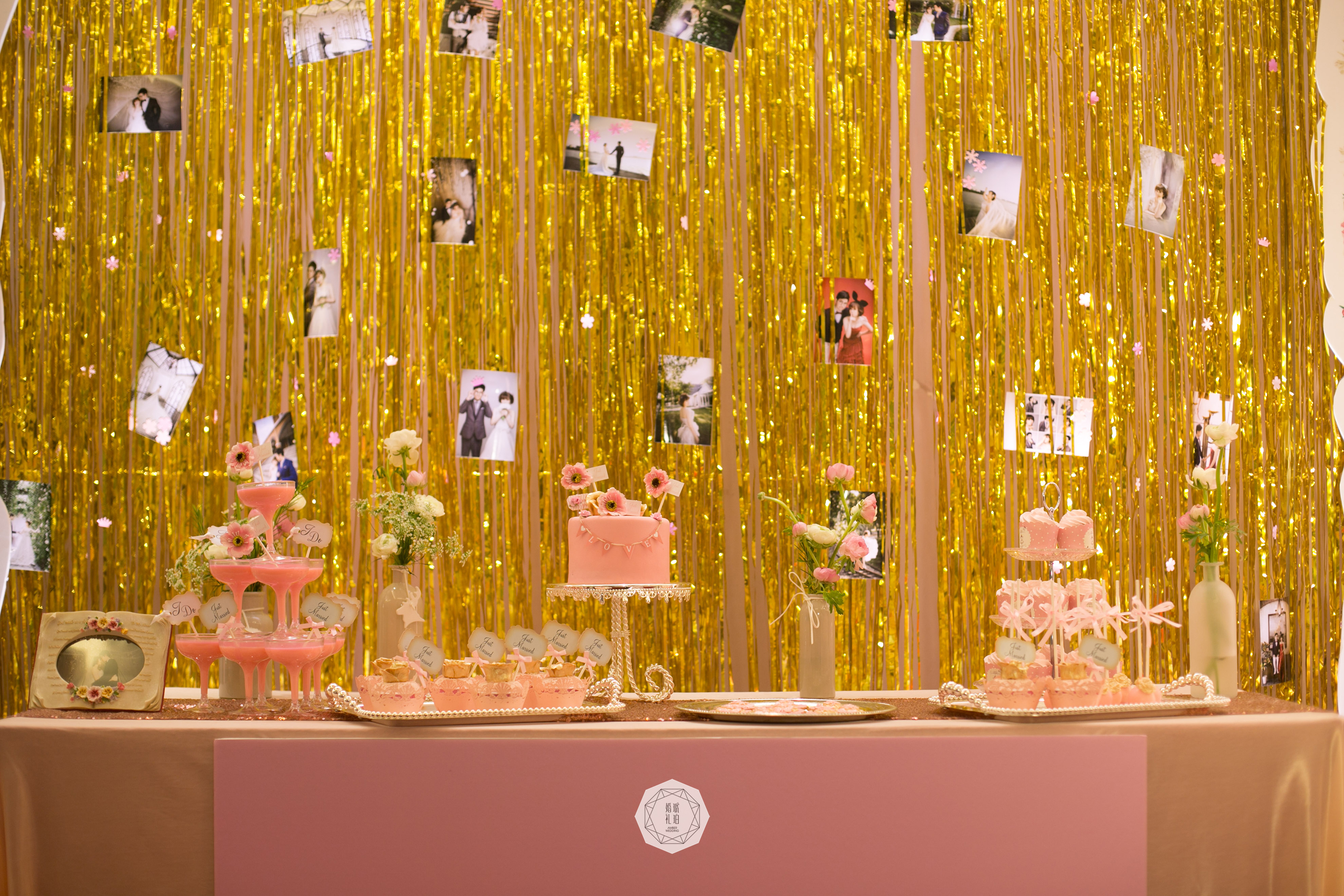 甜品区与展示区:背景支架4mx2.8m/拱形KT写真3.6平米/展示区照片30张/金色雨丝帘9组/长方形KT板写真1.05平米/棉质水玉桌布1块/桌花1组
