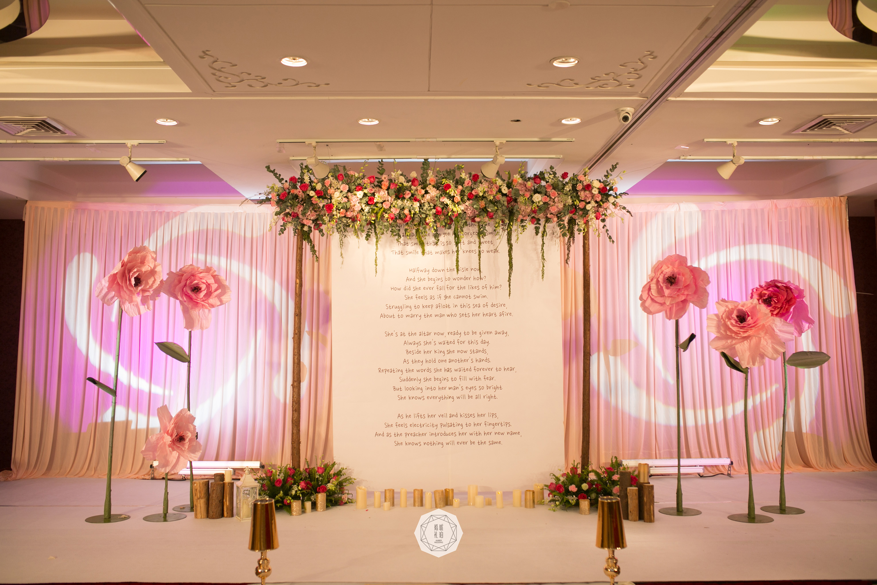 T台2mx12m/T台白色地毯24平米/T台裸粉色地毯12m/舞台白色地毯32平米/舞台背景基础搭建8mx3m/舞台背景布缦8mx3m/无纺布6平米/木质背景架1组/木质背景鲜花1组/金色台灯10个/直立纸艺花10个/电子蜡烛15个/木桩20个/主桌花1组