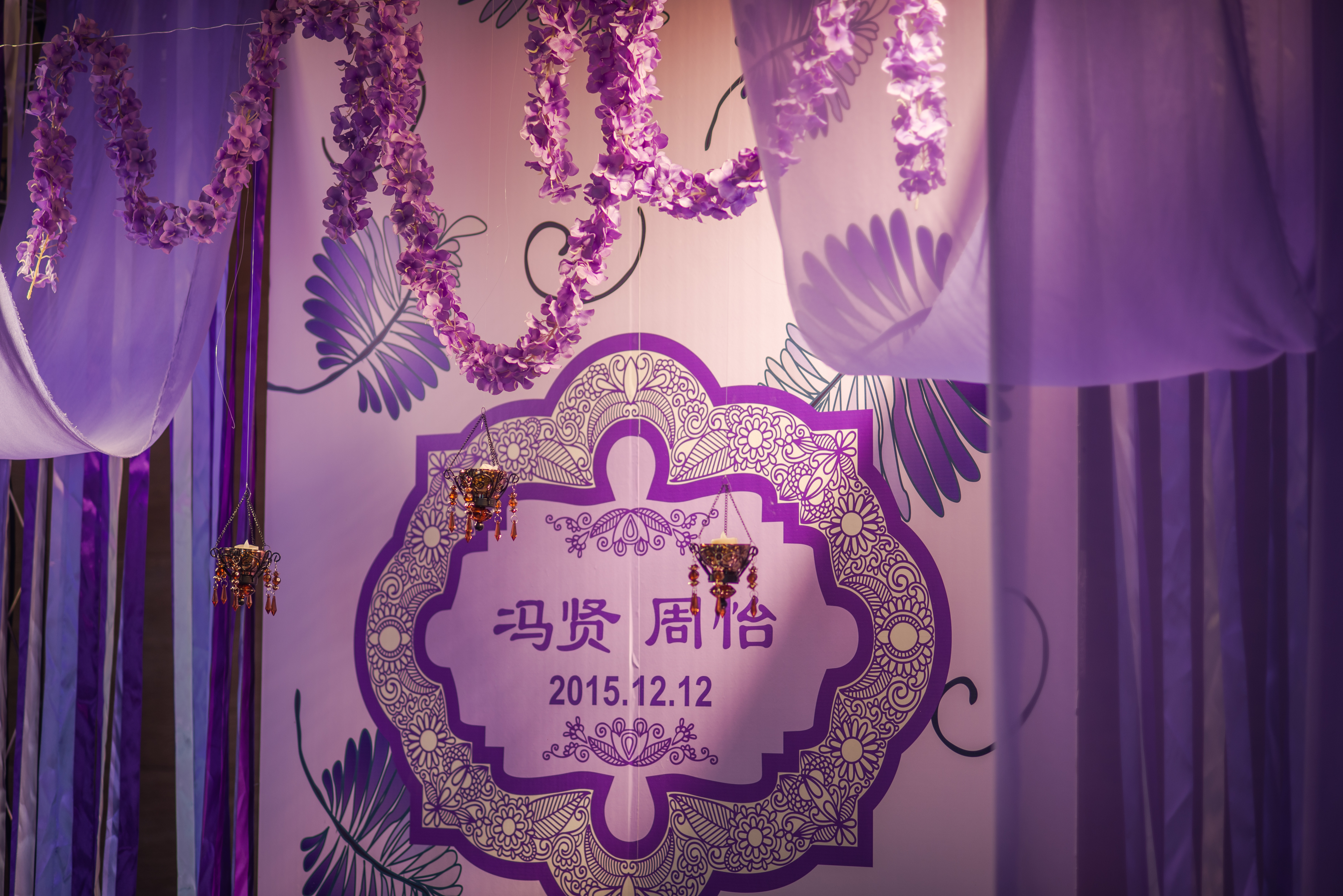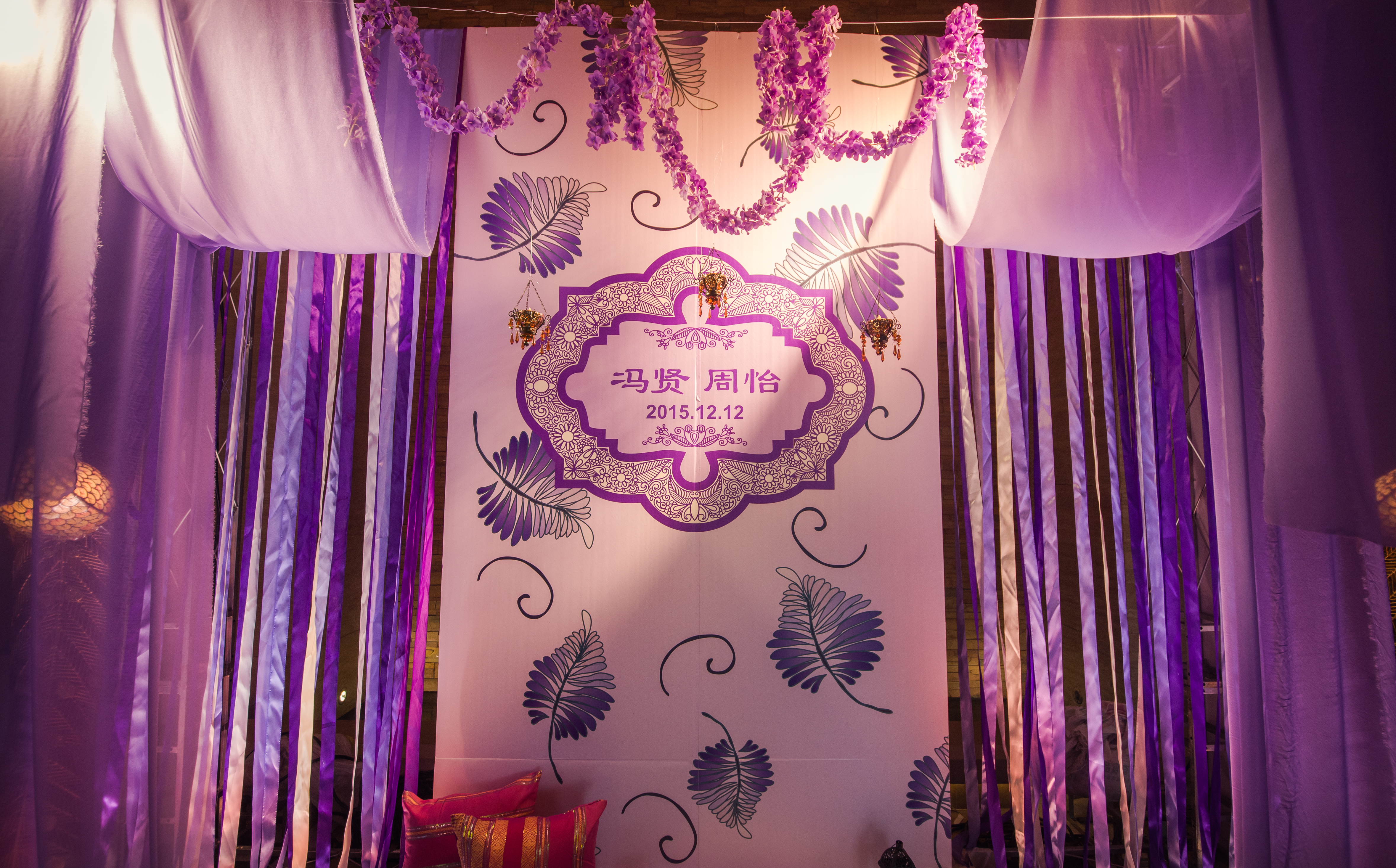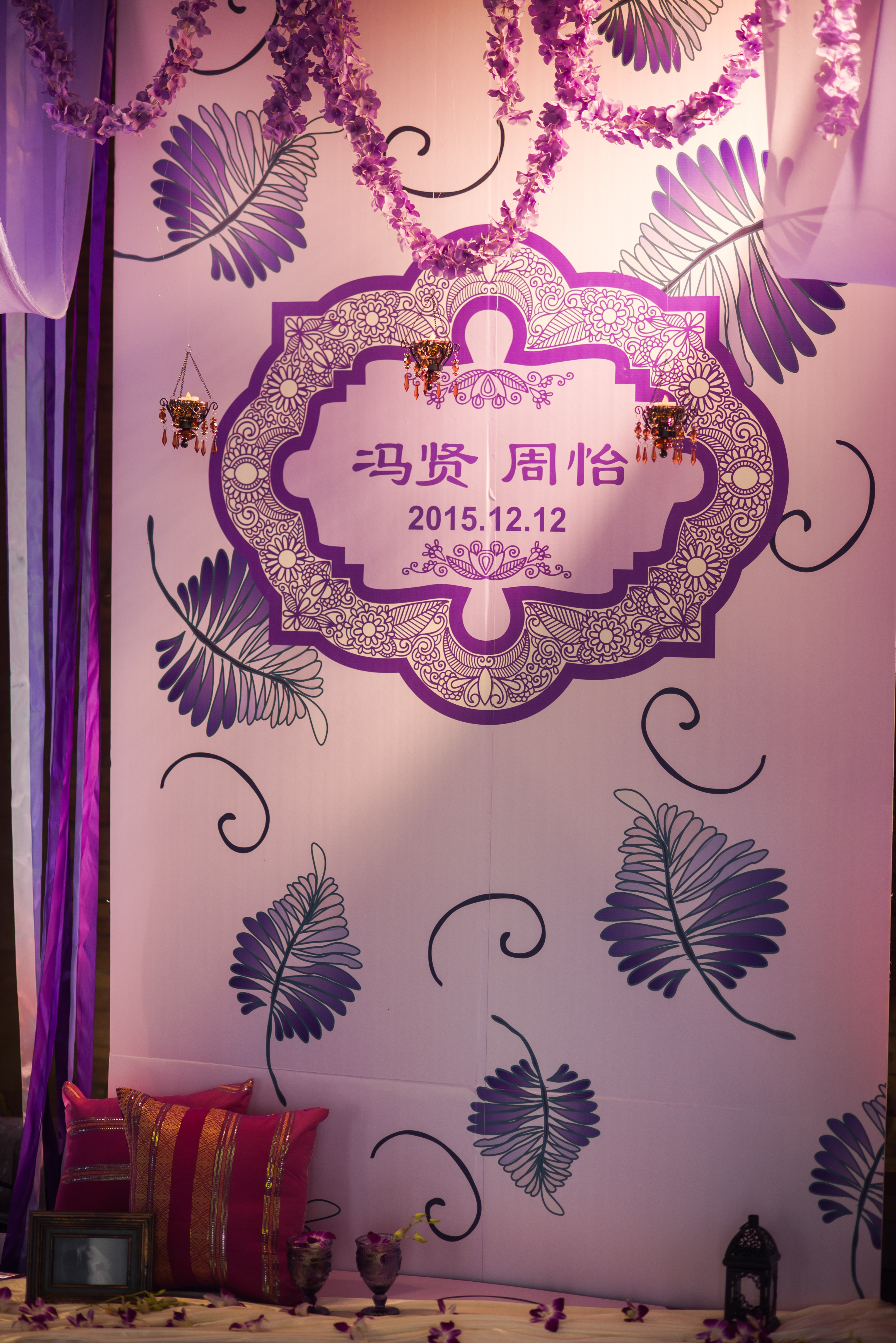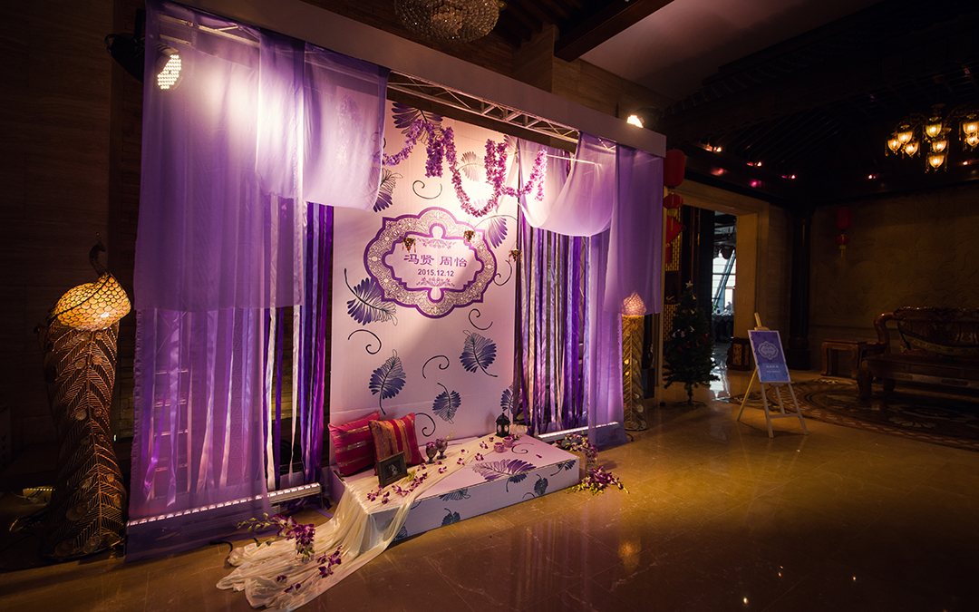 合影区:桁架9.6平米/KT板写真背景1.2mx3m/紫色雪纺布20m/渐变丝带背景2组/地面平台KT板写真2平米/琉璃灯3个/东南亚风格抱枕2个/紫藤花串4串/琉璃酒杯2个/复古相框1个/白色纱幔2m/琉璃烛台2个/铁艺风灯1个/鲜花1组/KT板写真指示牌1个