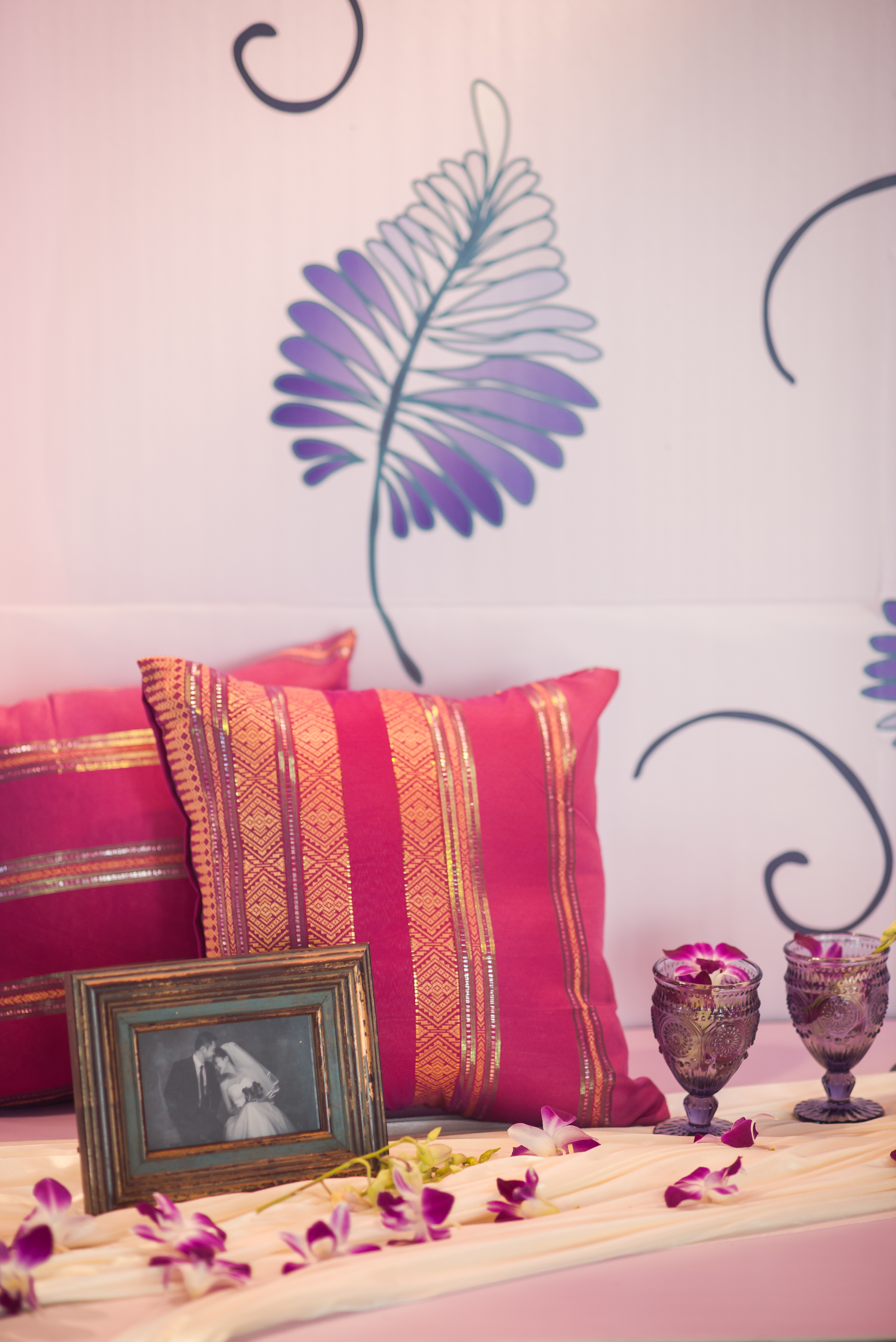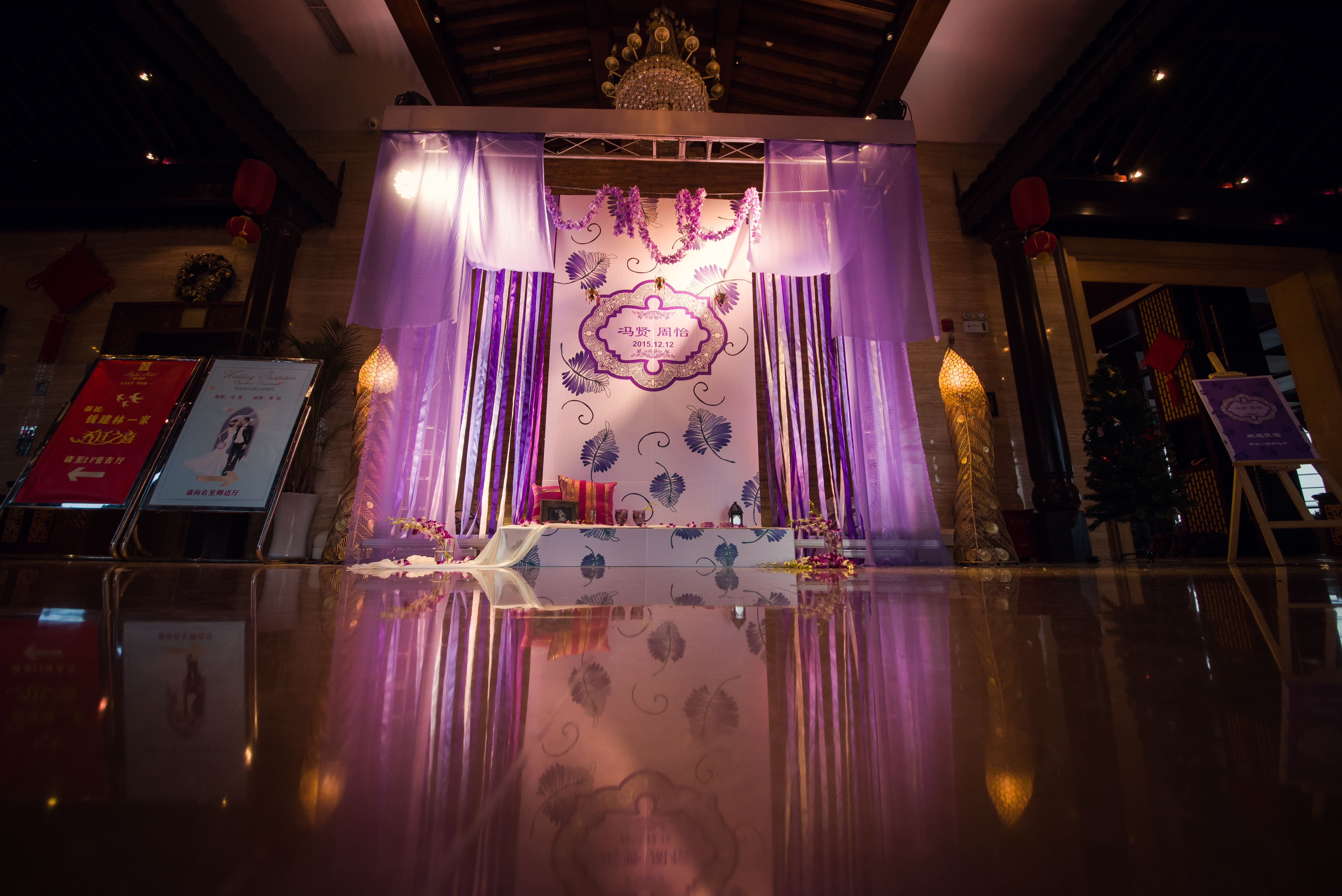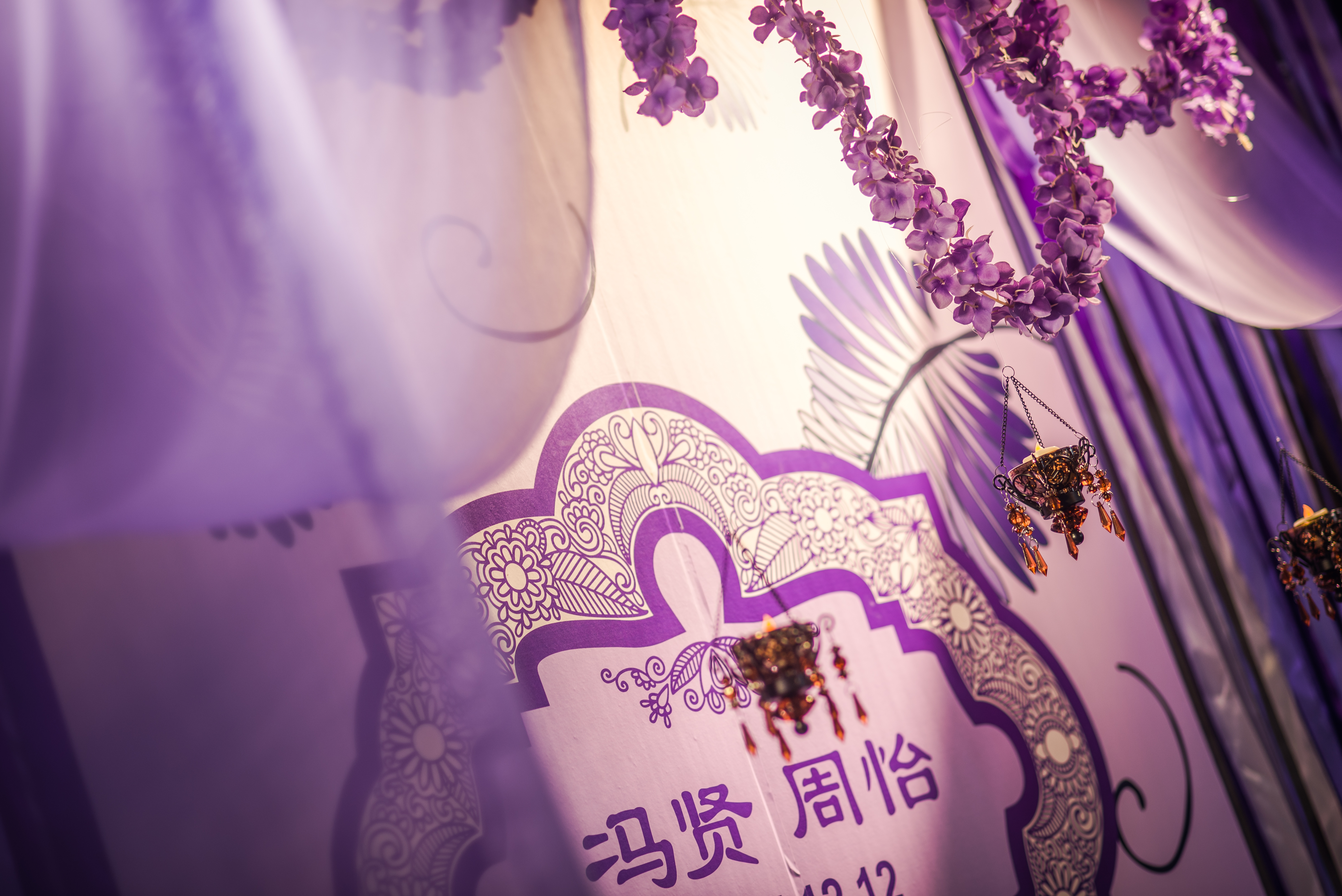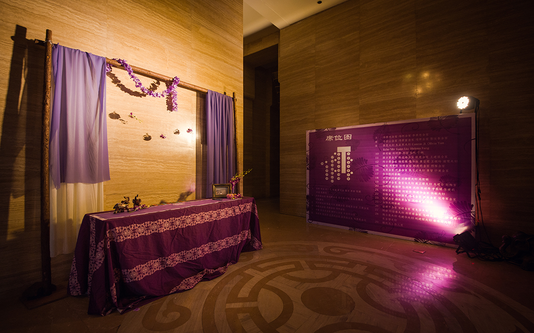 合影区:桁架9.6平米/KT板写真背景1.2mx3m/紫色雪纺布20m/渐变丝带背景2组/地面平台KT板写真2平米/琉璃灯3个/东南亚风格抱枕2个/紫藤花串4串/琉璃酒杯2个/复古相框1个/白色纱幔2m/琉璃烛台2个/铁艺风灯1个/鲜花1组/KT板写真指示牌1个