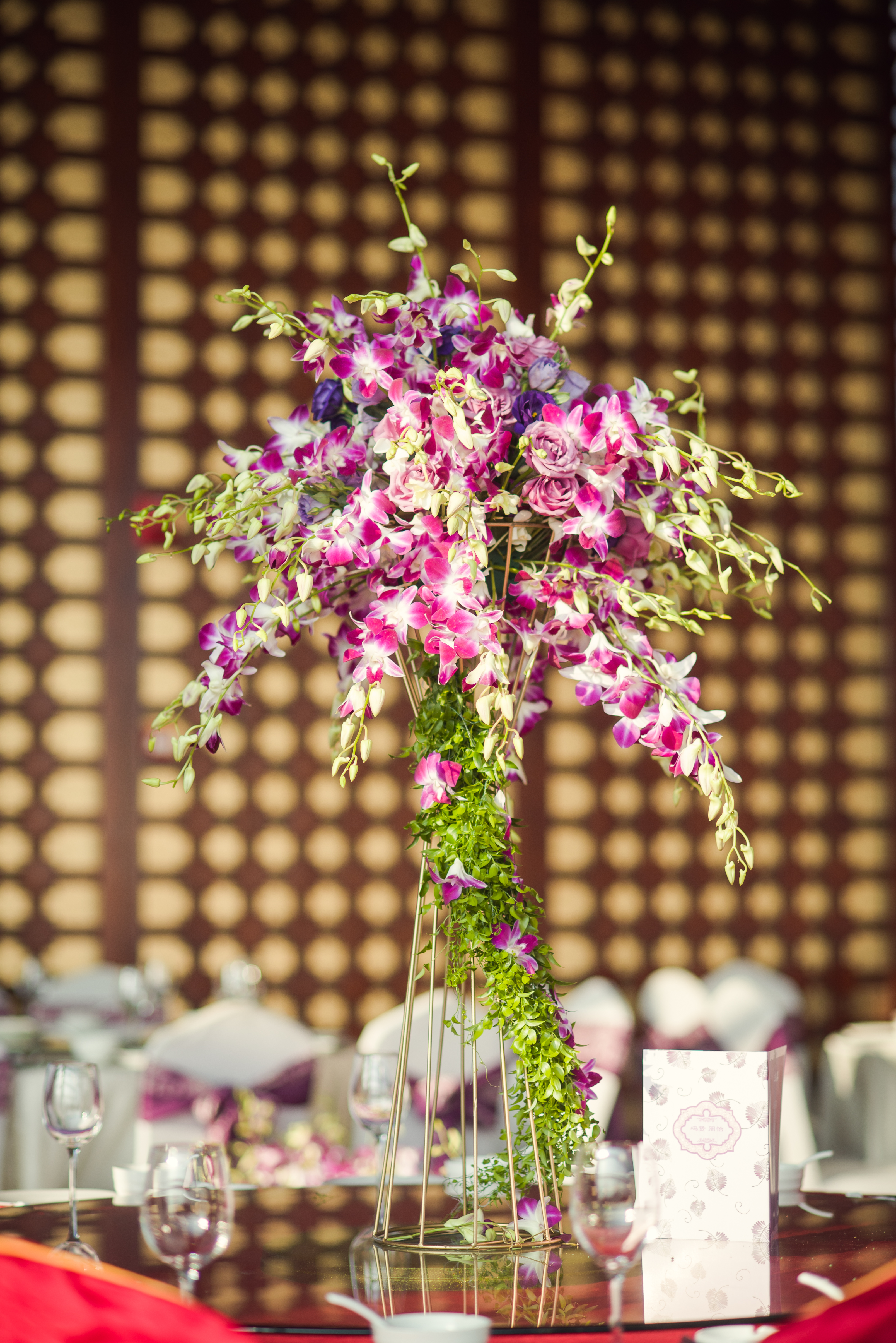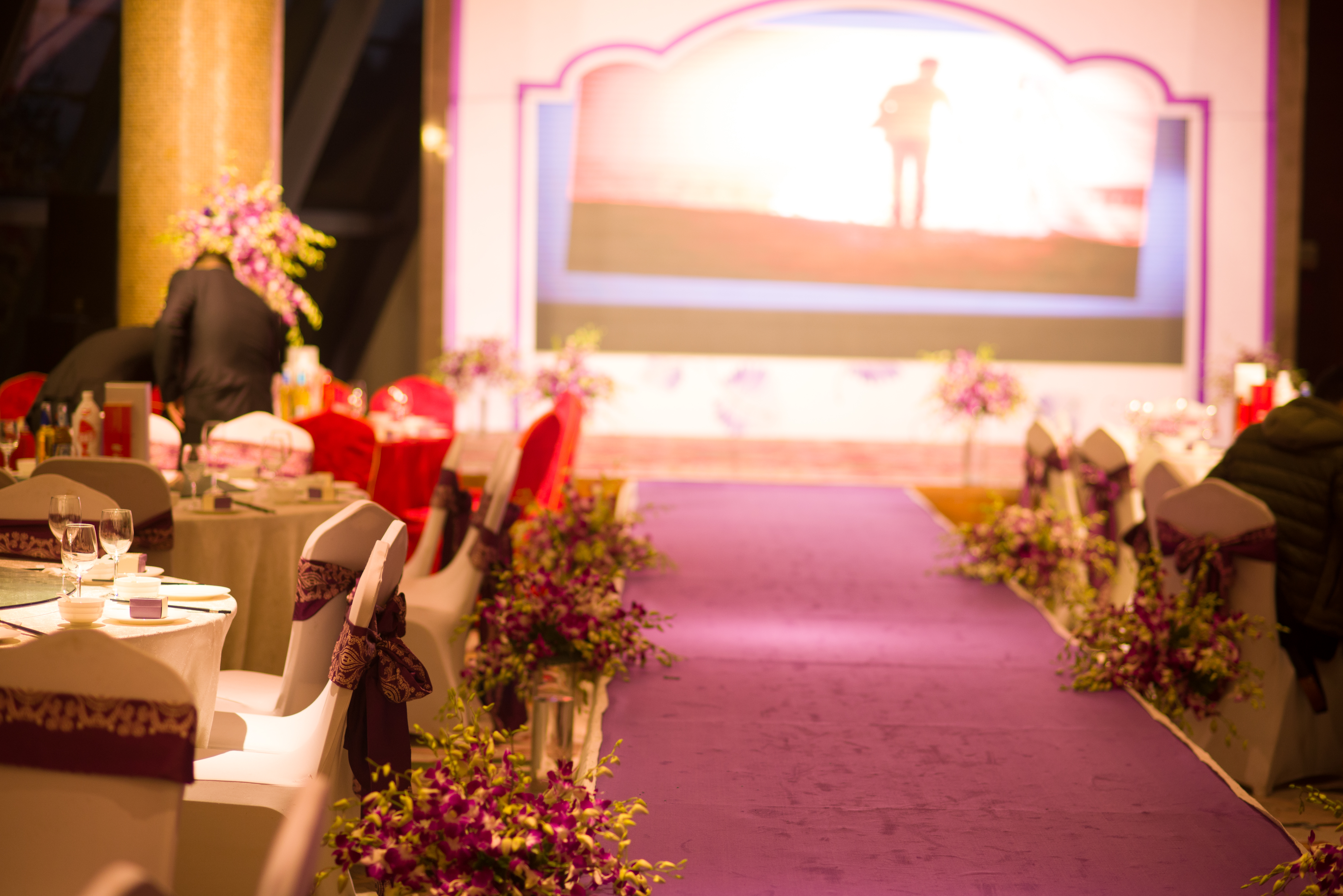 T台:1.5mx16m/T台紫色地毯24平米/路引鲜花12组/交接区异形KT板写真及鲜花2个/舞台背景桁架:3.2mx5.4m/KT板写真15平米/主桌鲜花