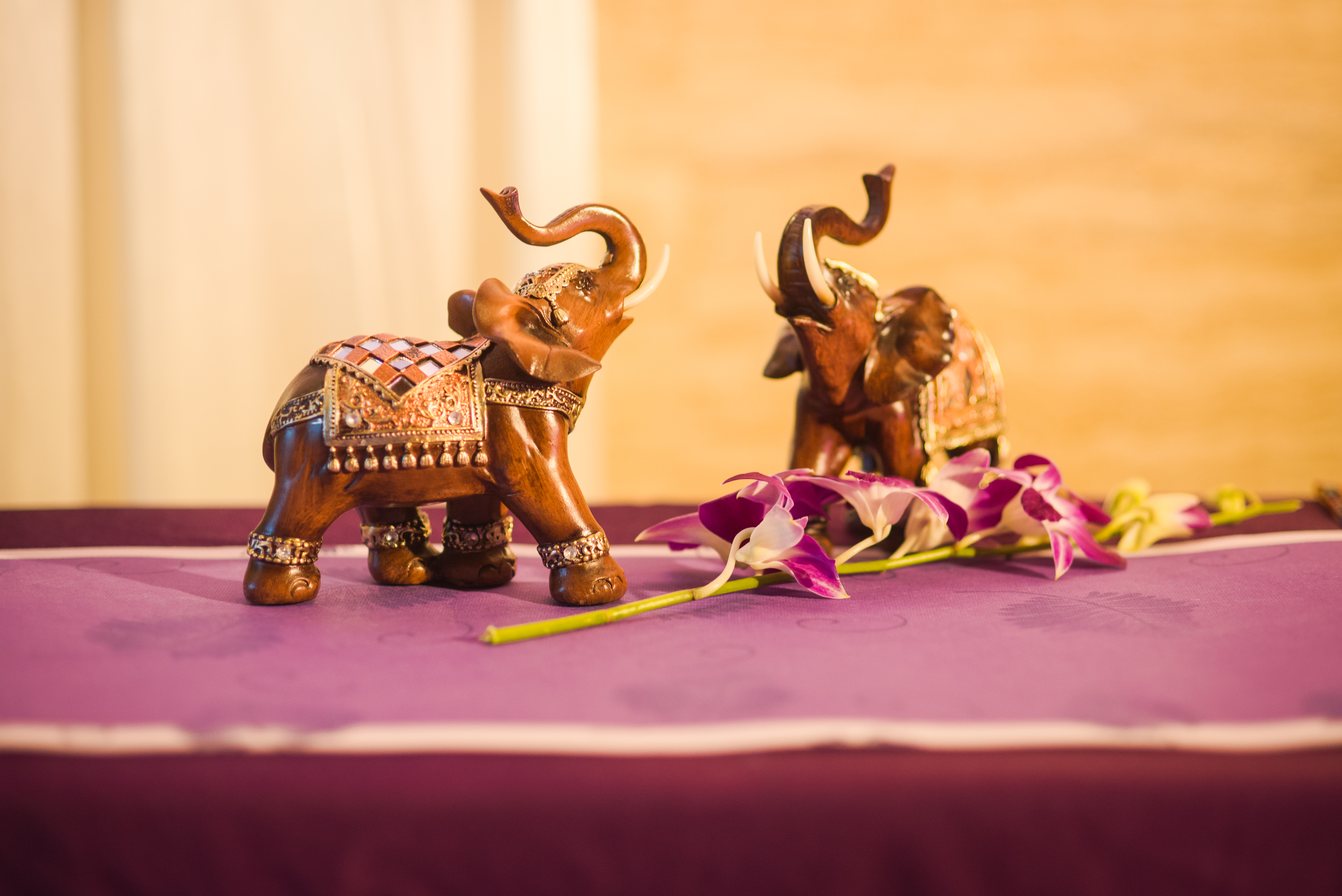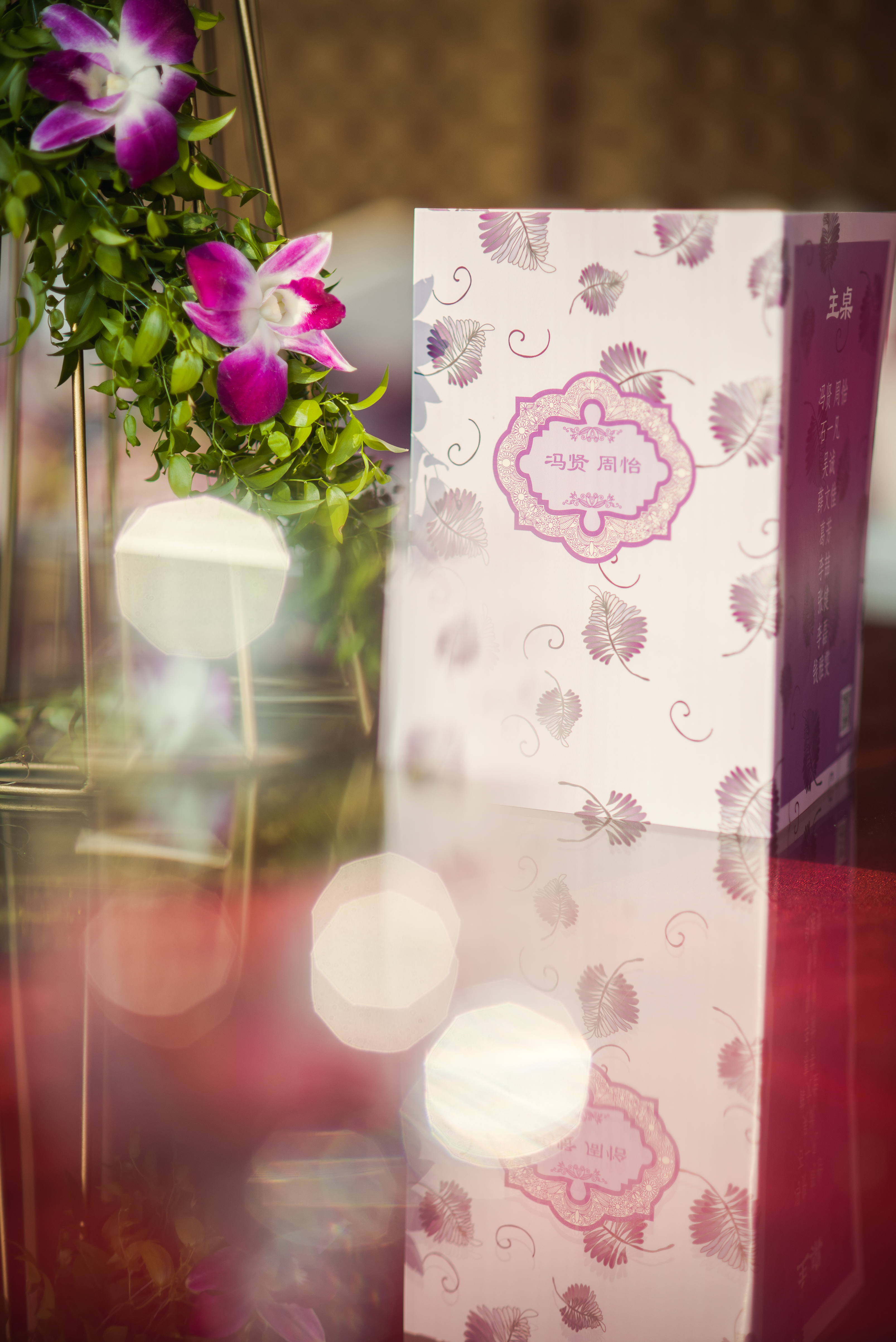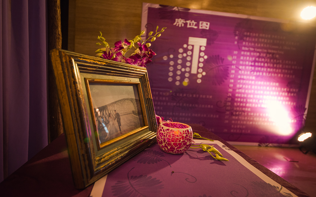 签到桌:签到卷轴1块/复古相框1个/木雕小象2个/鲜花一组/琉璃烛台1个/木质背景搭建1组/紫色雪纺布3m/紫藤花串2串/垂吊玻璃瓶3个