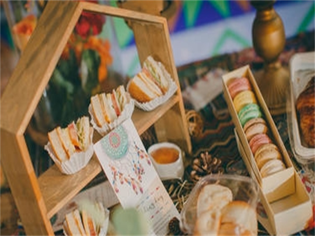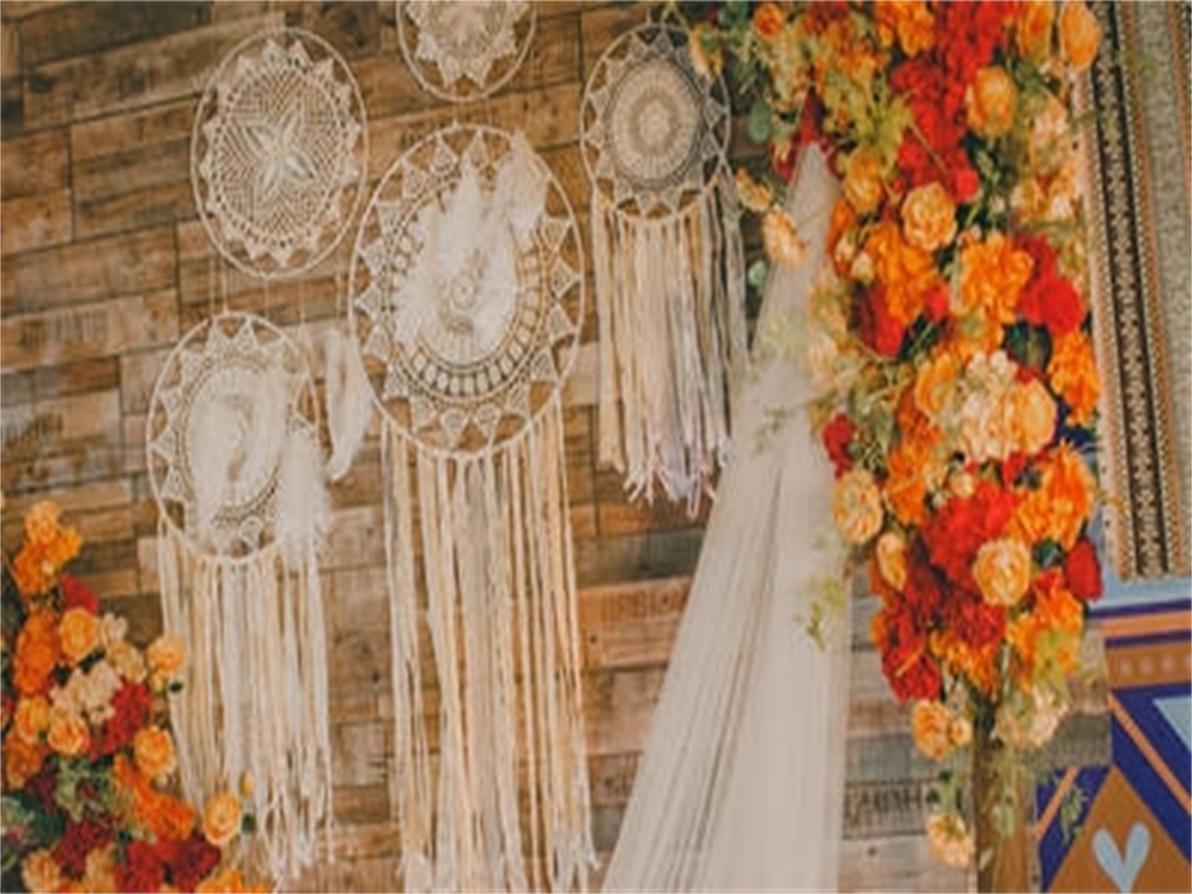靠右边部分垂挂捕梦网 甜品台用木桶做底部 木桶上面放一块木板 木板上面随意摆放毯子 架子两侧地上各放一块地毯 地毯上面木框、抱枕及花艺装饰