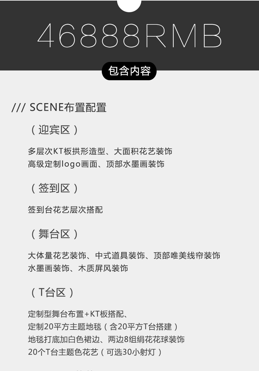 签到区:签到台花艺层次搭配 迎宾区:定制迎宾背景创意KT设计 展示区:定制展示区墙桁架搭建 定制席位图桁架搭建 定制相框迎宾牌及花艺布置 定制logo牌立体装饰 包门框:帷幔门框装饰或花艺全满拱门