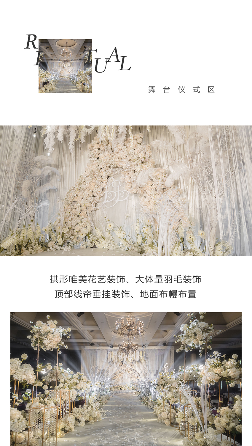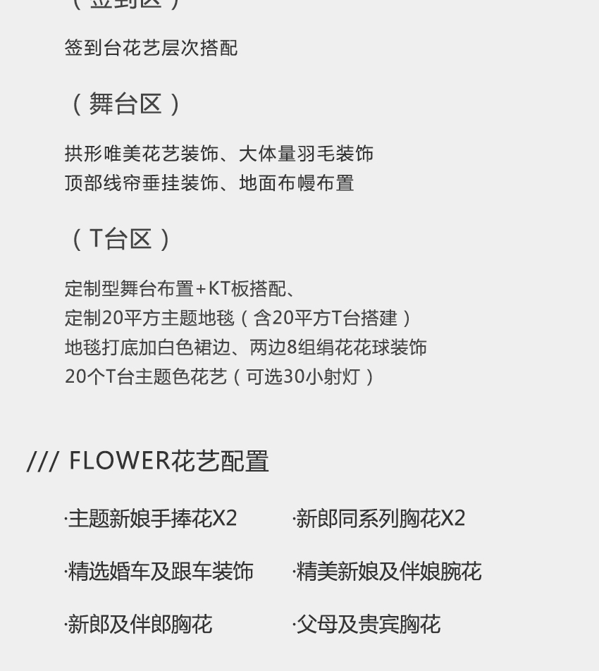 定制型(舞台布置)+KT板搭配 定制20平方主题地毯(含20平方T台搭建) T台话:20个T台主题色花艺(可选30小射灯) 烛台:定制花艺装饰+点火棒+大蜡烛+水晶方杯 蛋糕台:花瓣装饰+蛋糕刀鲜花装饰 香槟塔:鲜花+花瓣装饰