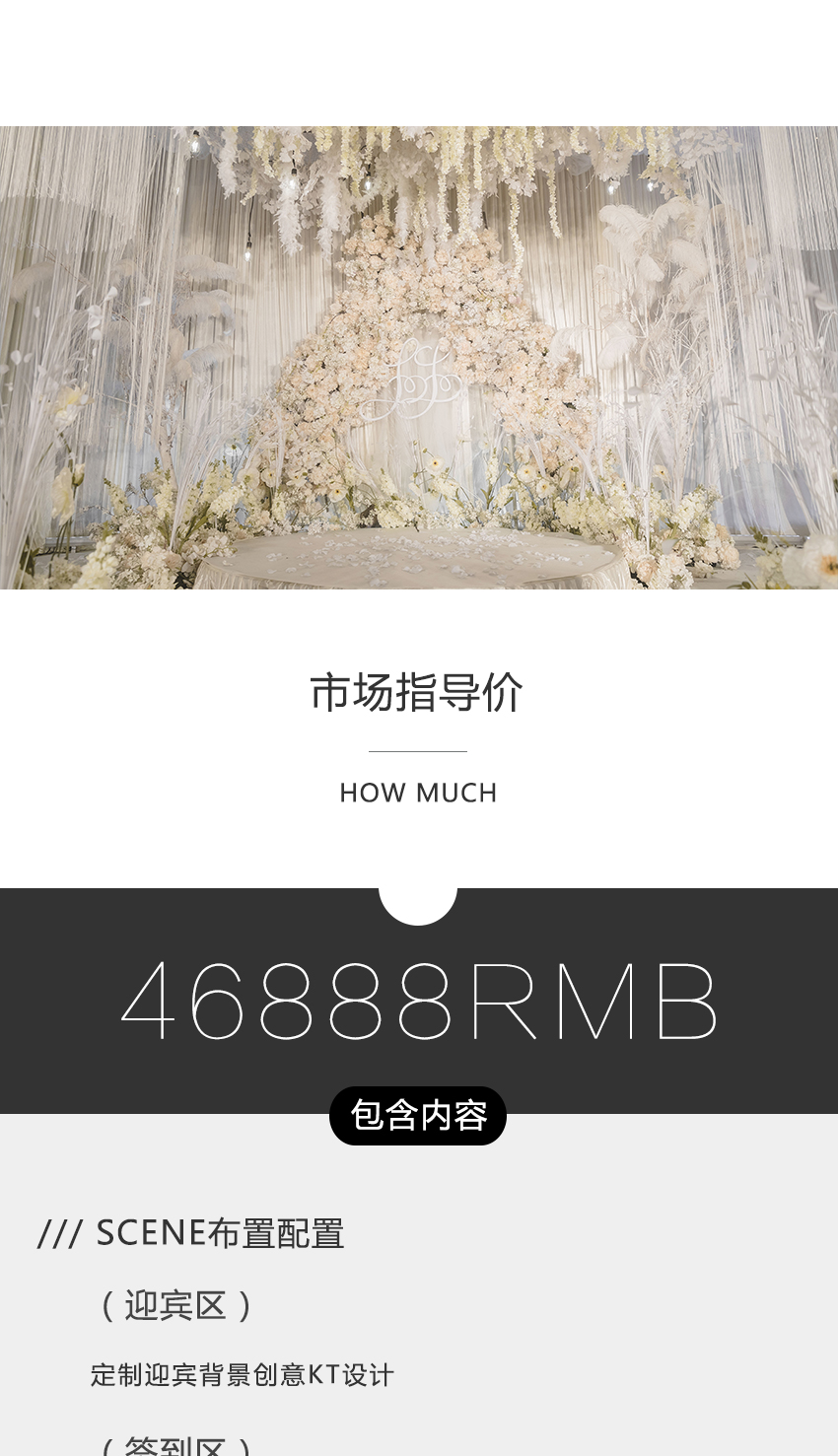 签到区:签到台花艺层次搭配 迎宾区:定制迎宾背景创意KT设计 展示区:定制展示区墙桁架搭建 定制席位图桁架搭建 定制相框迎宾牌及花艺布置 定制logo牌立体装饰 包门框:帷幔门框装饰或花艺全满拱门
