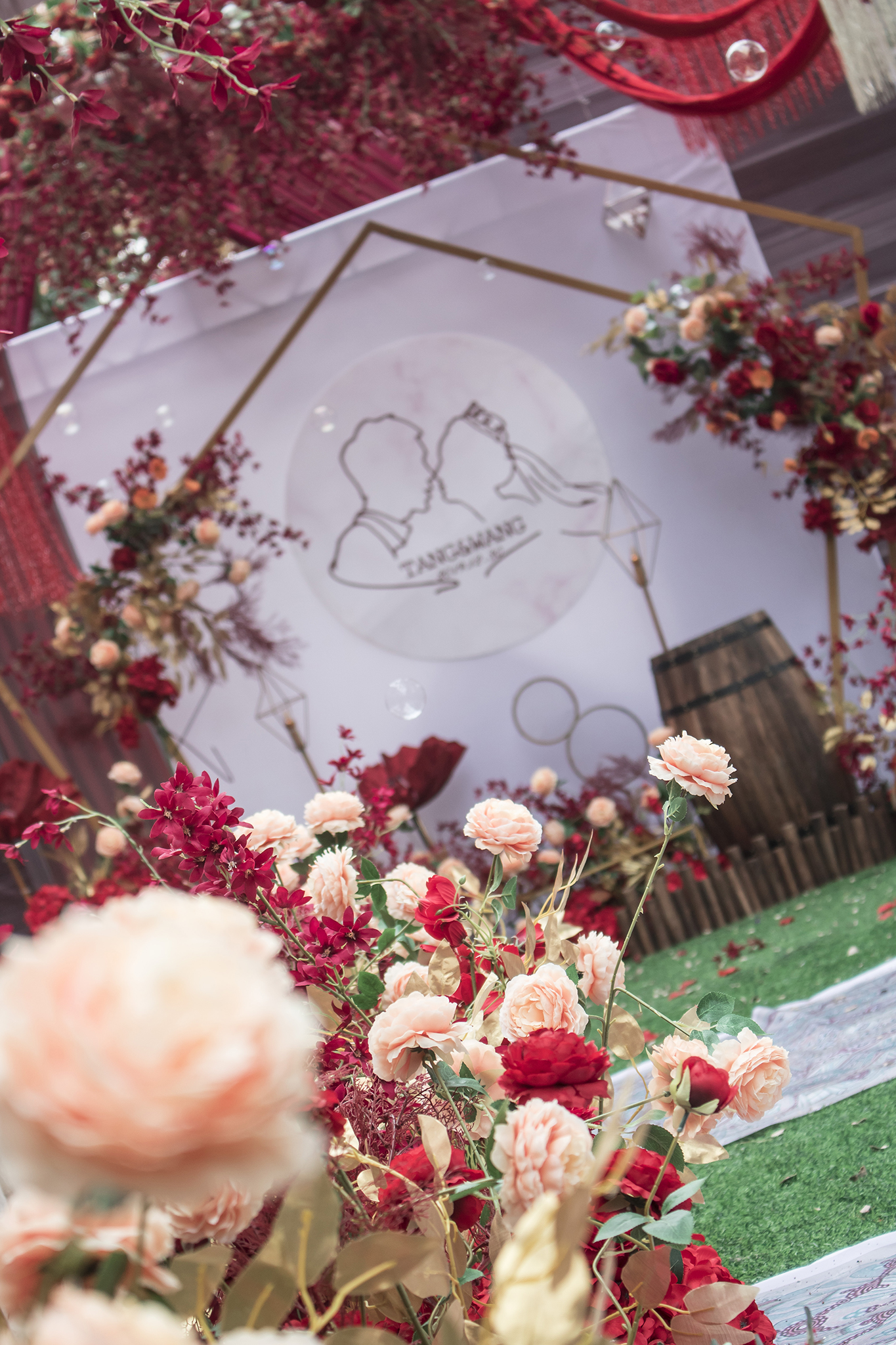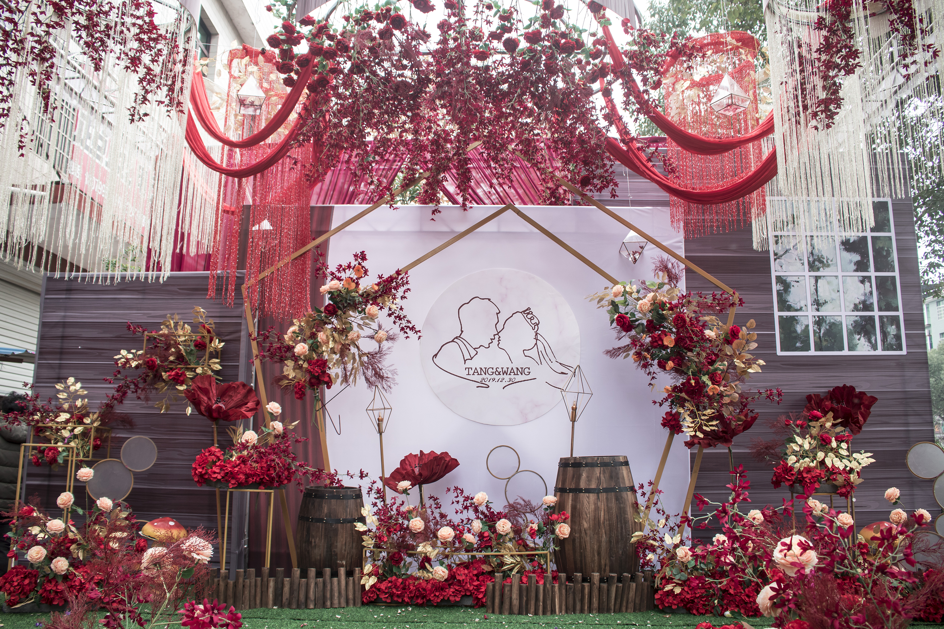 迎宾桁架搭建(尺寸按现场而定) 背景欧美纱幔 个性木质迎宾牌两套(仿真花装饰) 背景前装饰道具设计