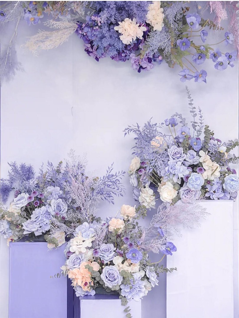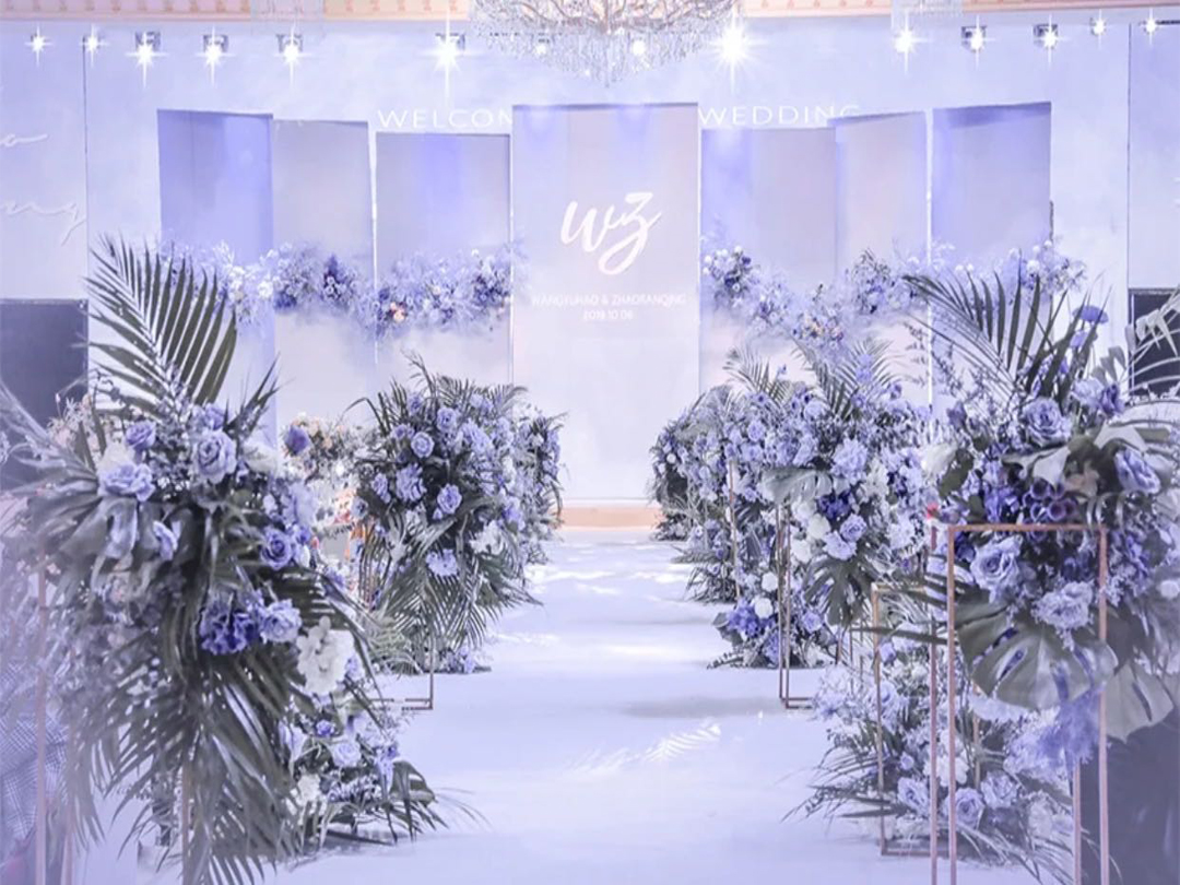 3.主题T台区:T台(2m*12m),T台精美鲜花+仿真花艺及共12组,金属铁艺路引12套。