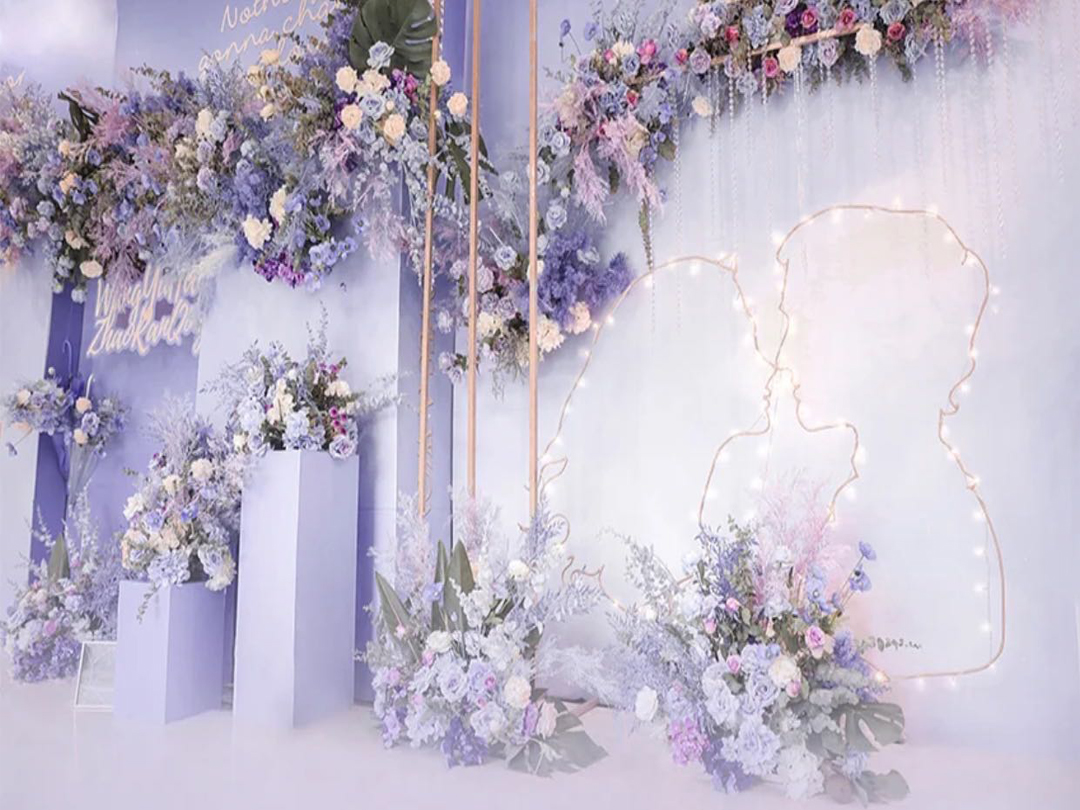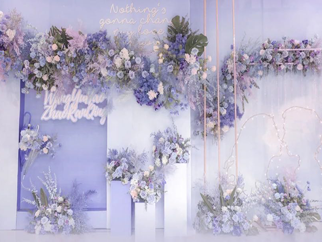 1,主题背景:主题背景(4m*8m)设计及制作,新人LOGO设计及制作,精致花艺设计及制作,主题订制异型板材设计及制作,主题背景星光路引6组,