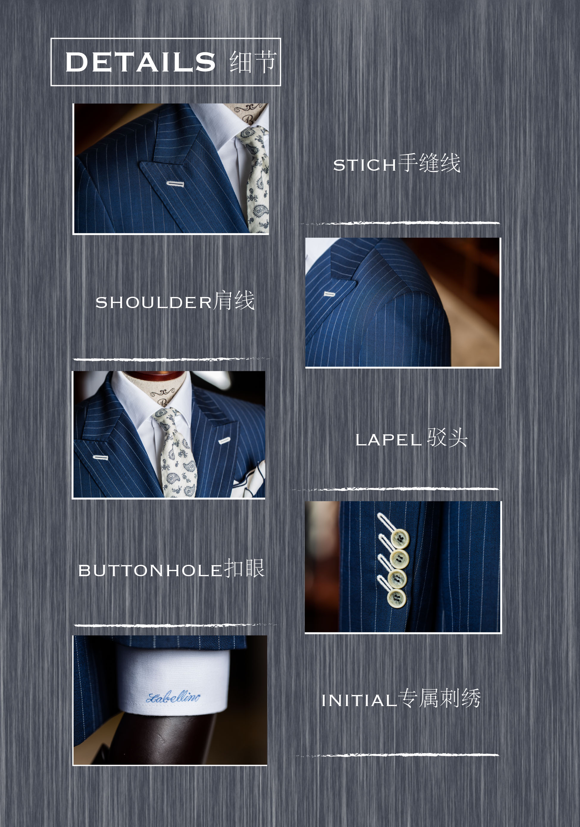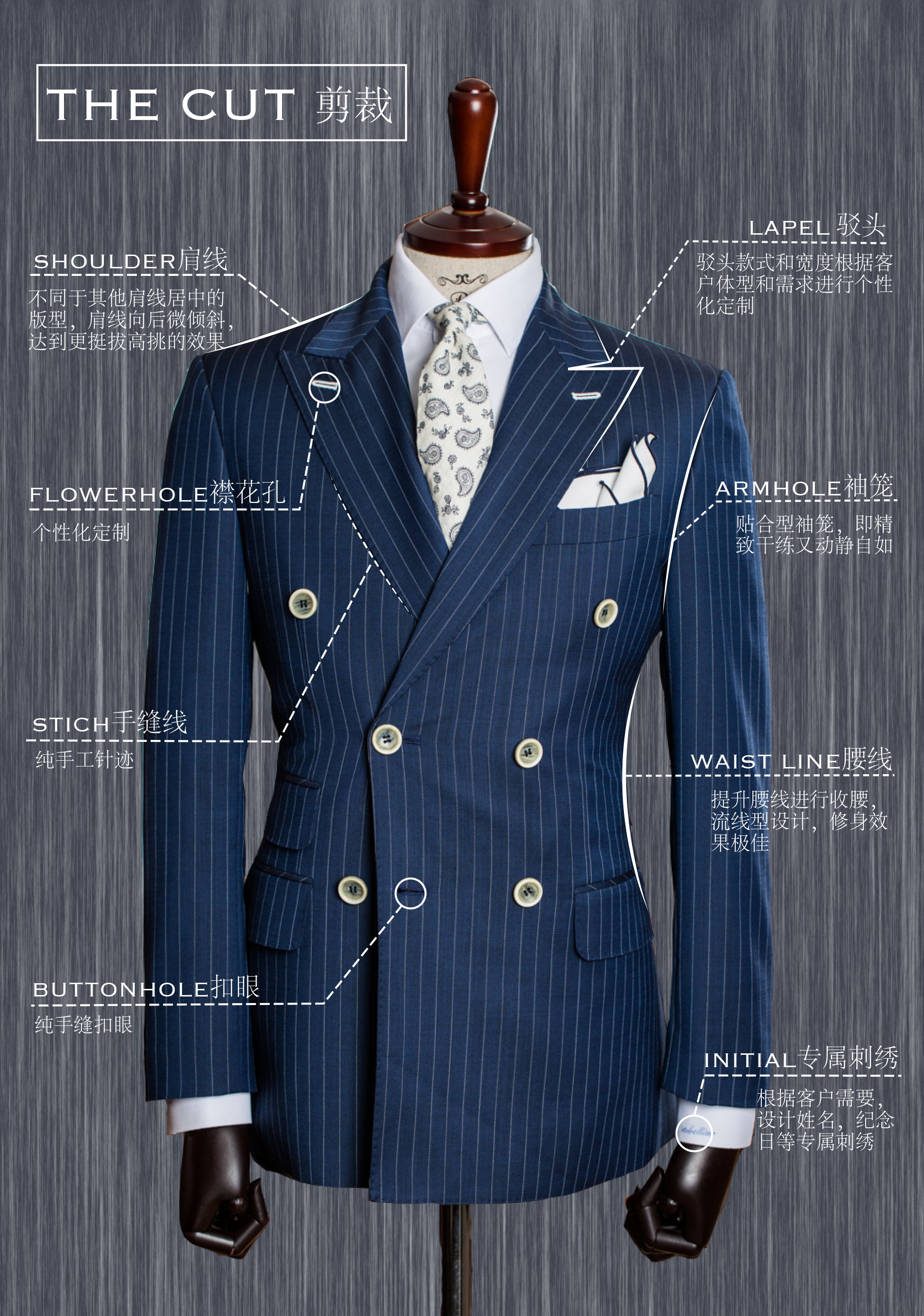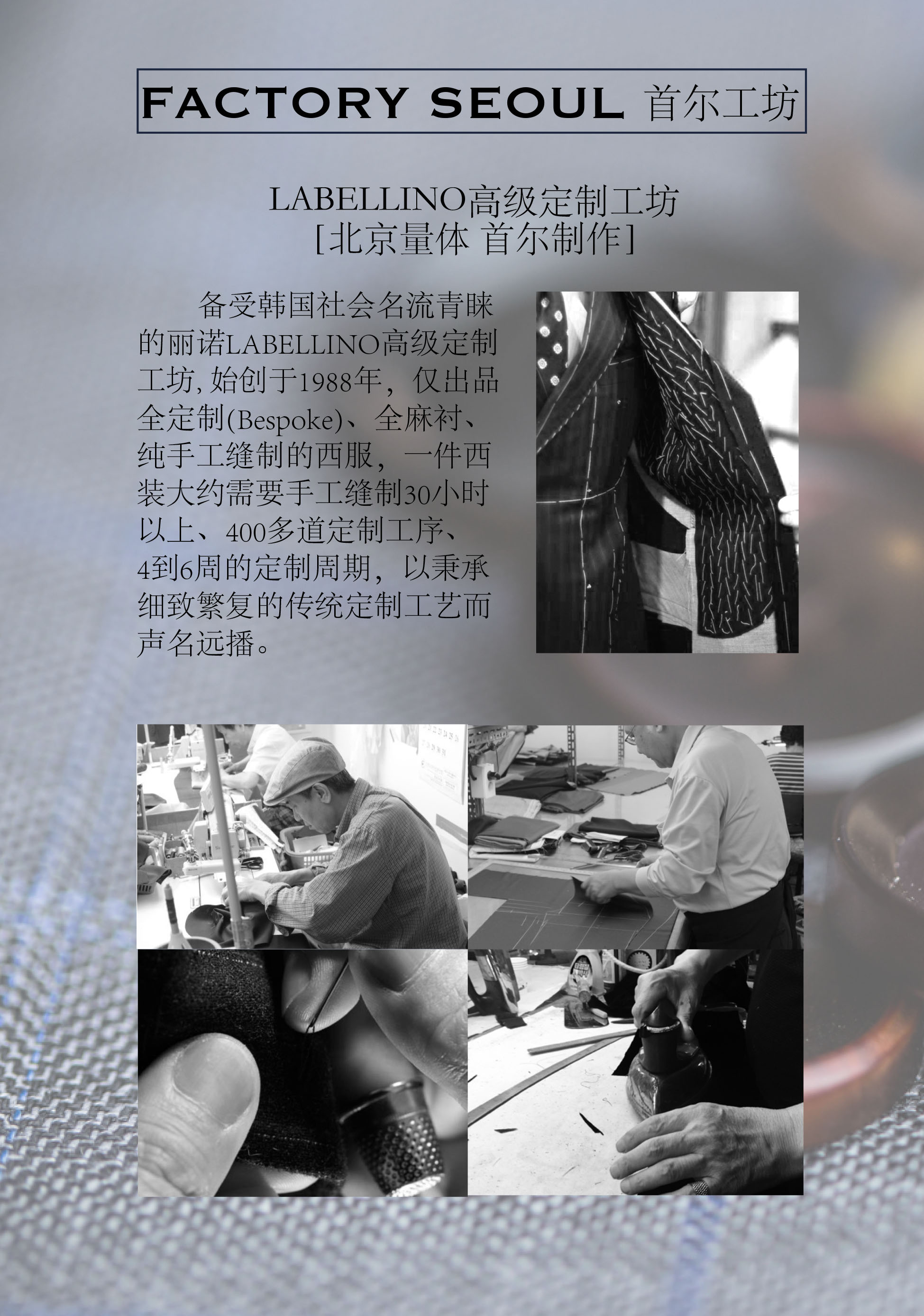 制作 :韩版修身立体剪裁,全麻衬,一人一版,全定制纯手工BESPOKE 工艺:手工缝制30小时以上、400多道定制工序、2-3次试衣修正,4到6周的定制周期