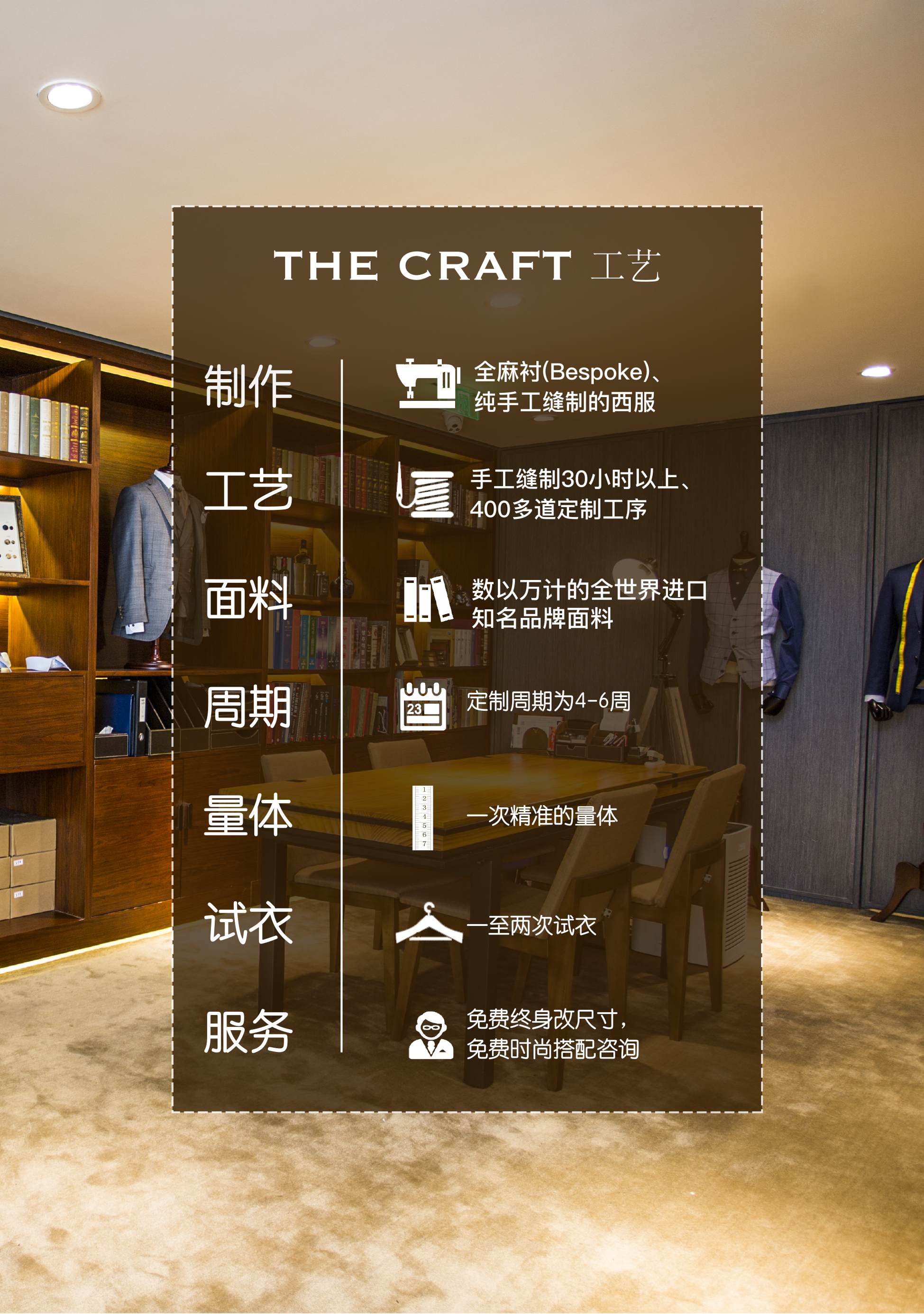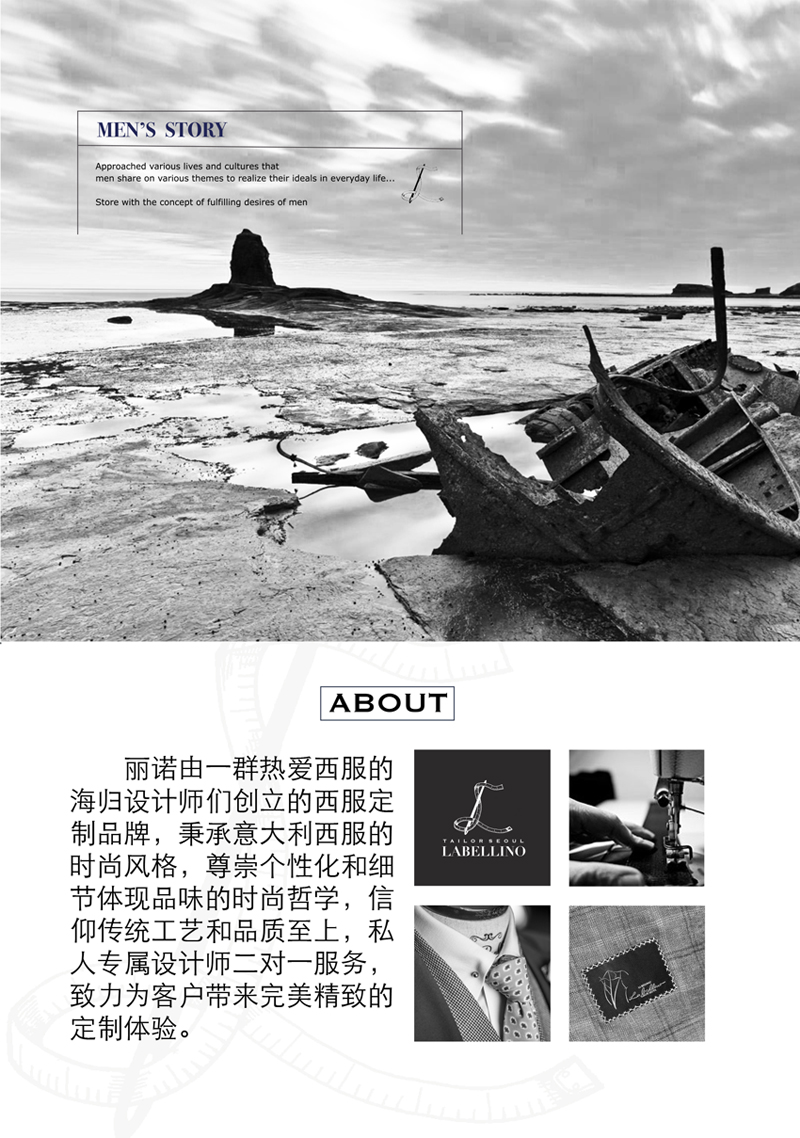 服务:海归设计师团队驻店量身设计、精细测量、二对一私人定制服务 售后:免费终身改尺寸 免费时尚搭配咨询