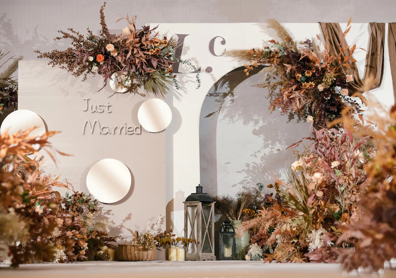 ① 3×(5-7)米立体背景设计搭建(根据所选套餐为准) ② 仿真花艺设计 ③ 新人专属Logo定制 ④ 西式摆件