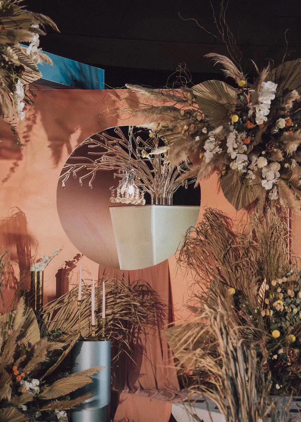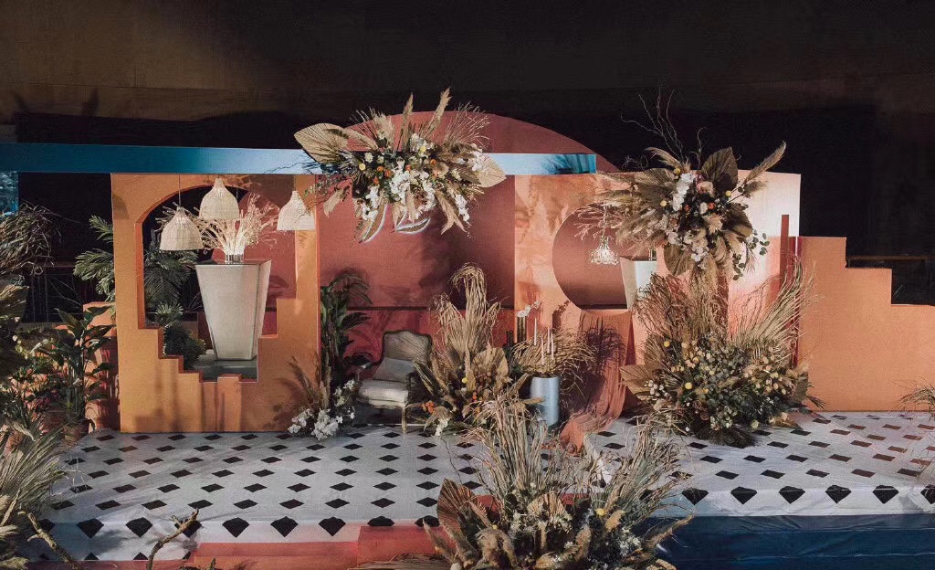 留影区、路引花柱、通道地毯、拱门、签到桌布置