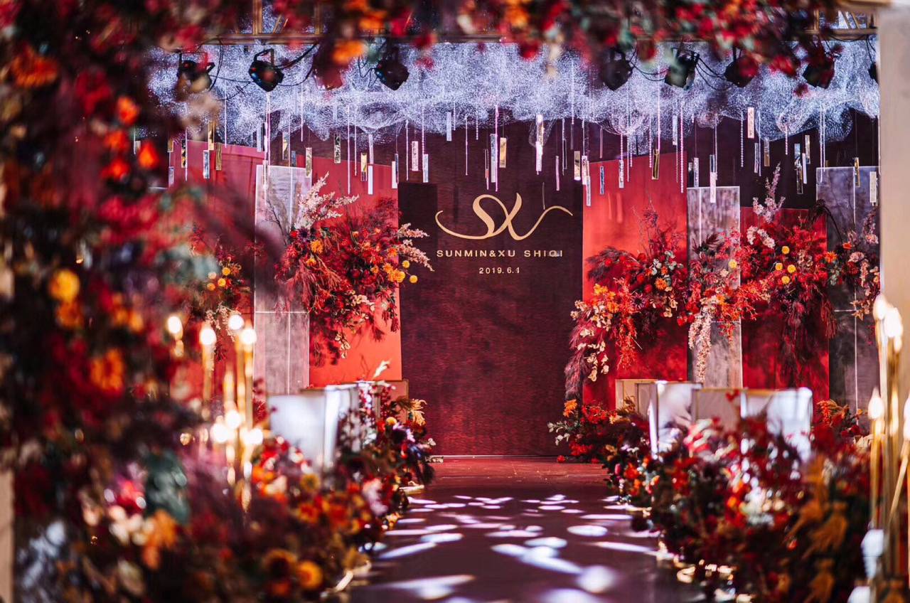 万达嘉华酒店 大气中式红蓝吊顶婚礼花艺满分