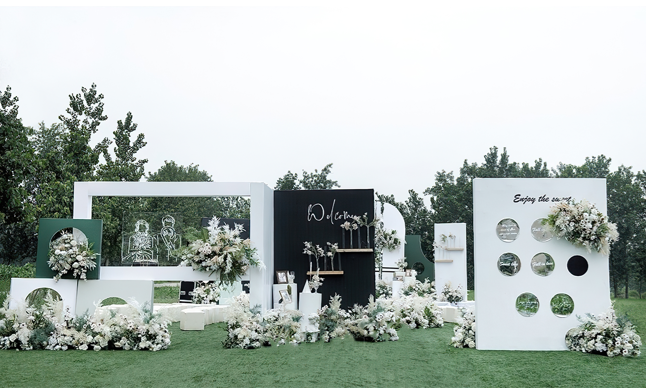- 签到区:桌子一张、户外主题签到造型设计一组,仿真花艺造型设计4组