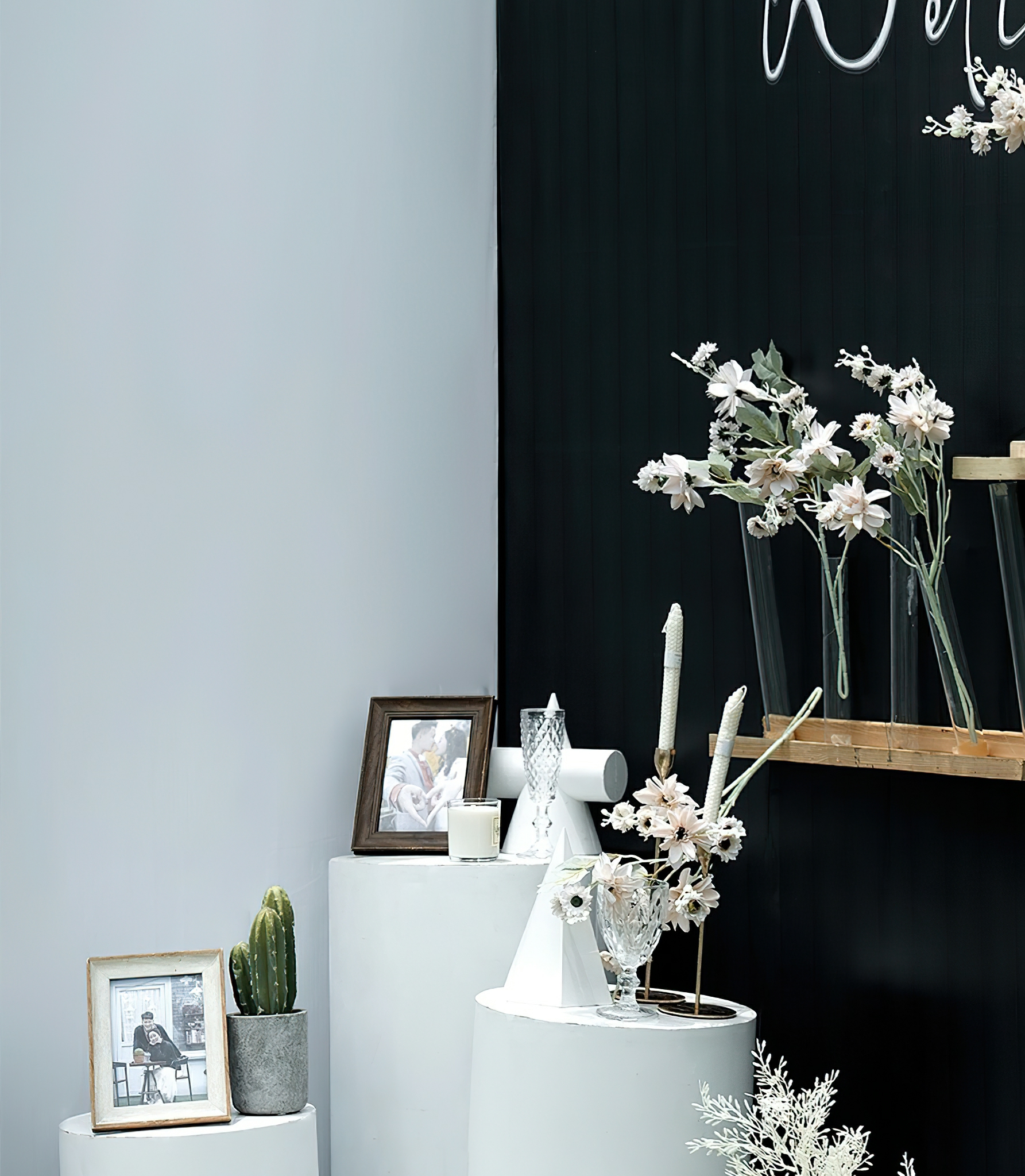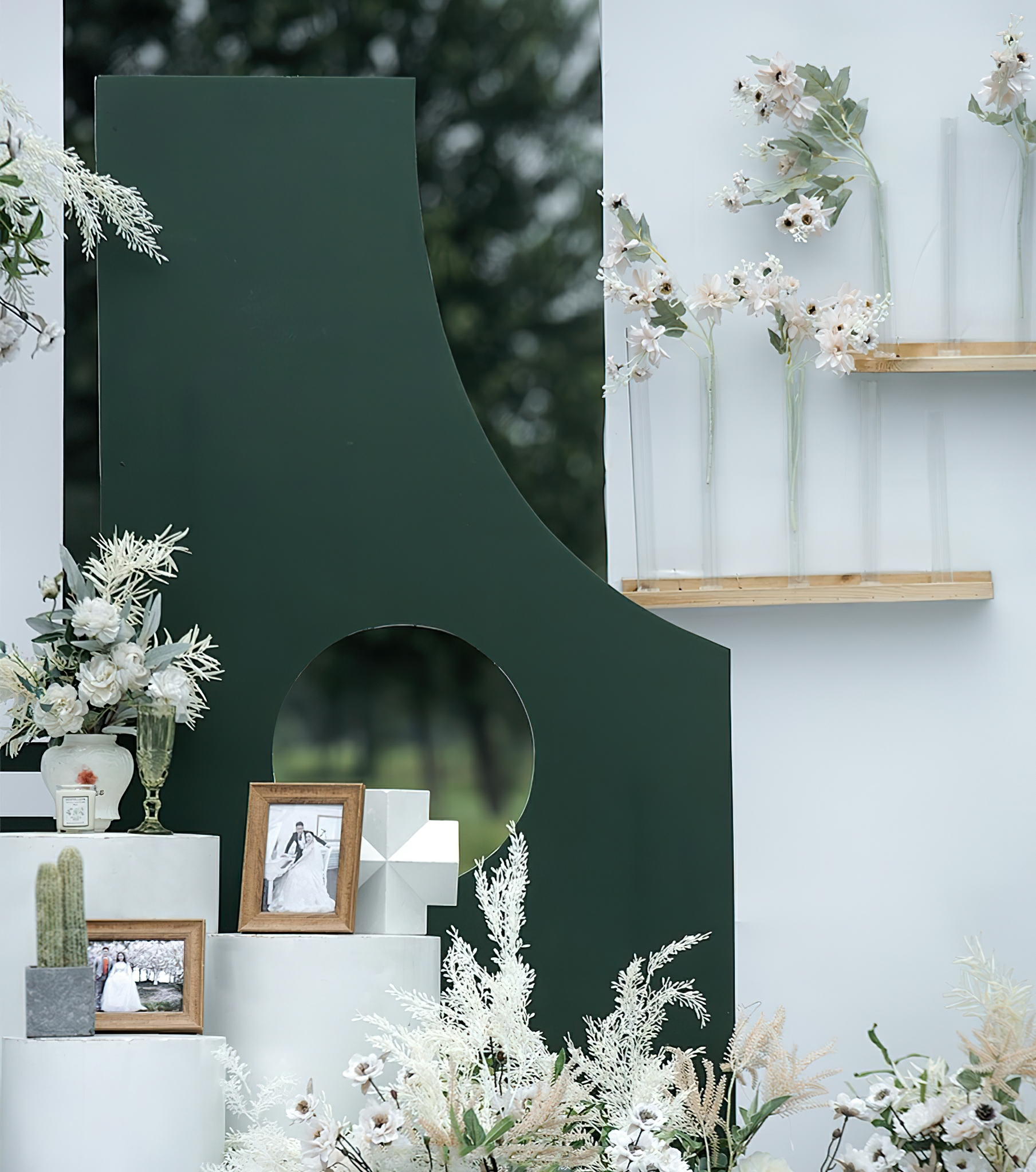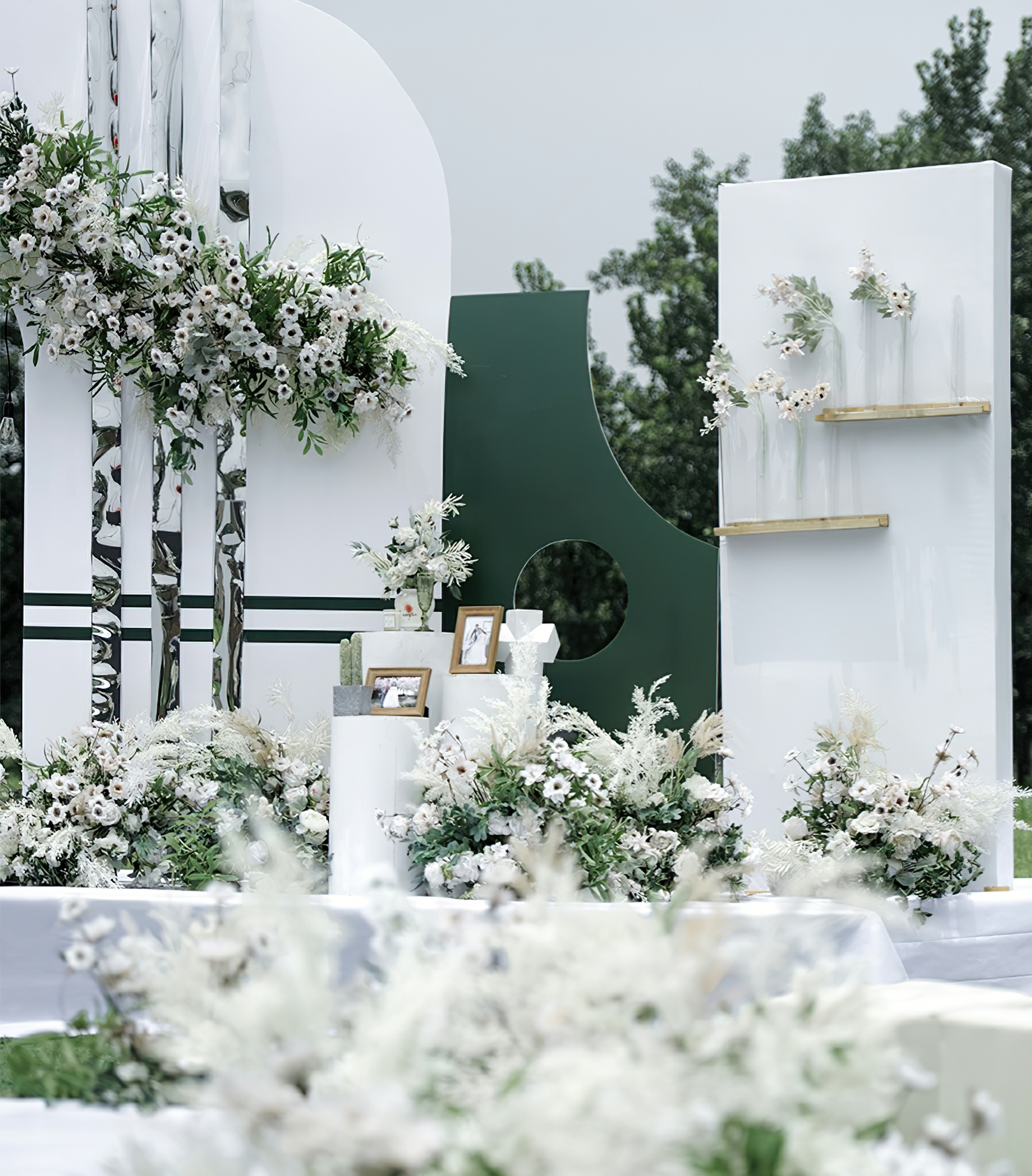 - 合影区:背景板设计一张,主题道具装饰1组,仿真花艺造型设计8组 - - 甜品区:甜品桌一张,甜品区背景造型一组,仿真花艺造型5组