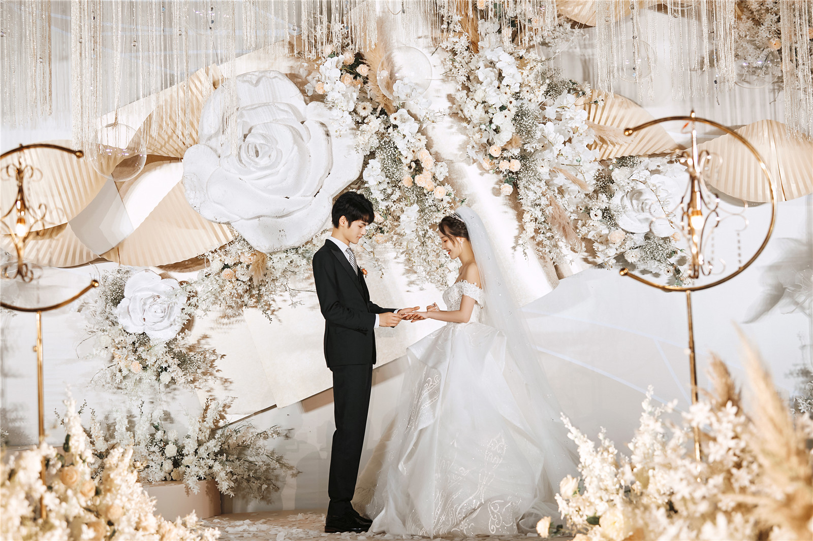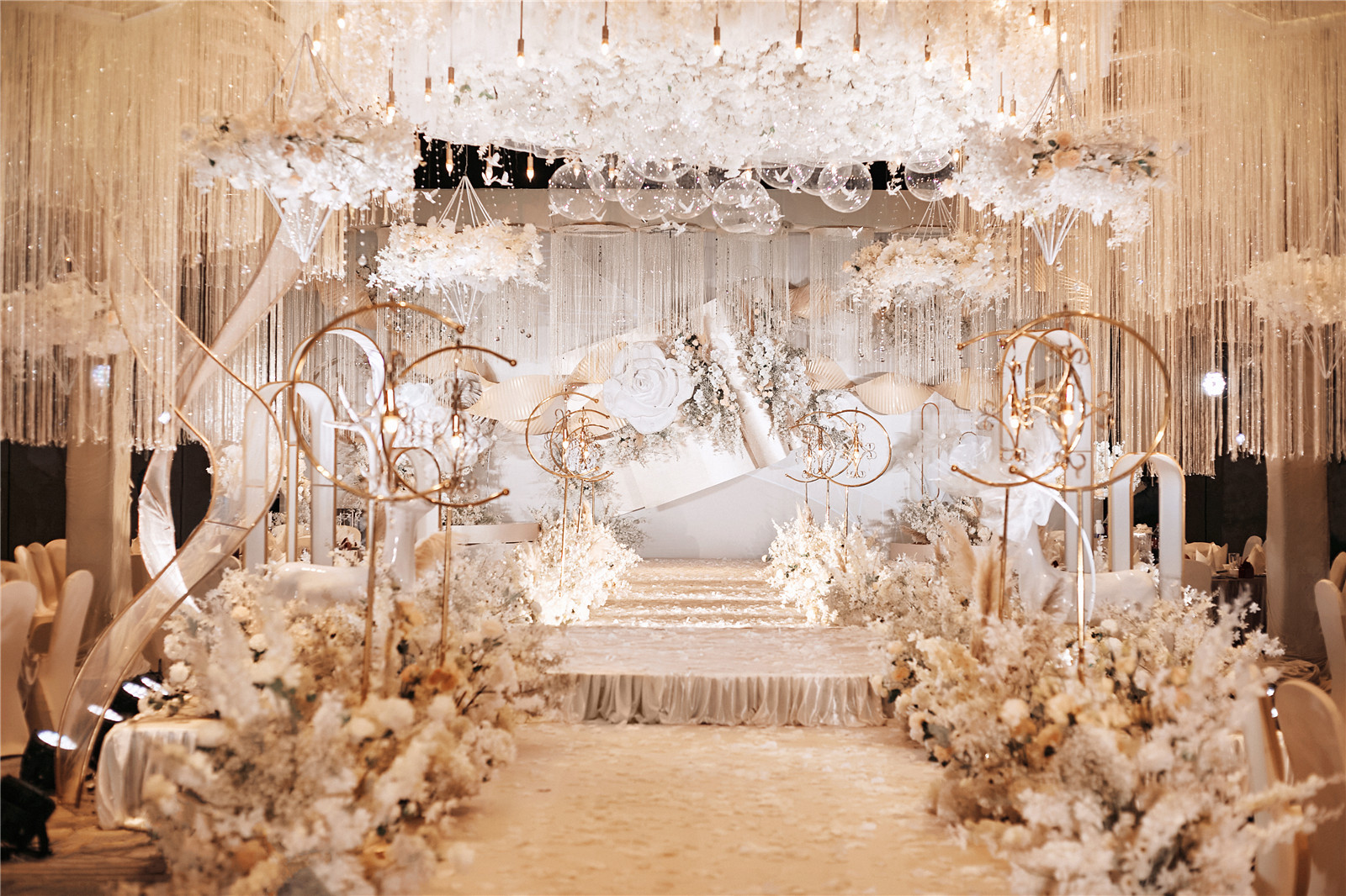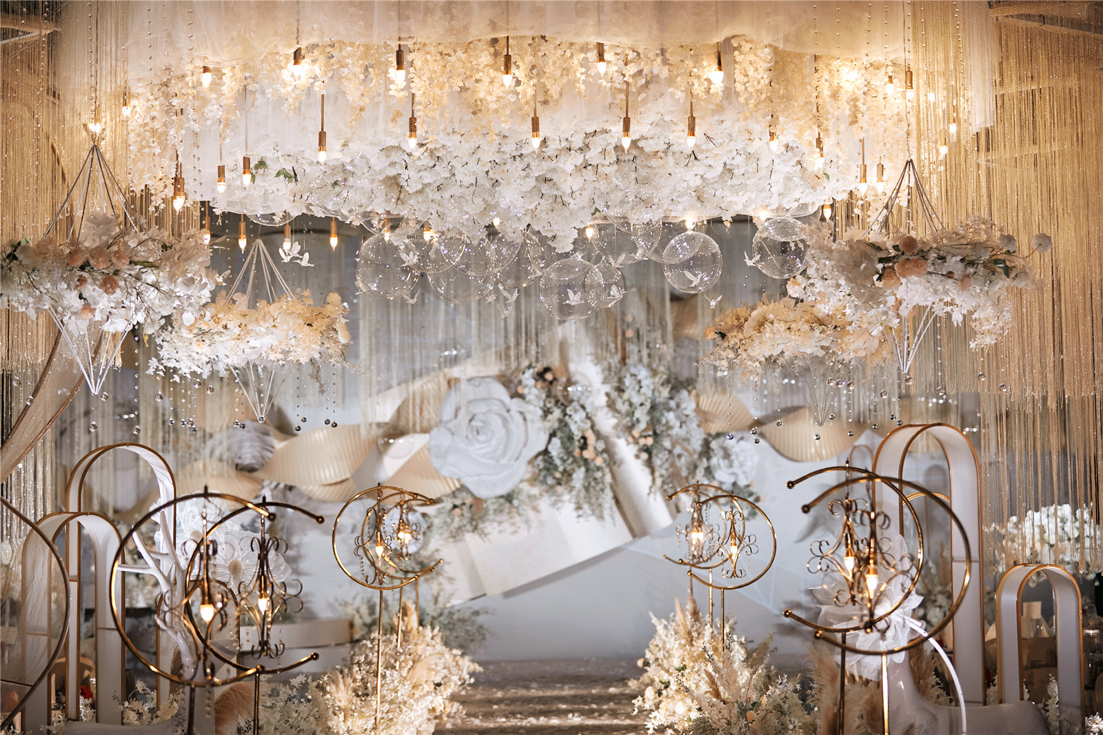 4路引花艺共6组,真花:仿真花=3:7,直径不小于60cm,颜色根据主题色调调整更换。
