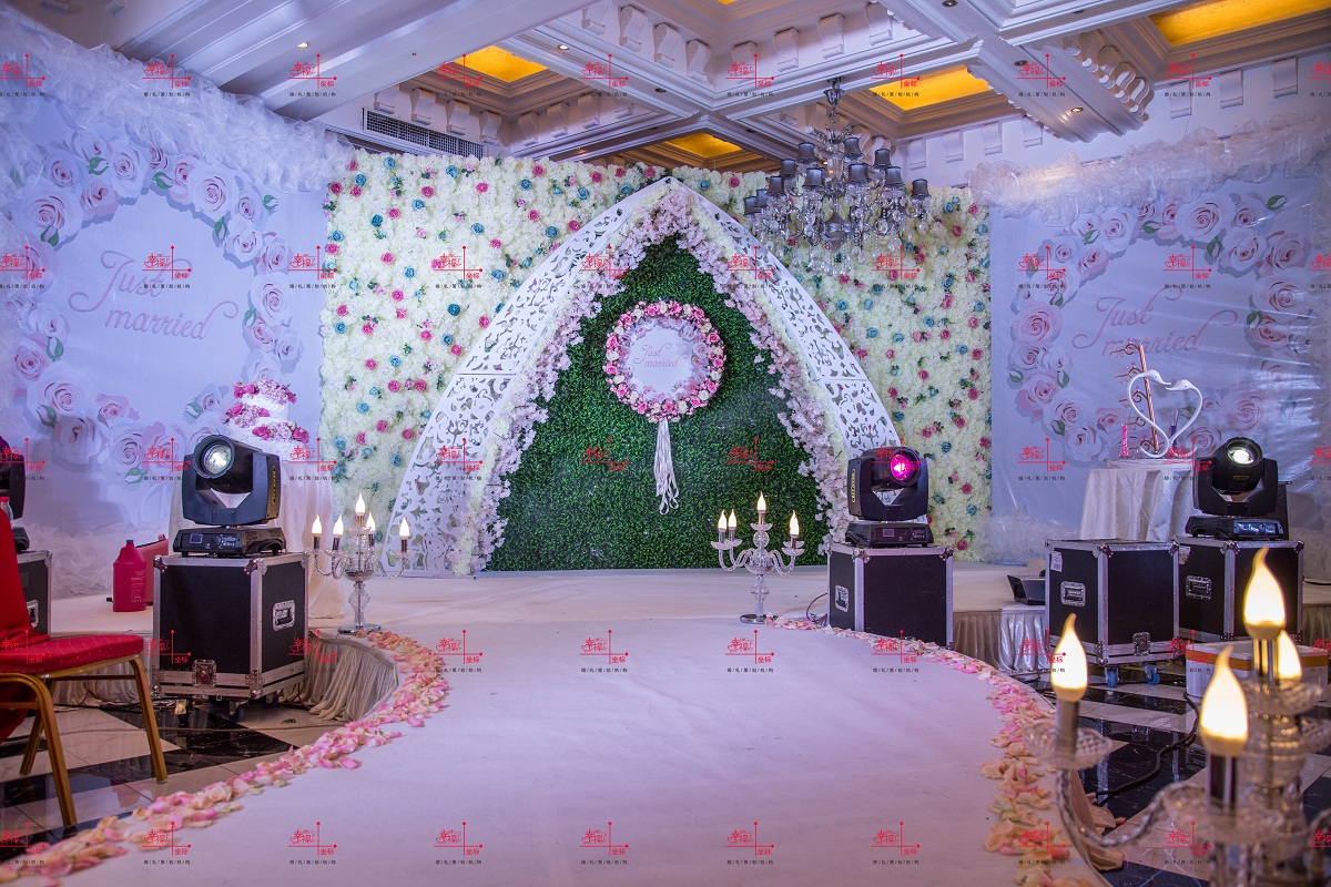 (4)仪式道具:圆形道具桌+桌布2套(桌面铺设主题色系华丽绸缎桌布及花瓣装饰)