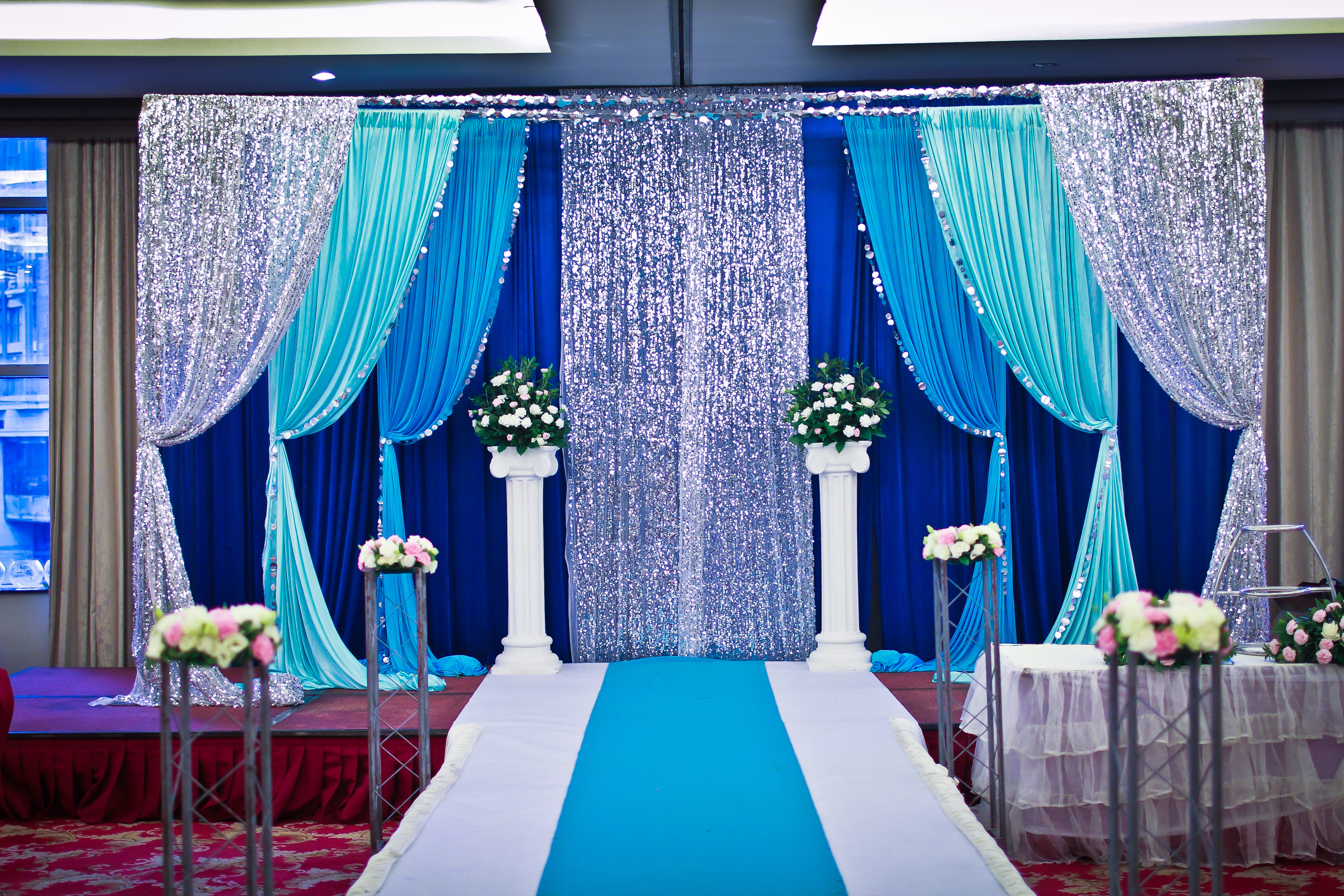 使用纱幔或色丁布、亮片布的精致布艺材料为新人装饰仪式台,成为婚礼现场一道靓丽的风景线