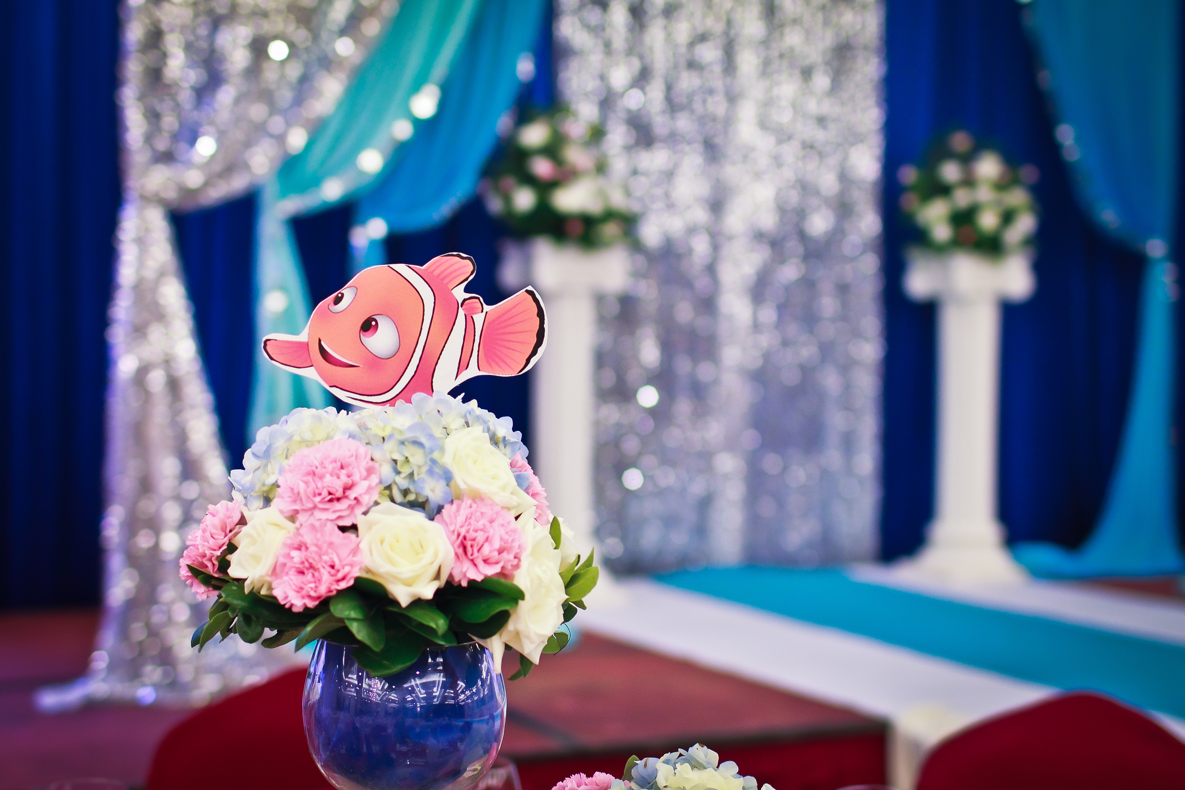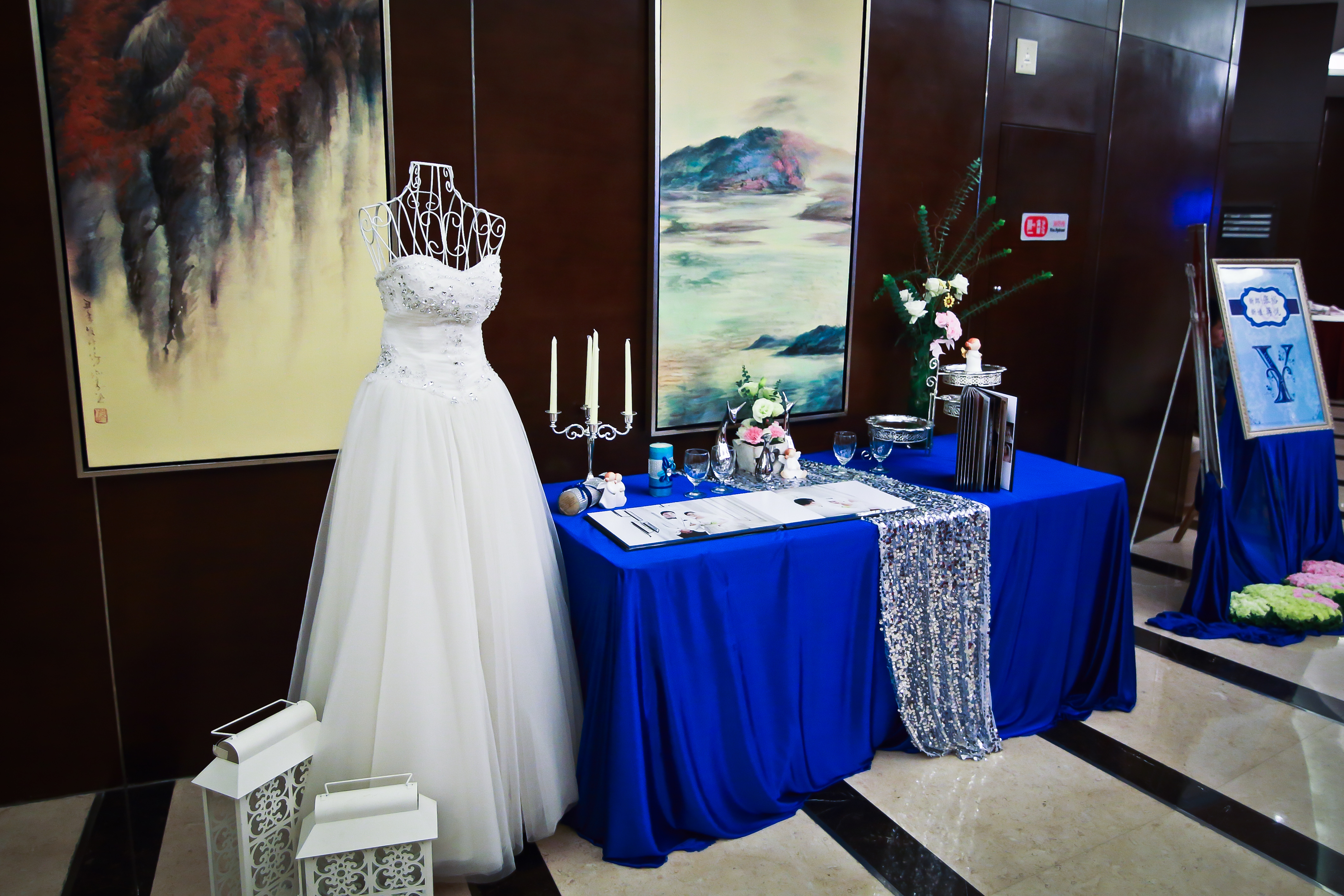 签到桌上的鲜花装饰,花球不少于2个,每个直径不小于20厘米,可高低错落摆放,亦可浮案放置,使宾客签到时即可感受到婚礼的浪漫芳香