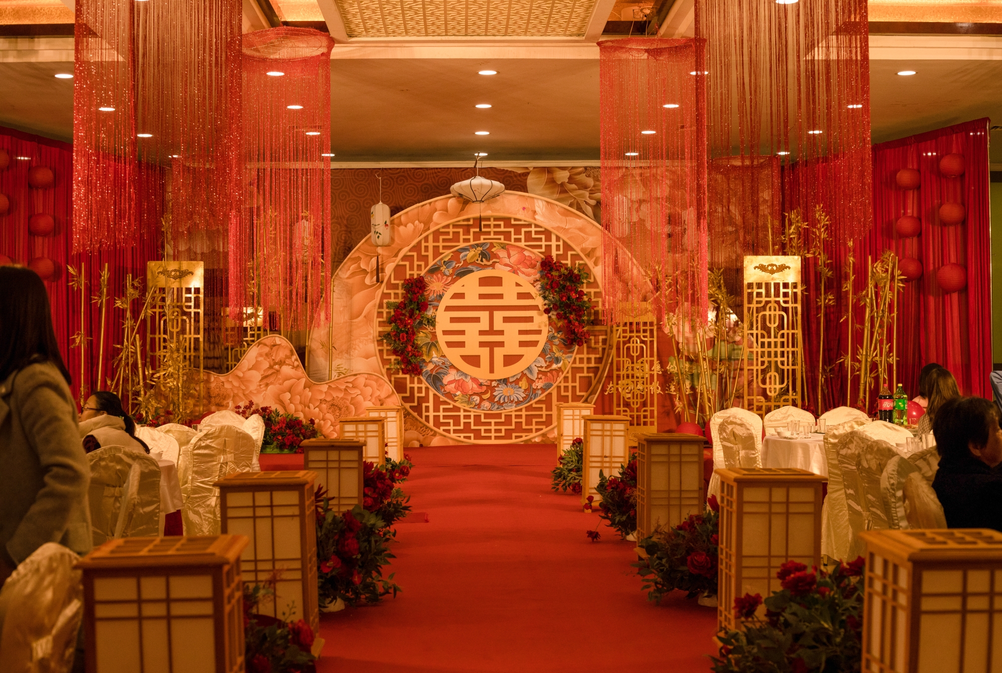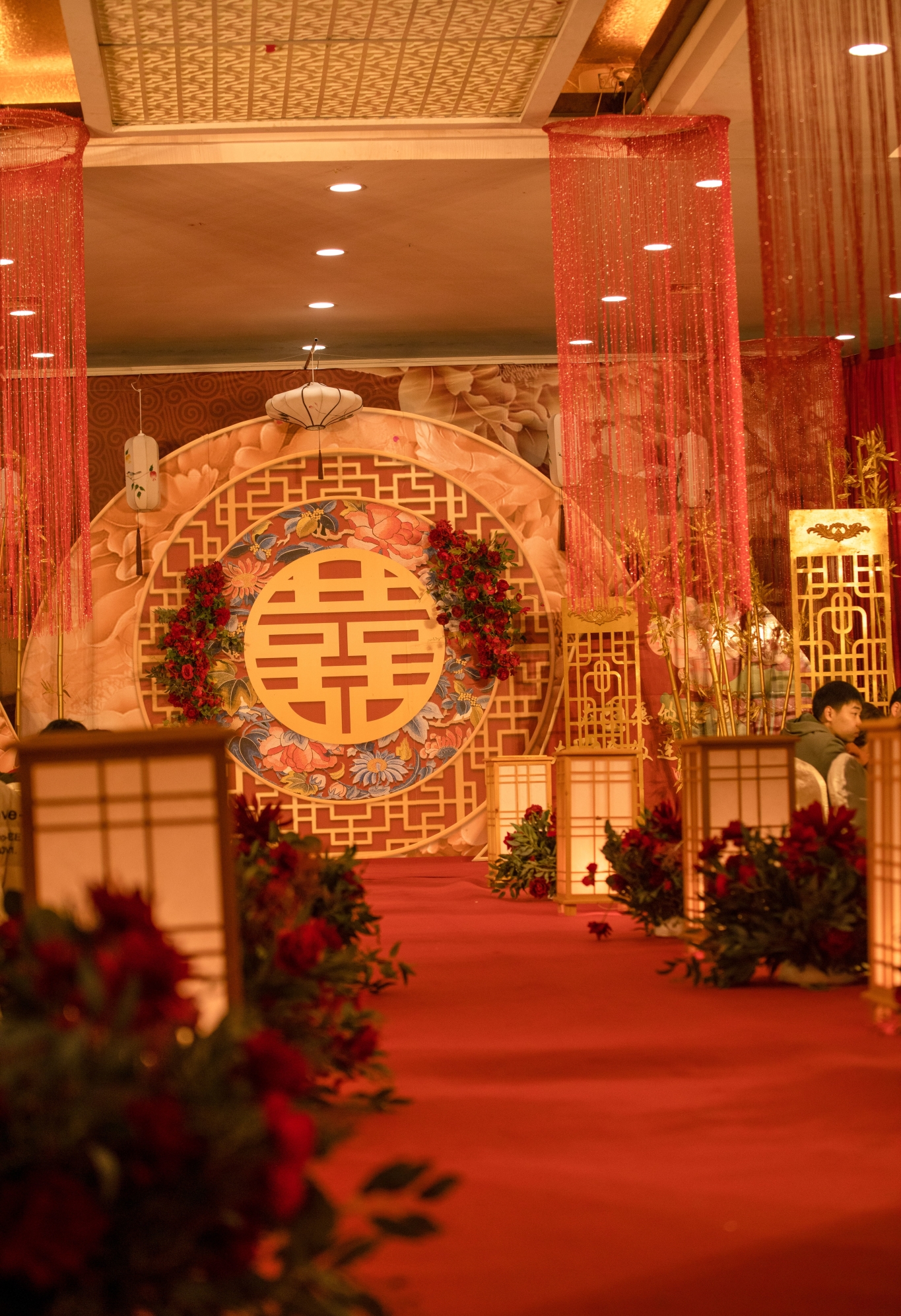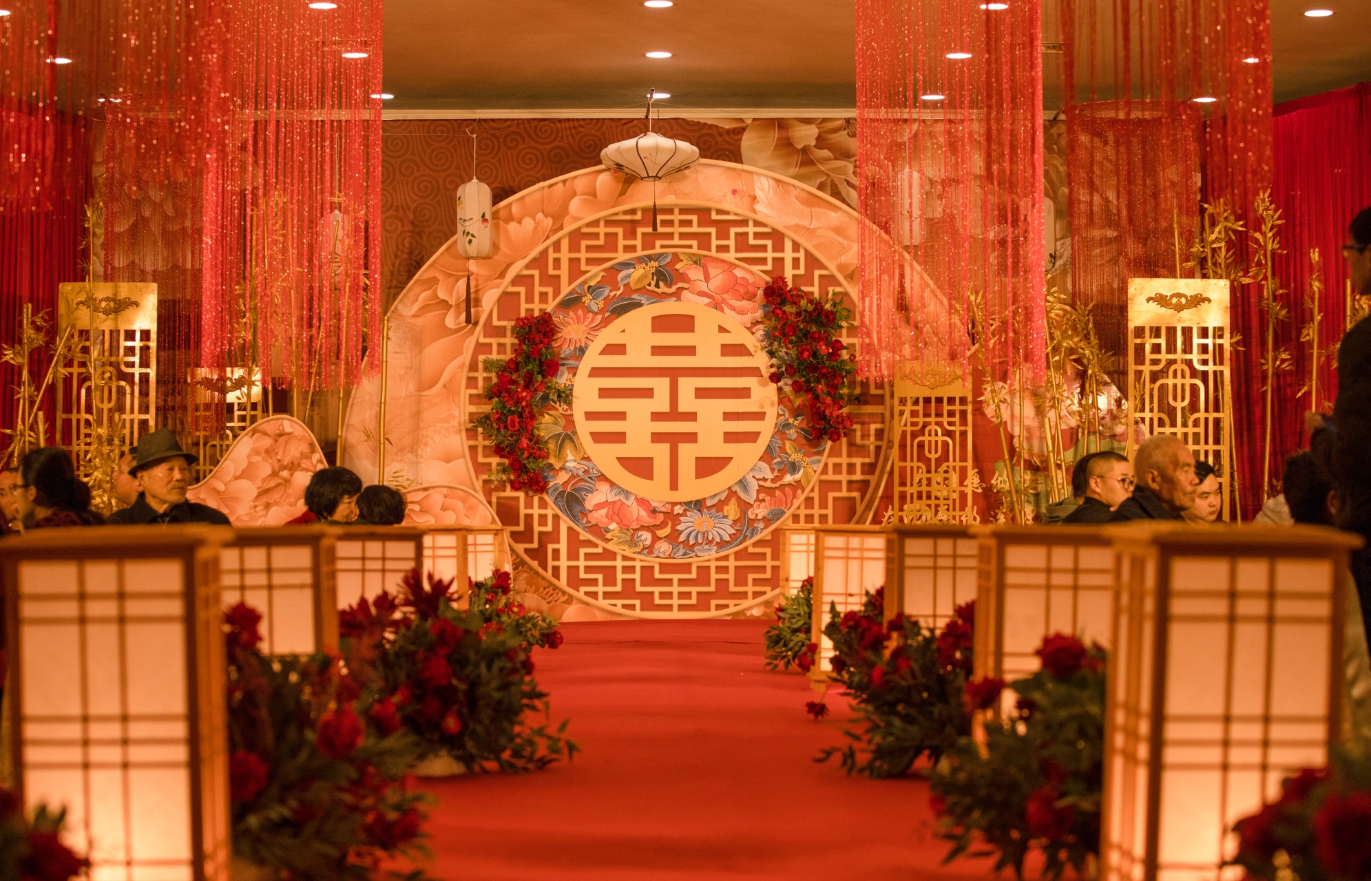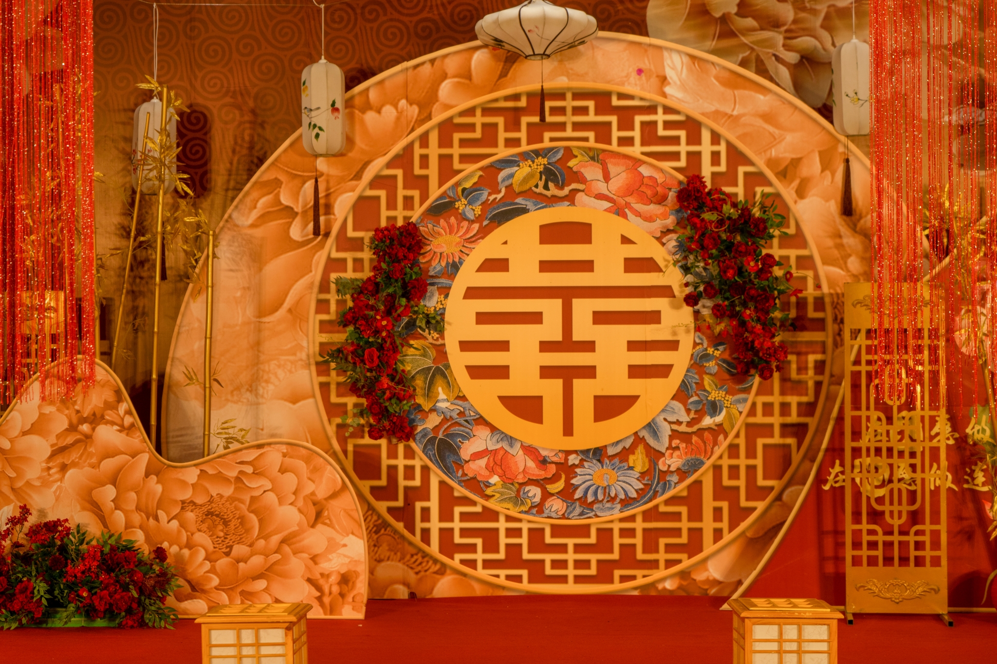 主仪式区设计中国红的纱幔打底,牡丹主题背景板设计造型; 中国镂空雕花屏风的融入使舞台更用层次感; 两个红色牡丹花的设计,体现了一对新人对古都牡丹的一种情怀! 出场仪式区设计中国式红色大门,大气、喜庆!
