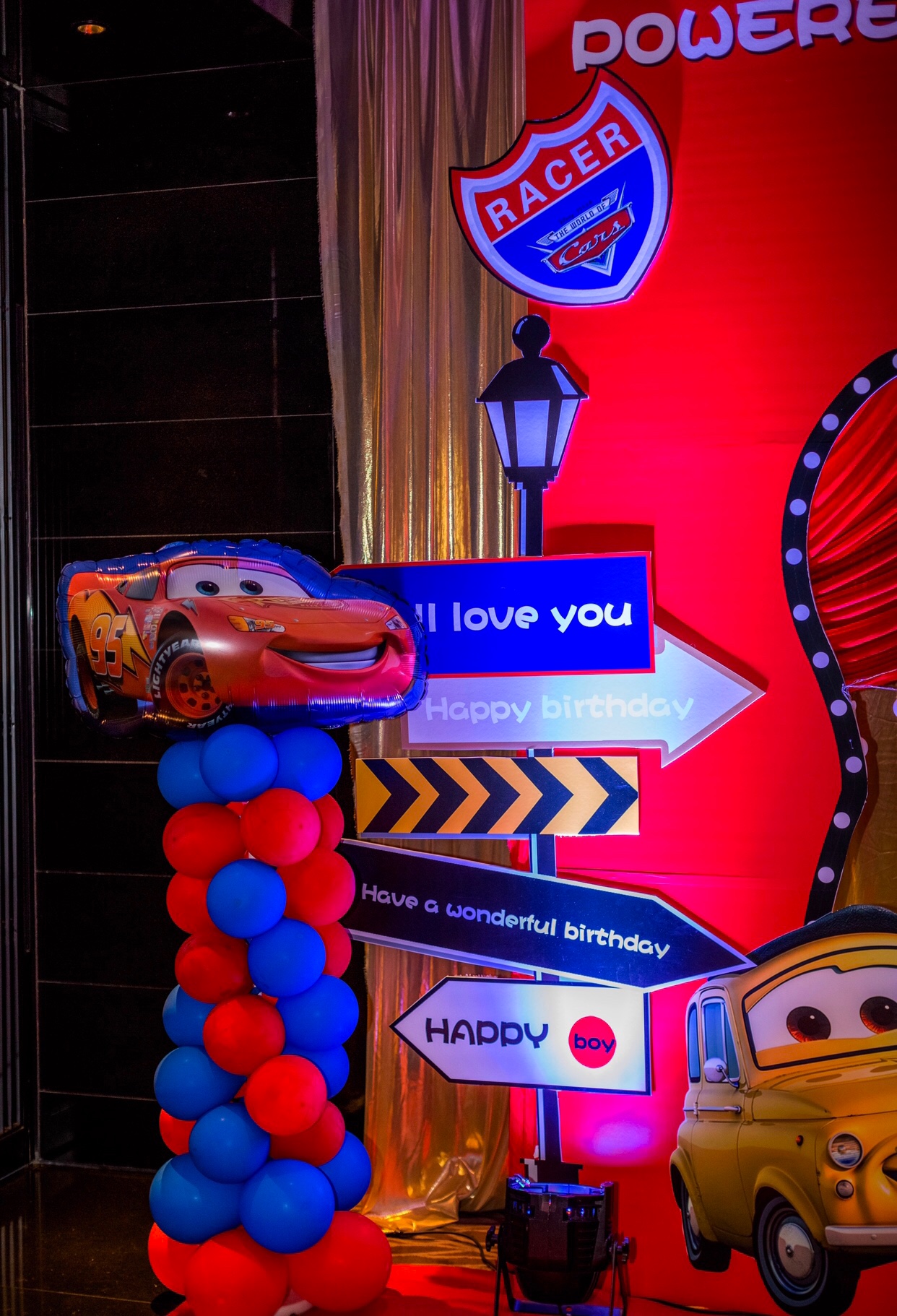 主背景布置搭建,气球立柱6组。帕灯4组