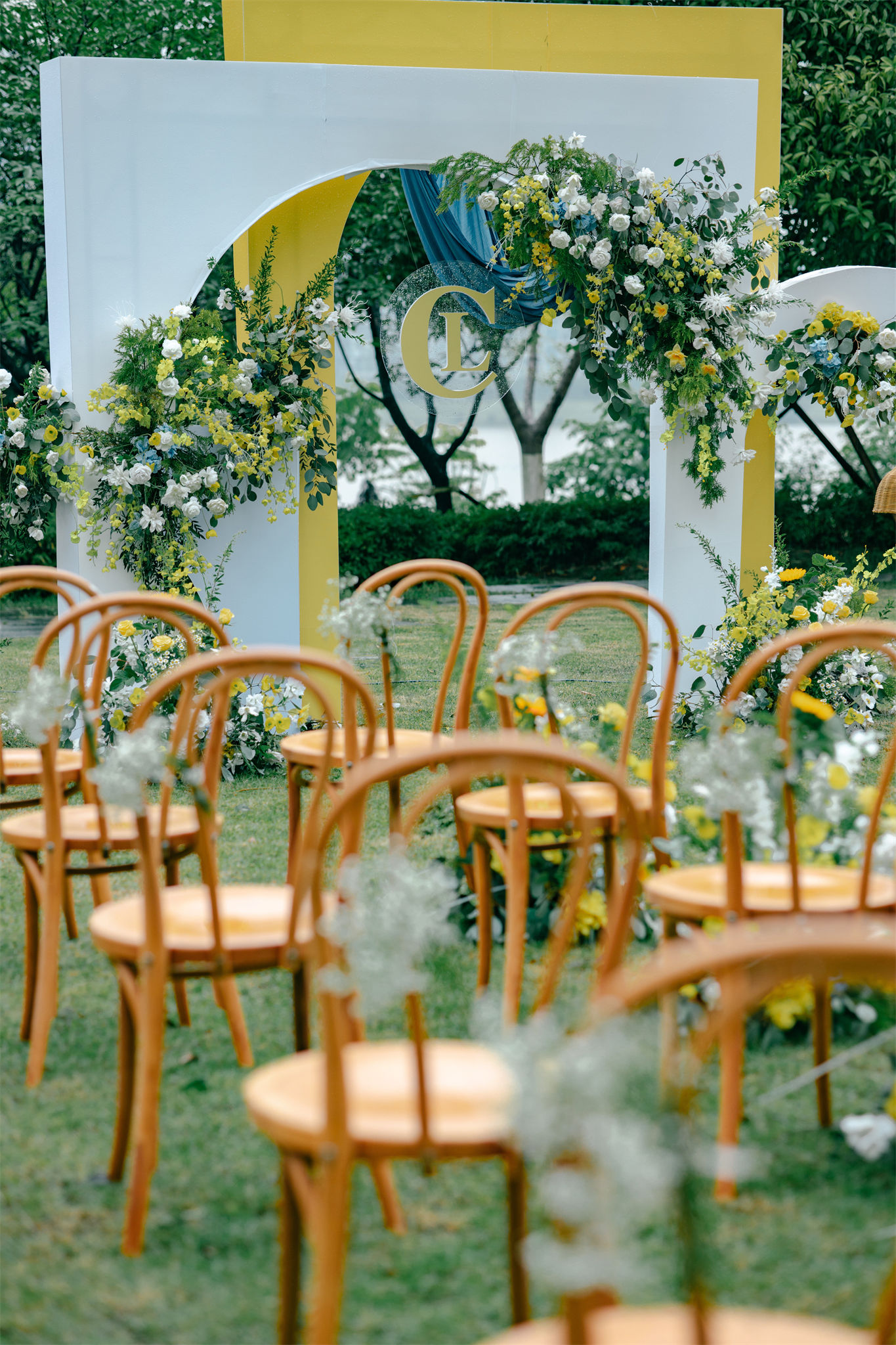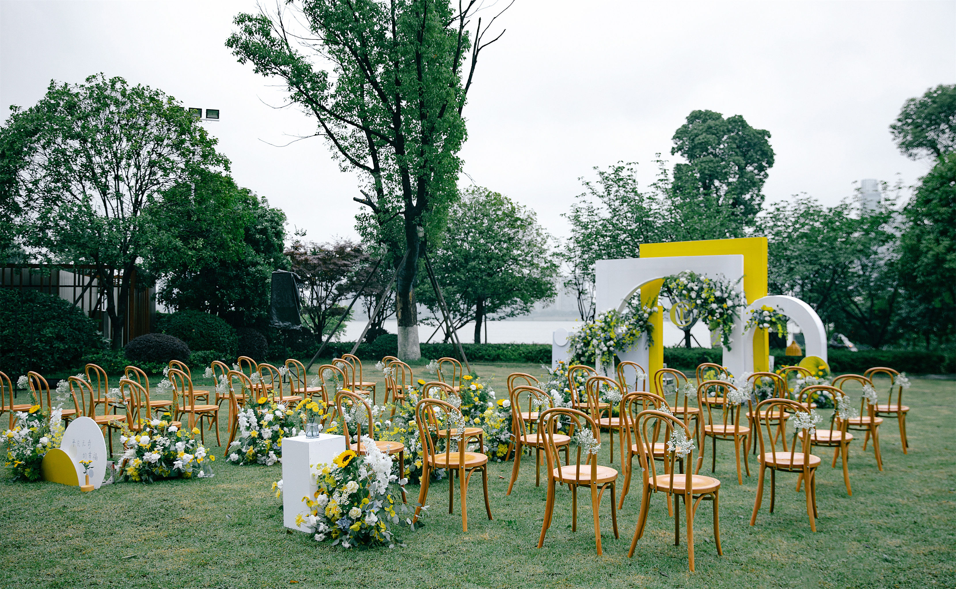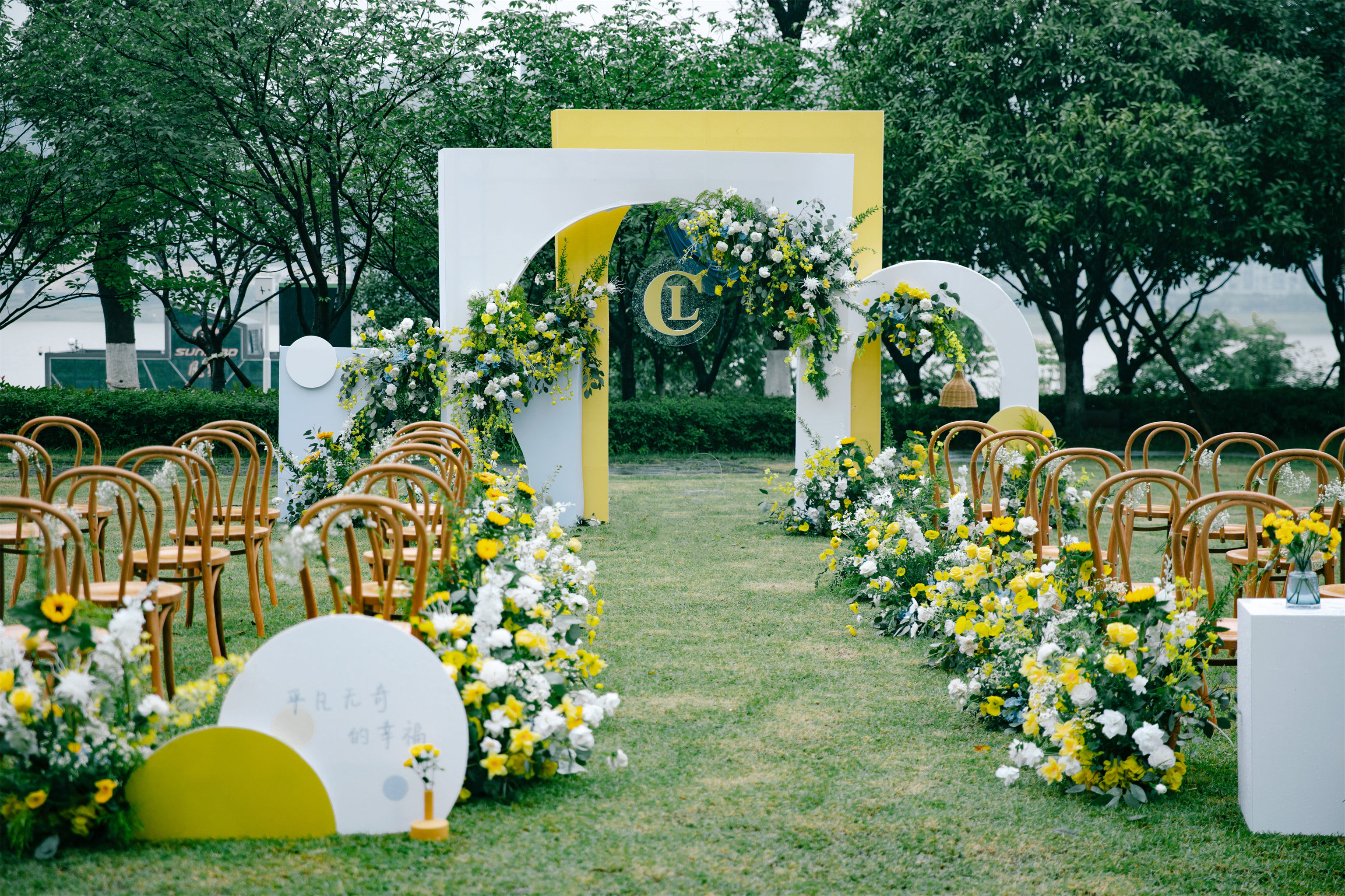 户外草坪黄色系小清新婚礼布置