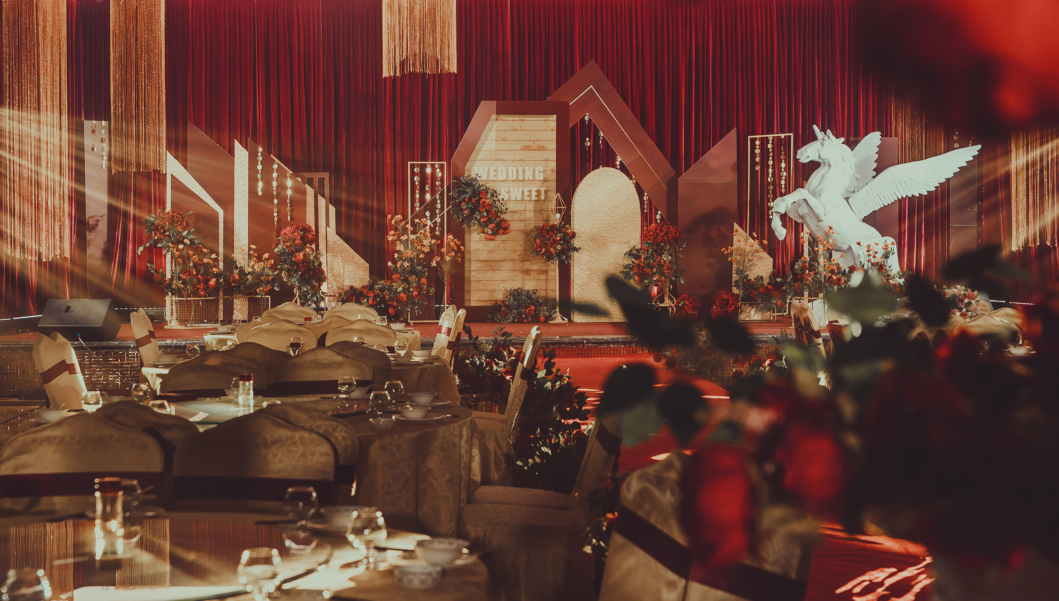 ·中式主题舞台布置(主题色系纱幔+喷绘设计搭配)