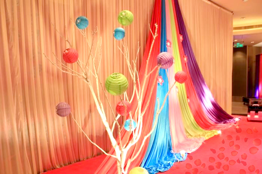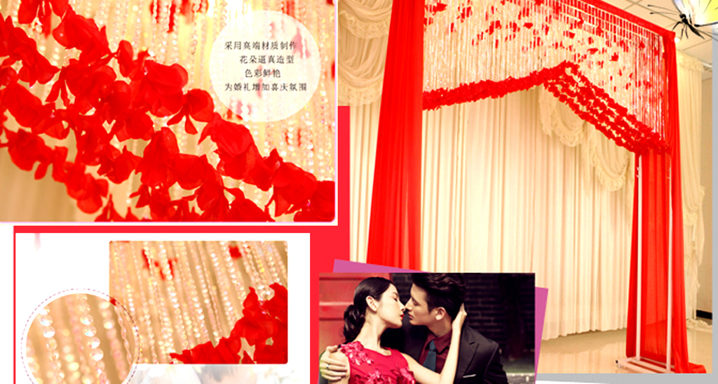 主题色迎宾创意幔纱背景(根据舞台大小调整尺寸最大尺寸4乘8米),可选LED串灯装饰、发光WEDDING牌装饰可选。