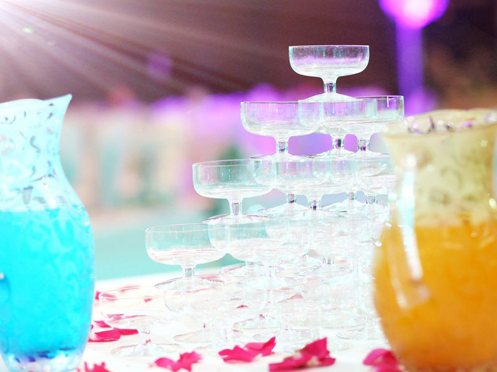 创意七彩流沙塔(含彩纱一组,水晶琉璃瓶两个)或创意发光香槟塔一组任选其一。许愿沙是新人在仪式过程中用于表达感情的必备工具,新郎、新娘需要将两种颜色的爱情之沙倒入一个容器中,预示着爱情在此时完美融合。