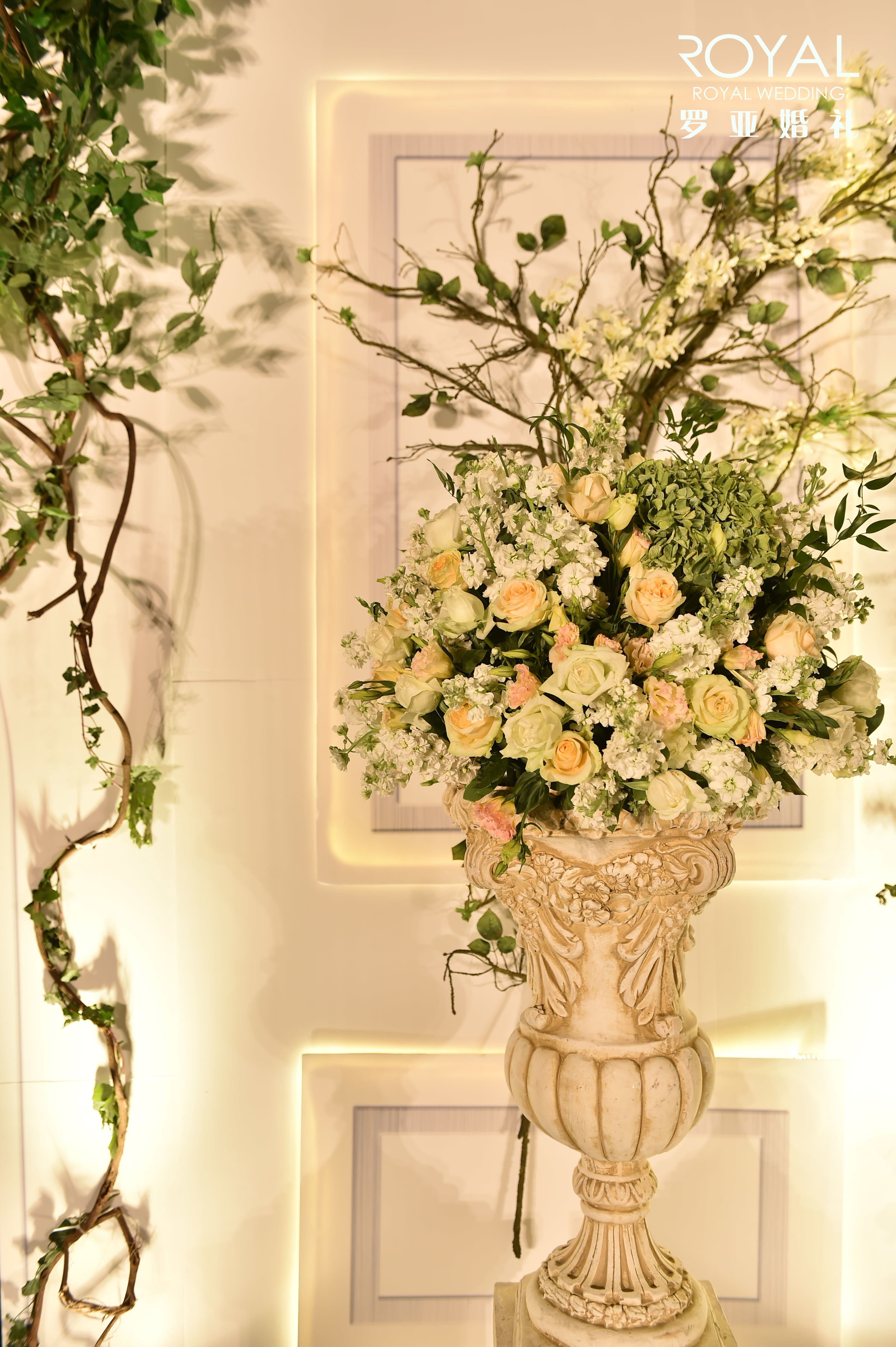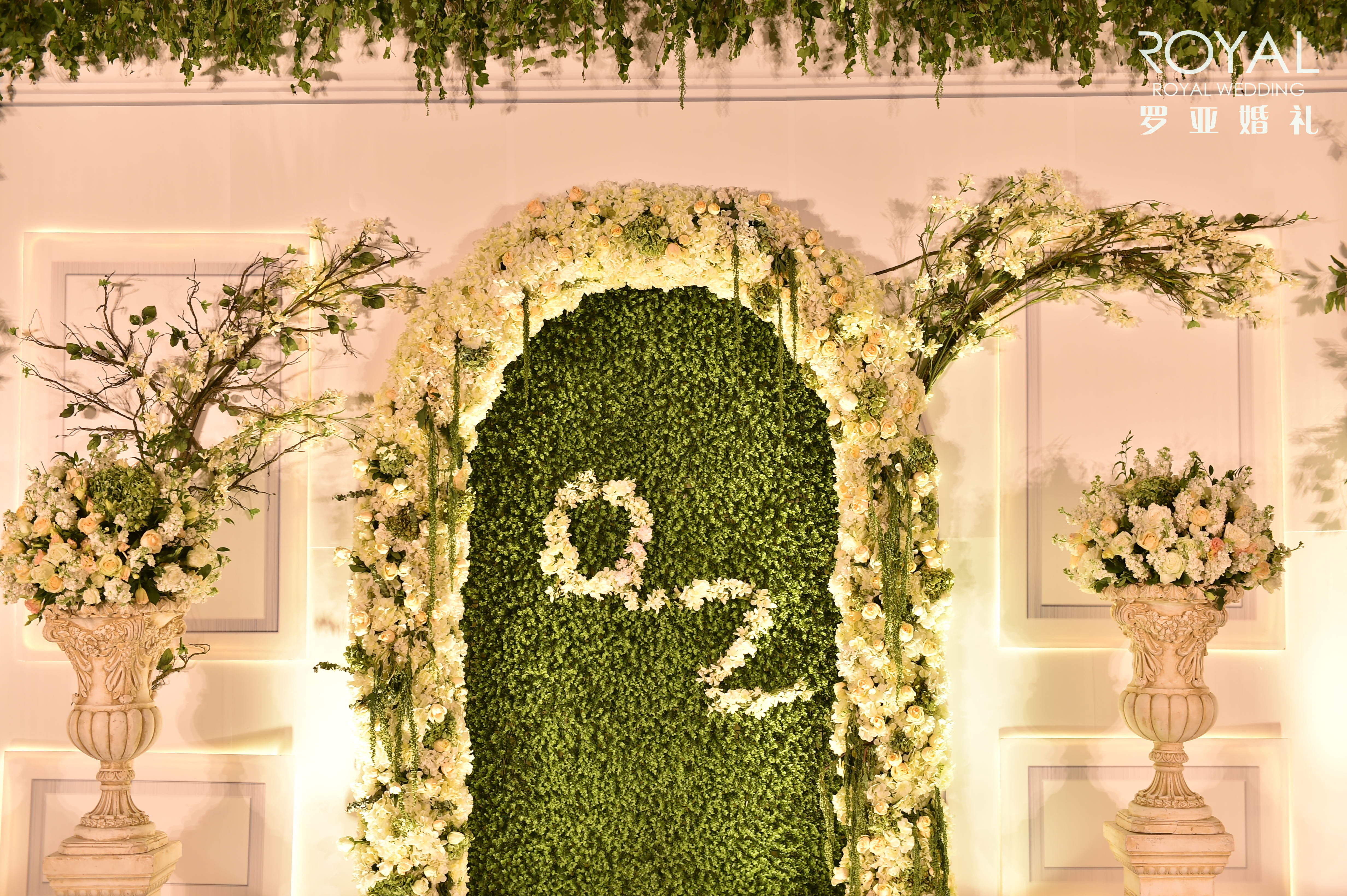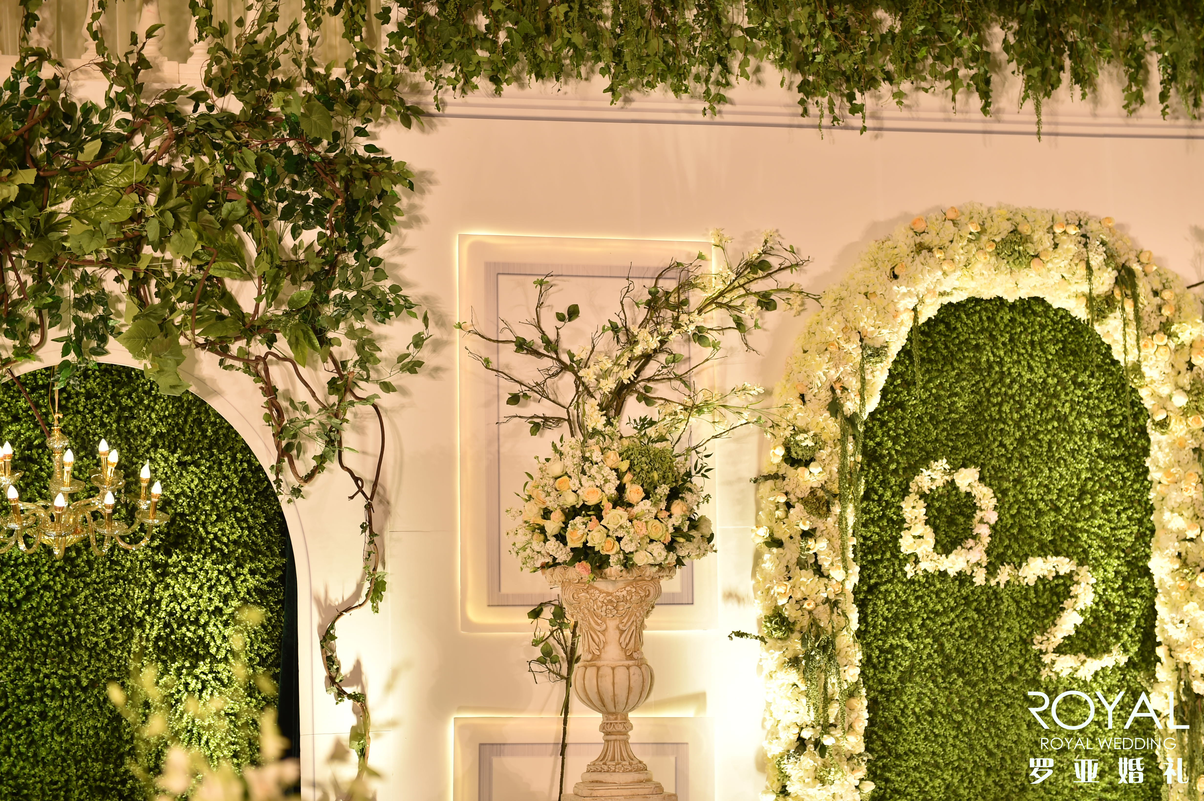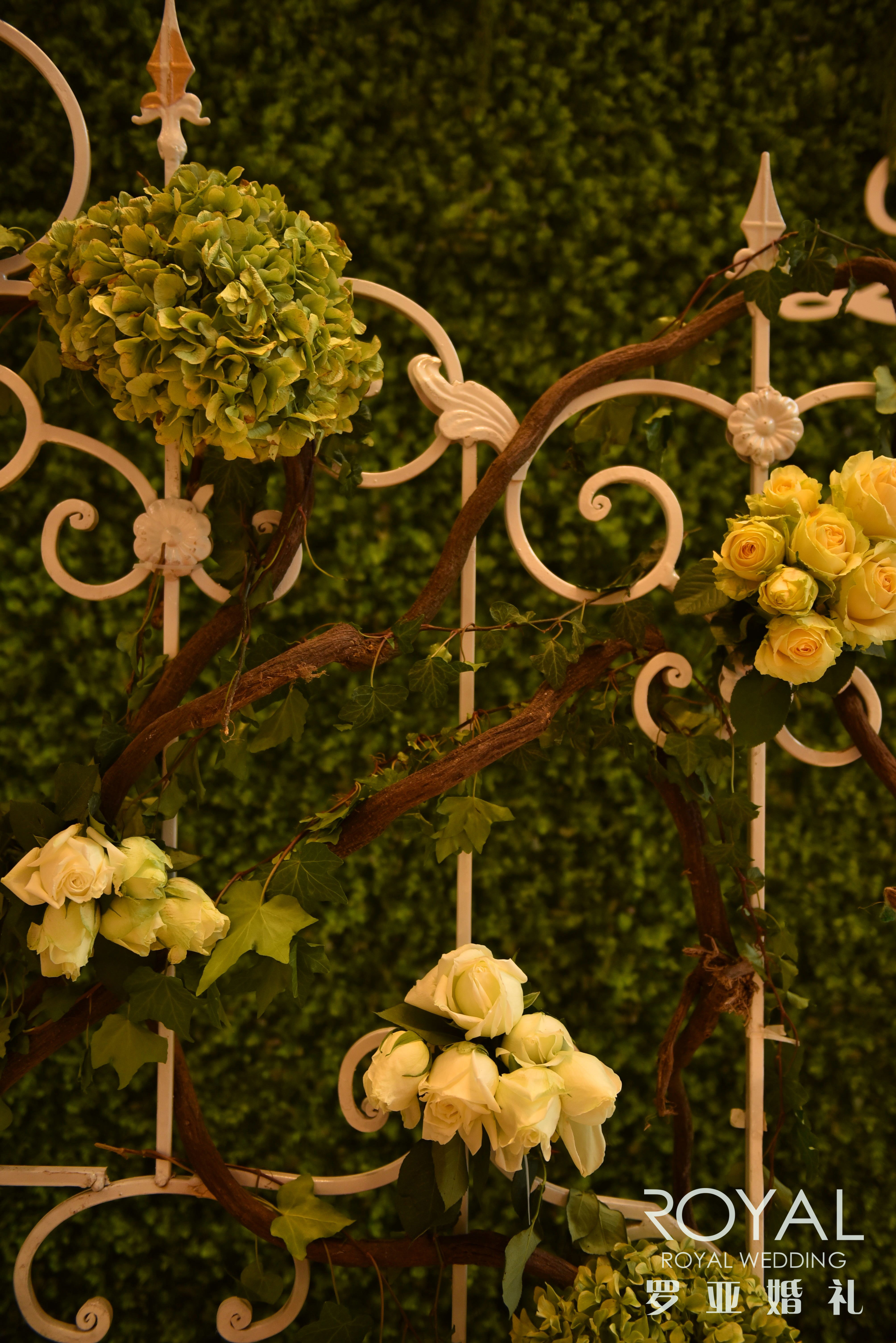 两边白色铁架搭配仿真绿色常青藤及绢花花艺装饰点缀2组