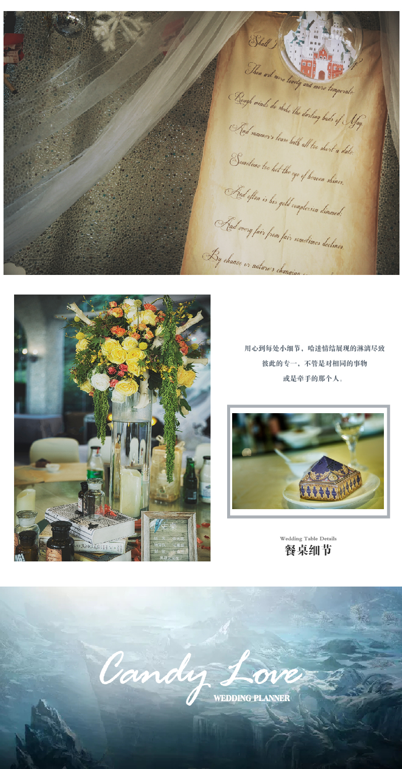 套餐内的方案构思、场地布置、喜好需求、报价明细等婚礼细节,我们都将为您专属定制,会根据每一对客人的喜好要求结合场地情况和预算做整体方案及报价。100%的专业加100%的热情等于您选择我们。