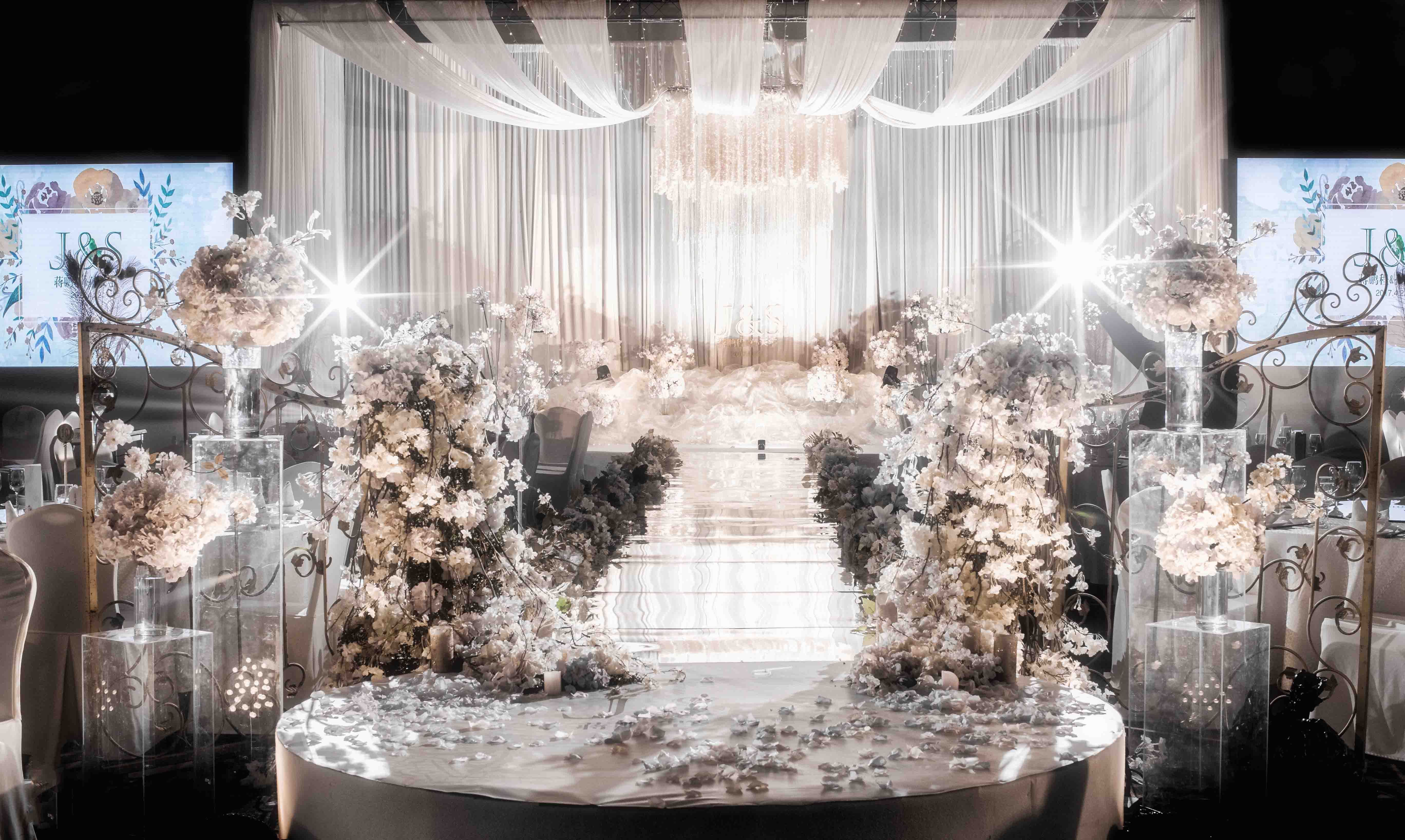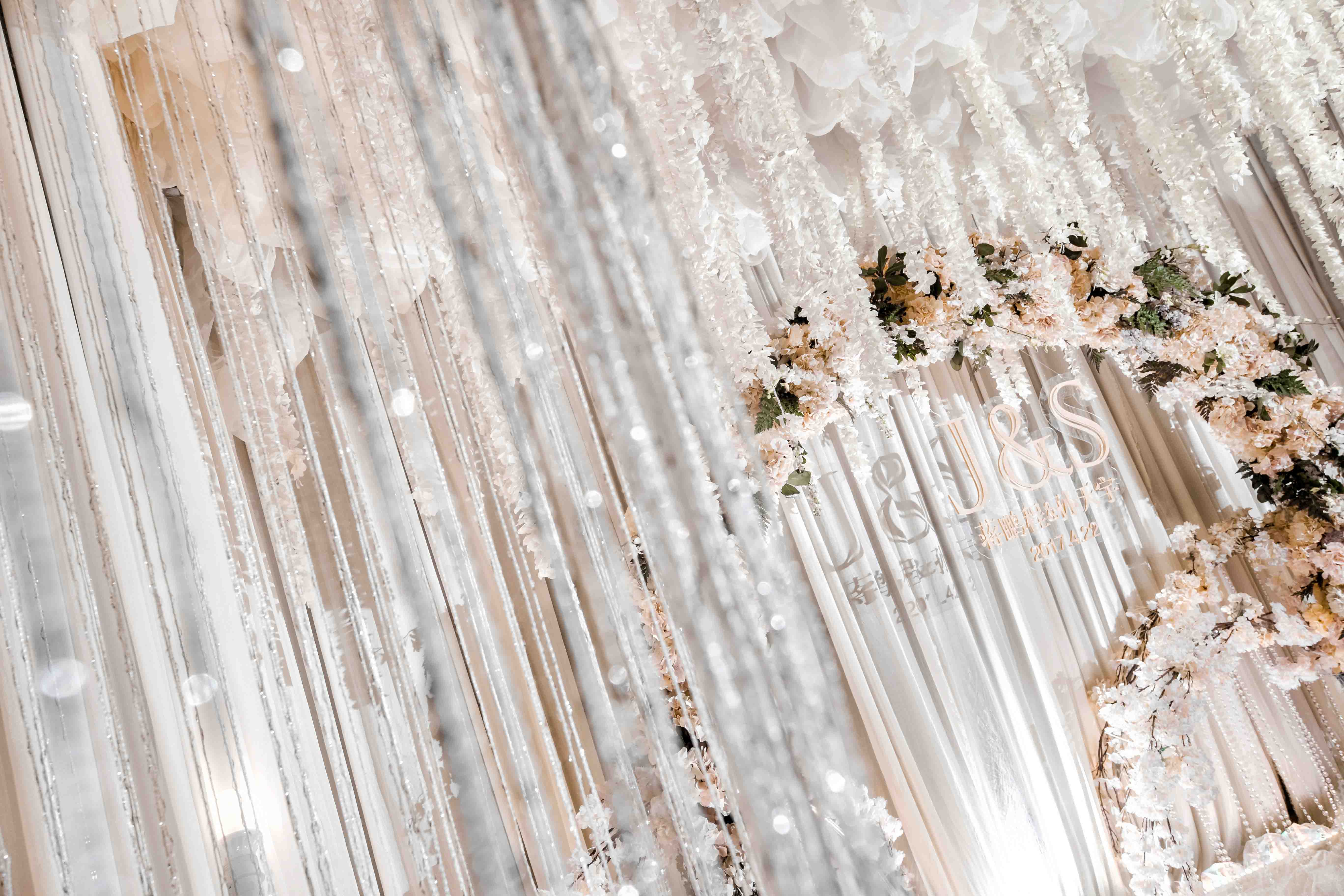 大大小小的花艺半圆,层叠的花串与纱幔,龙珠灯点缀在其中。