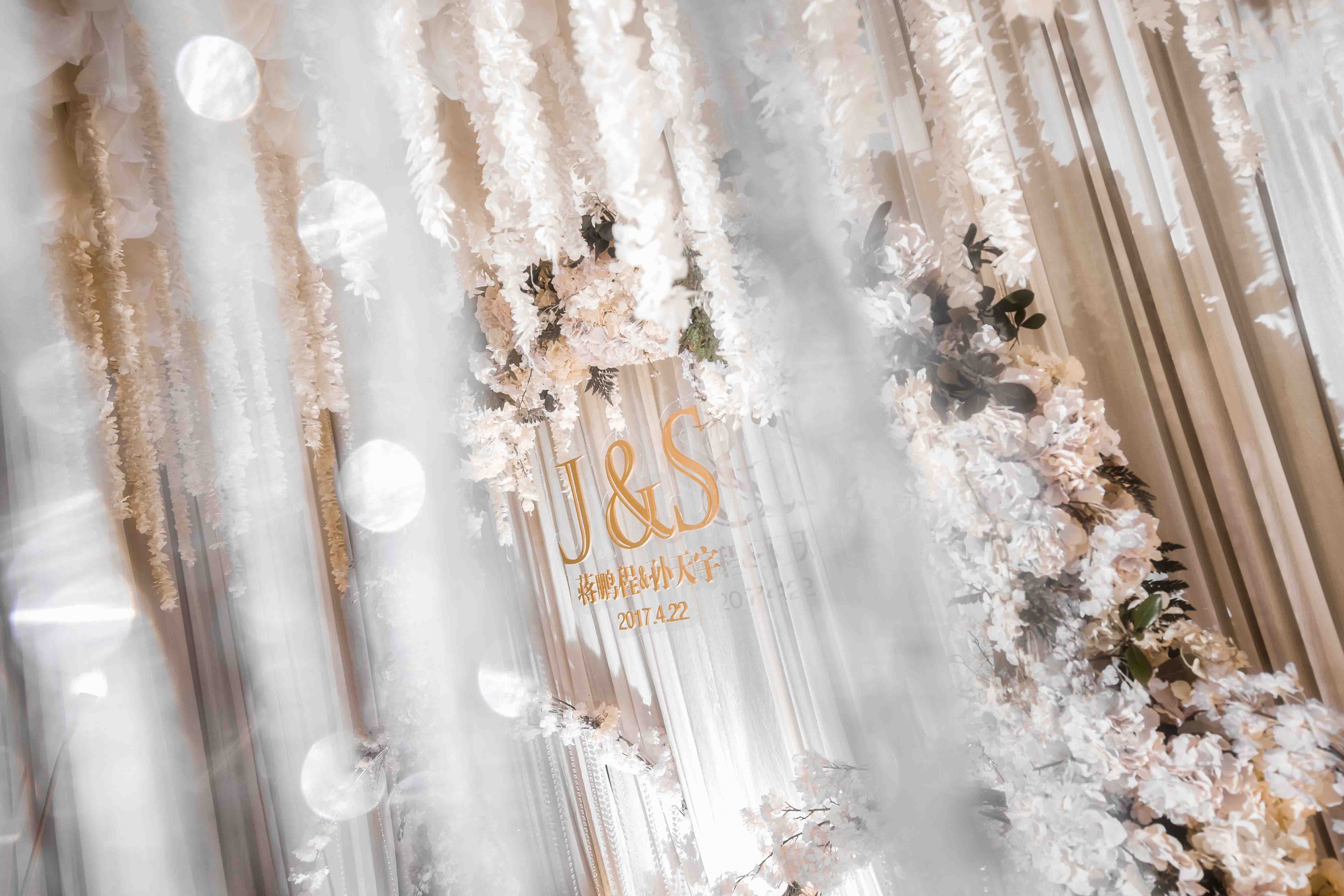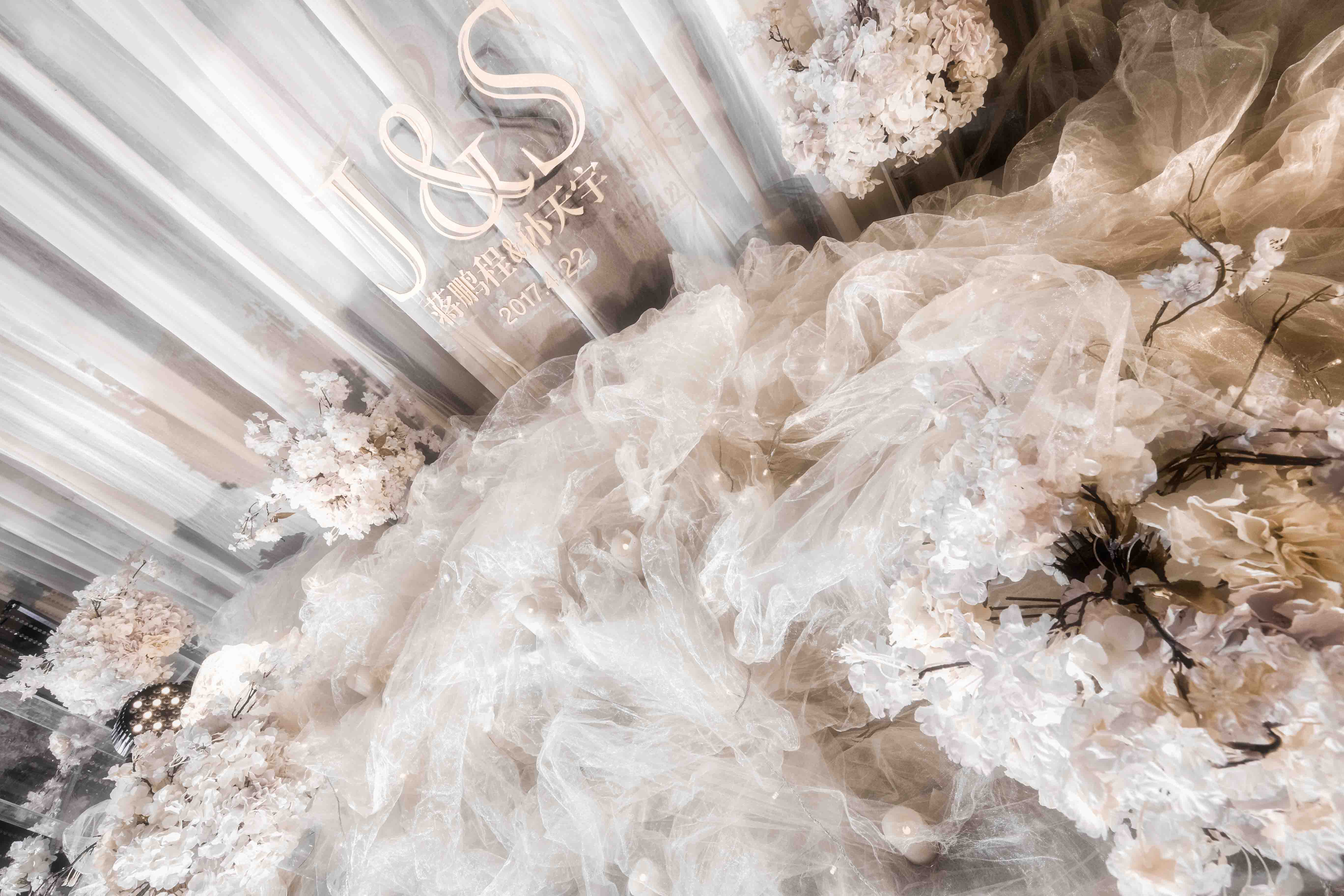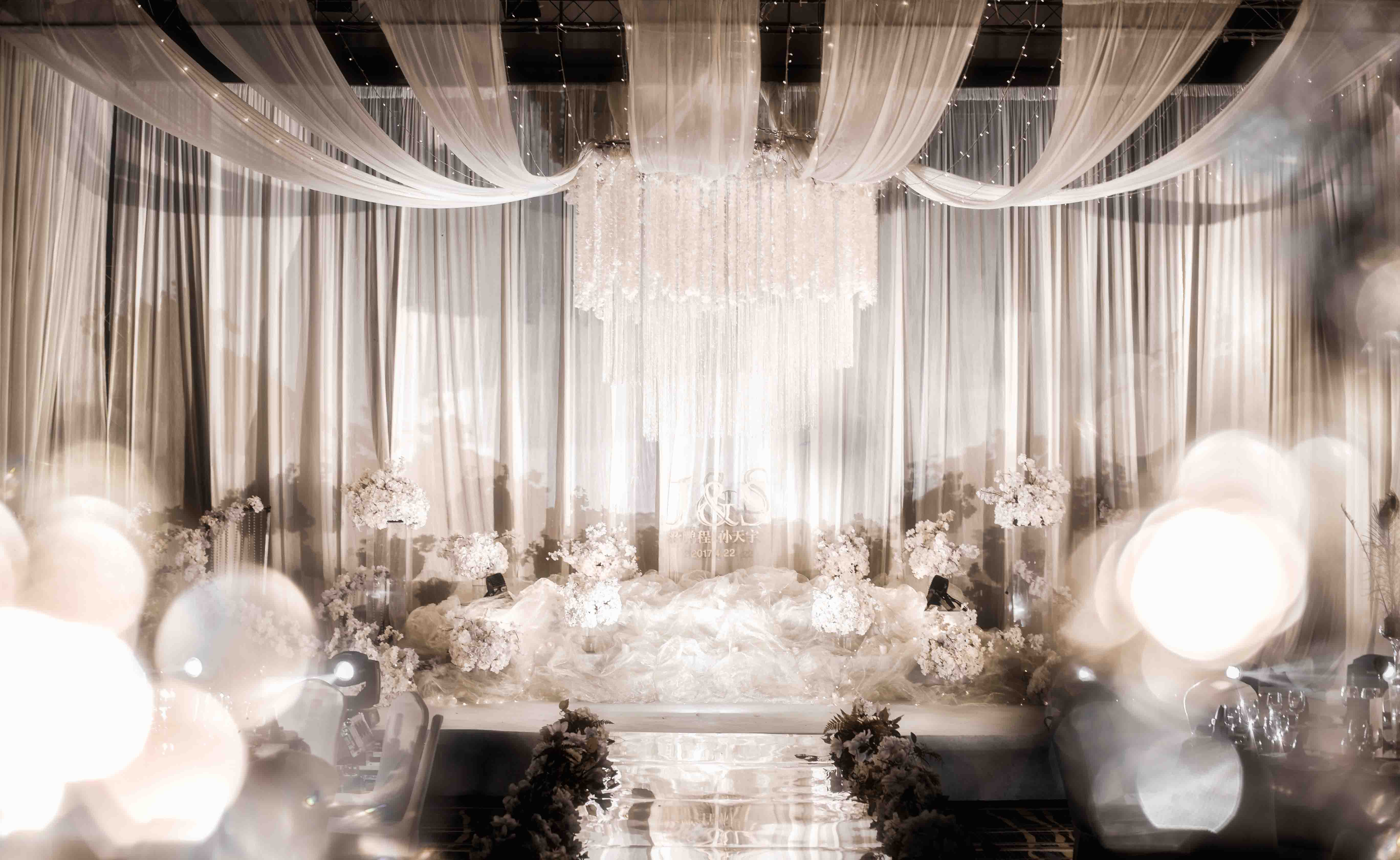 《婚礼灵感》:披一袭水晶曼丽的豪奢与迷蒙,演绎着盛世香槟与仙气藤蔓的奇迹,缓缓而来,似真似幻。 《婚礼特色》:香槟,白色,帷幔吊顶,浪漫 《婚礼场地》:杭州太虚湖酒店